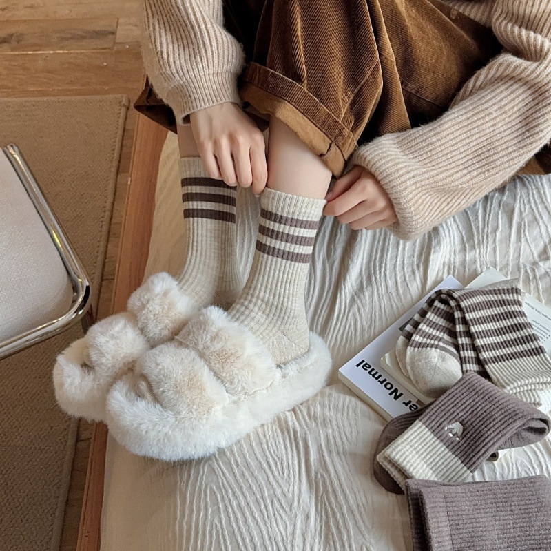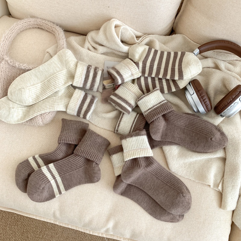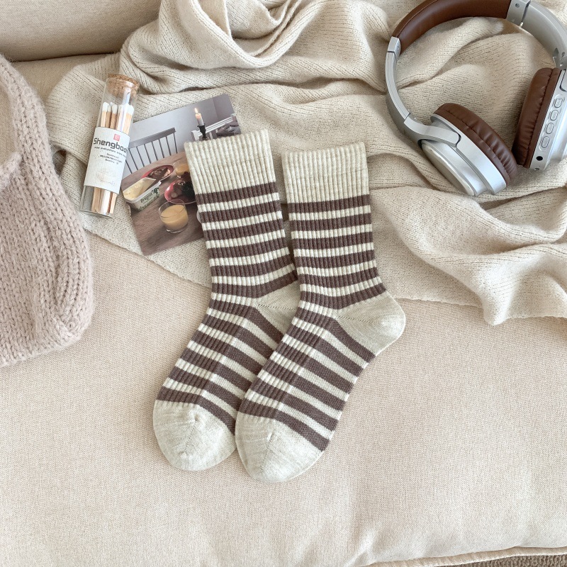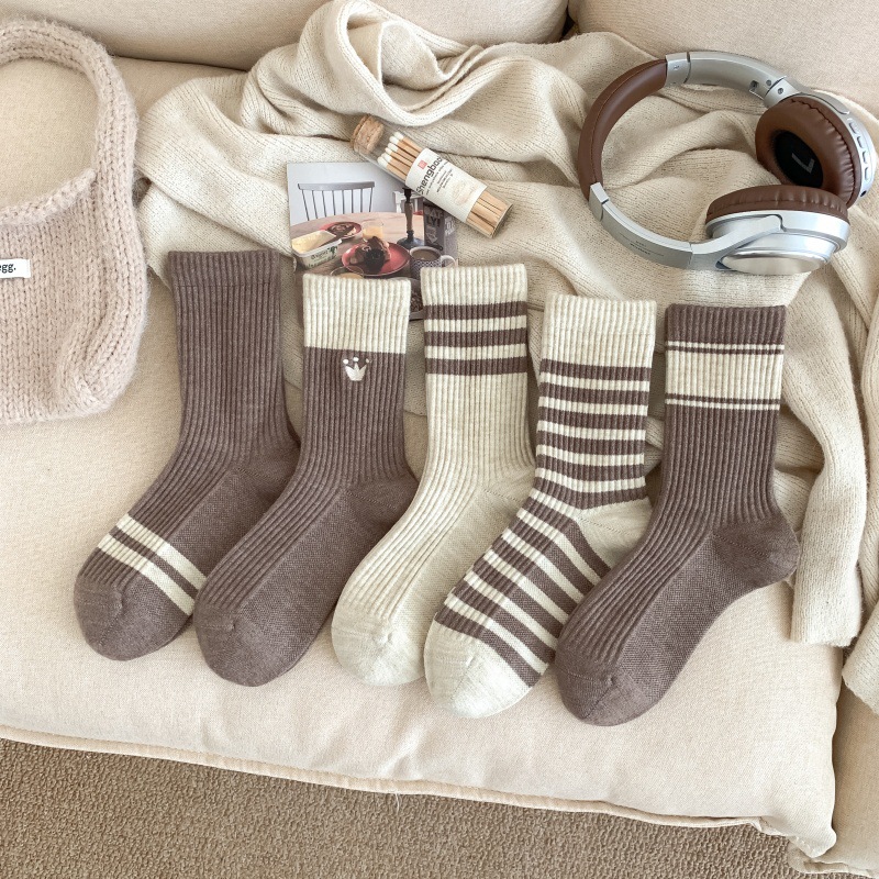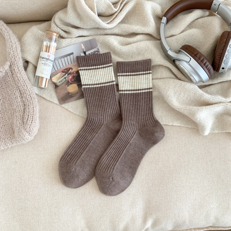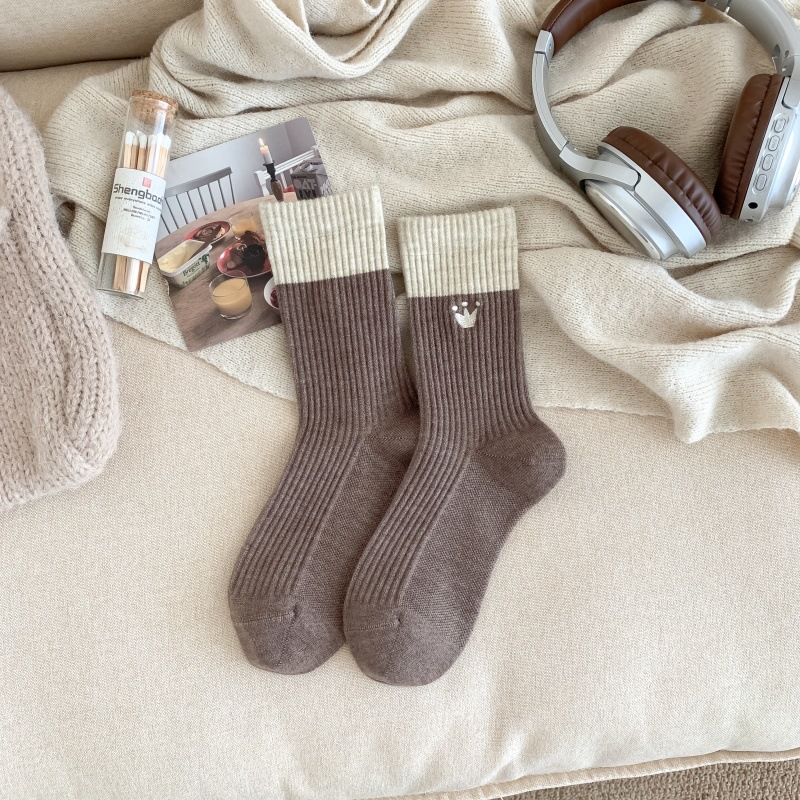 24 년 된 일본식 뒤꿈치 자수 두꺼운 따뜻한 모조 더블 바늘 안티 필링 스크럽 양 양말 다크 브라운 스타일 여성용 미드 튜브 양말