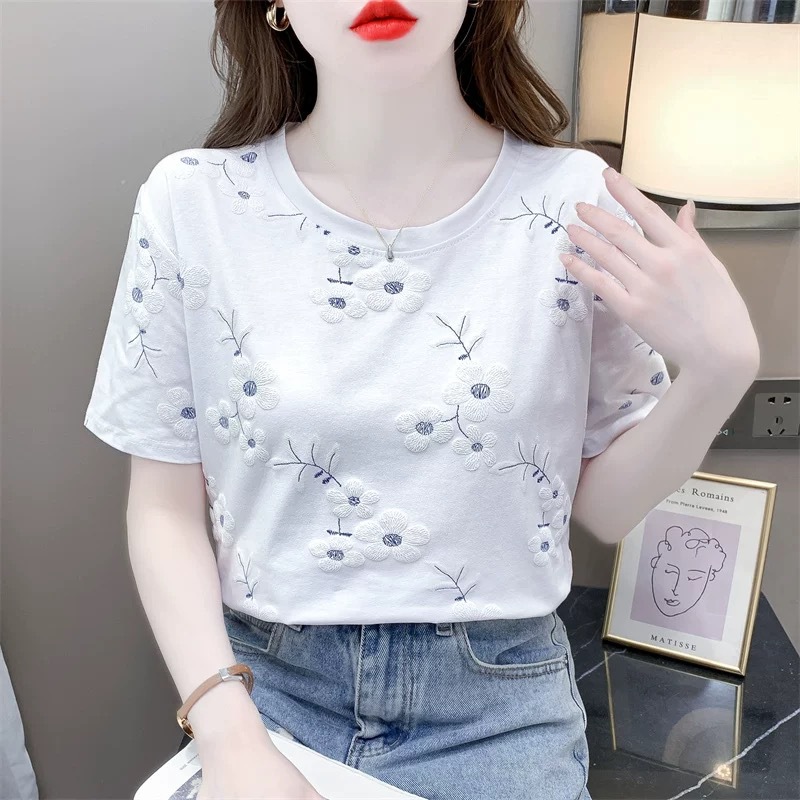 반팔 티셔츠 여성용 여름 화이트 플러스 사이즈 새로운 한국식 느슨한 라운드 넥 트렌디 반소매 이너 탑