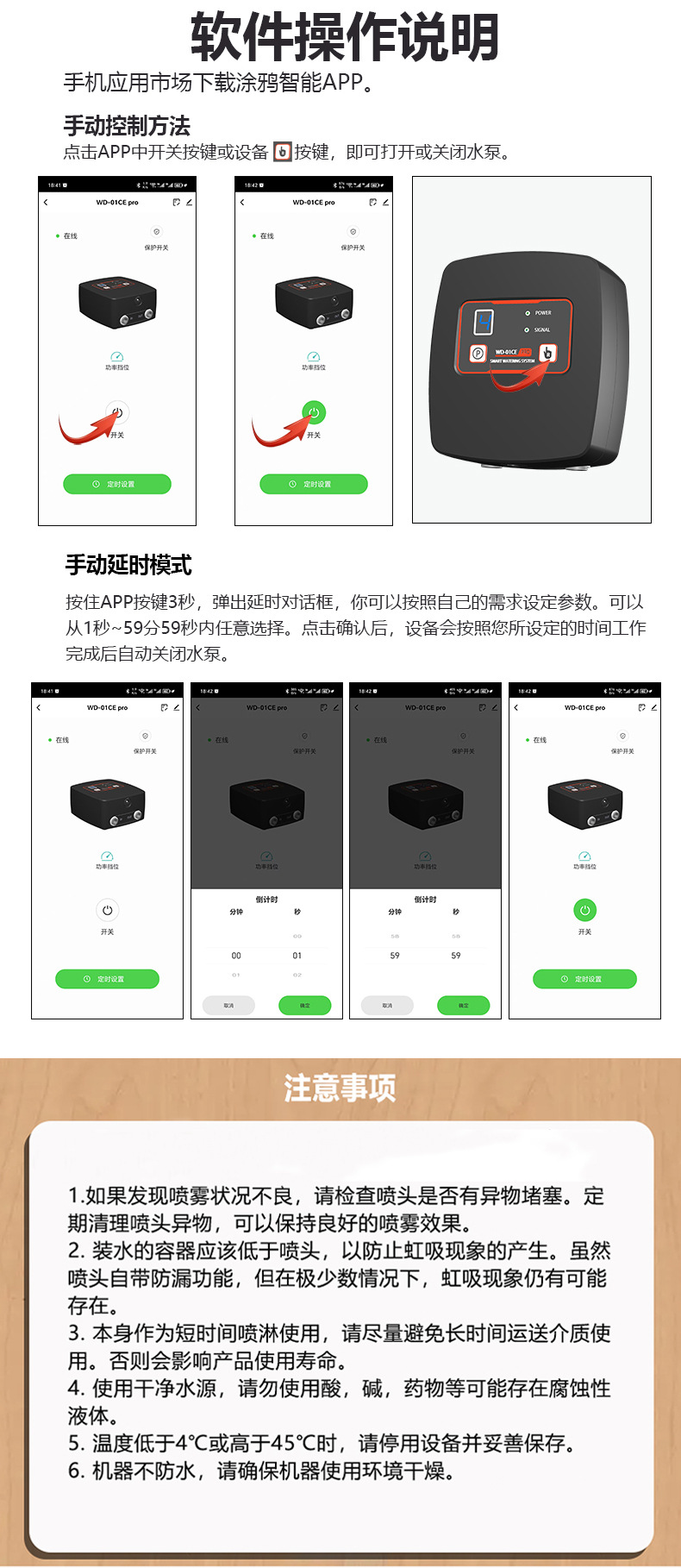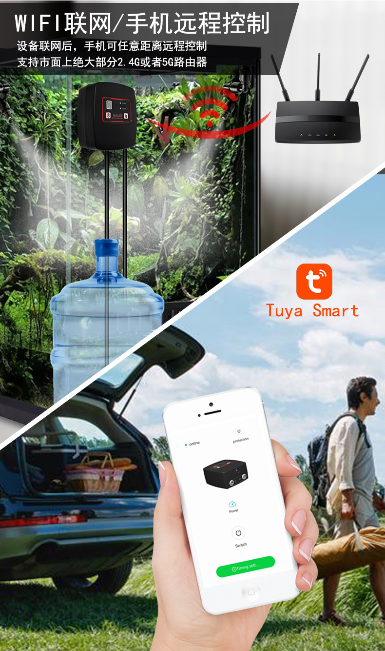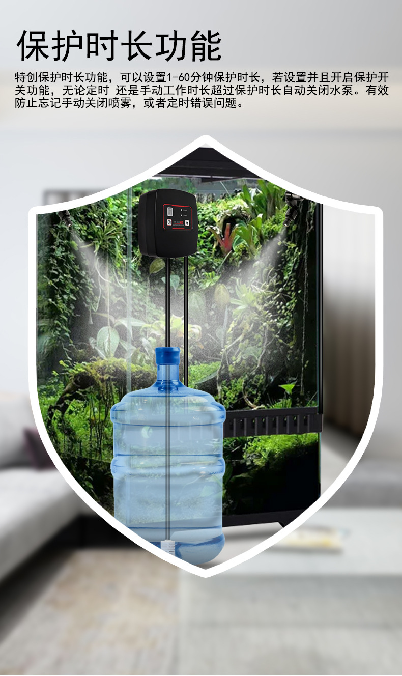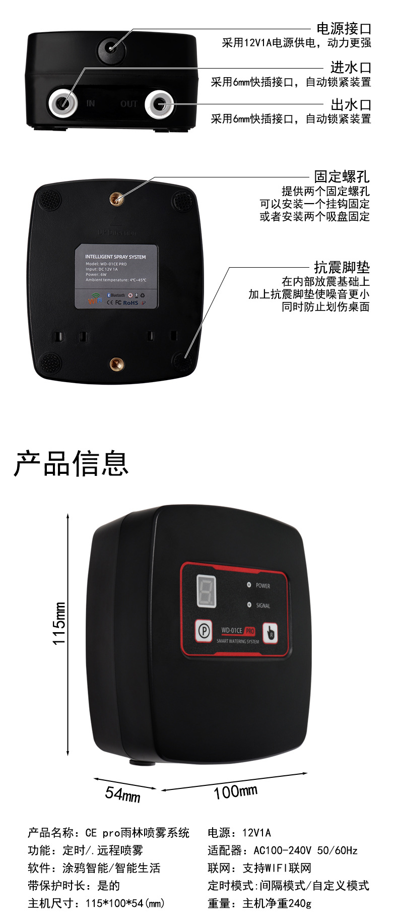 1.升级大功率高寿命水泵,最大负载4-5组雾化喷头;2.优化喷头结构,雾化更好,