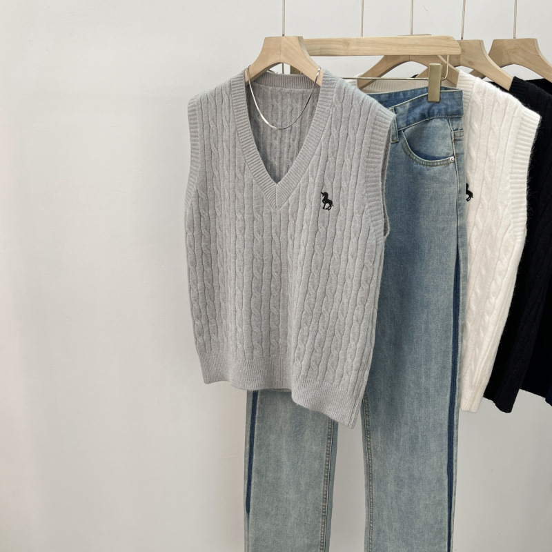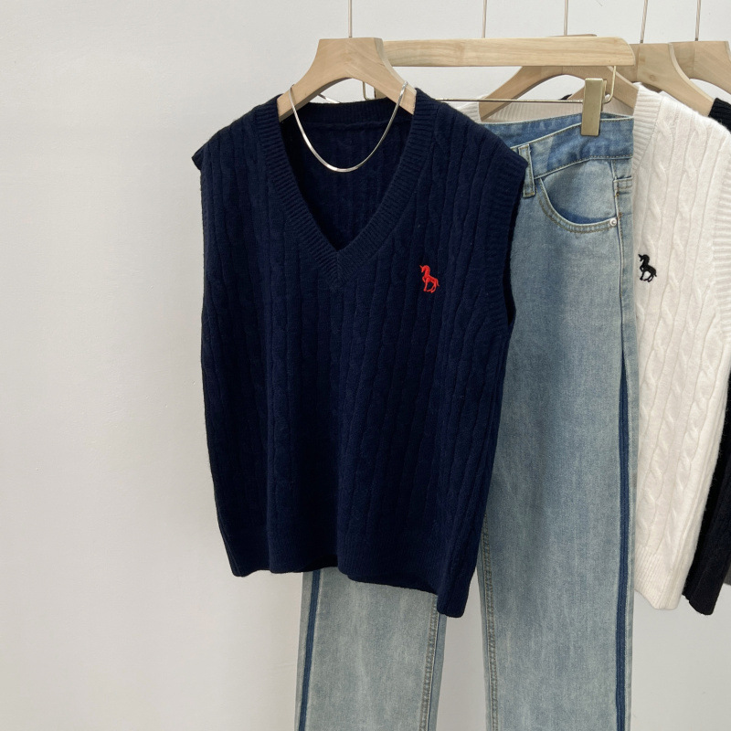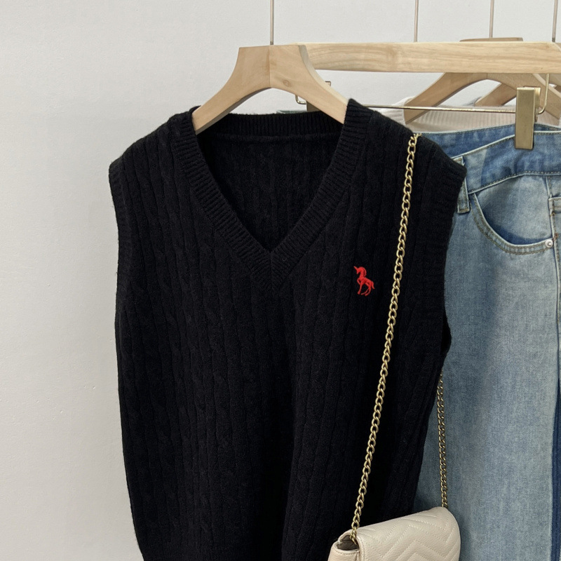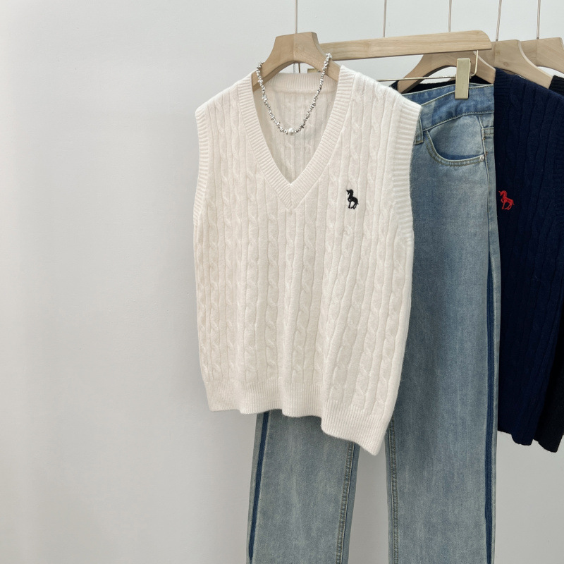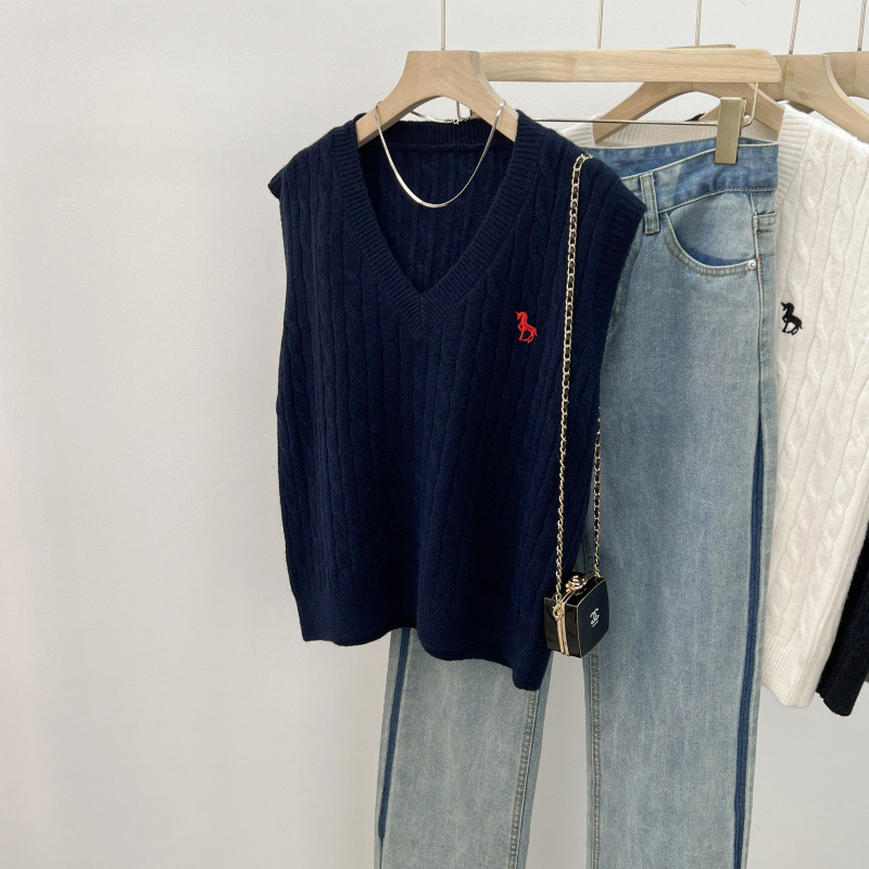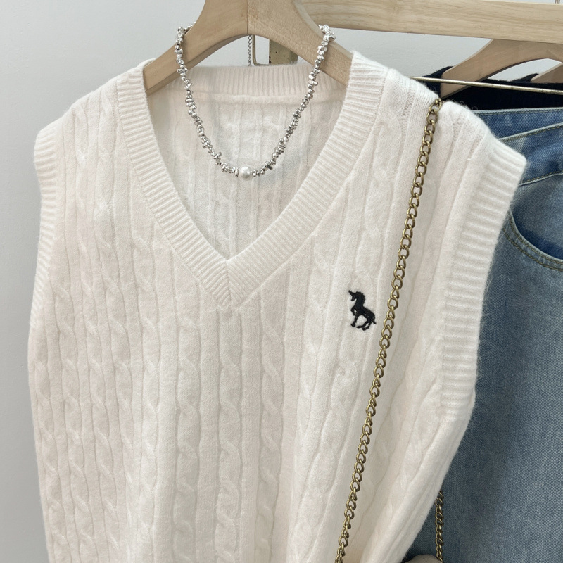 일본 스타일 작은 자수 트위스트 V 넥 니트 스웨터 조끼 여성의 가을 스택 느슨한 민소매 스웨터 외부 탑