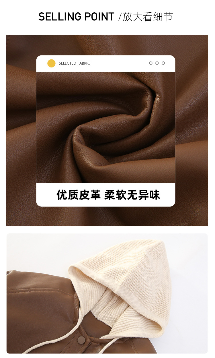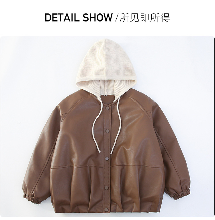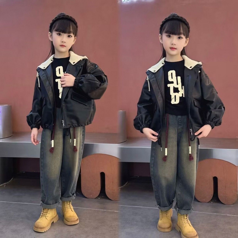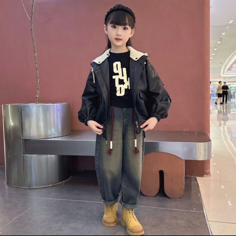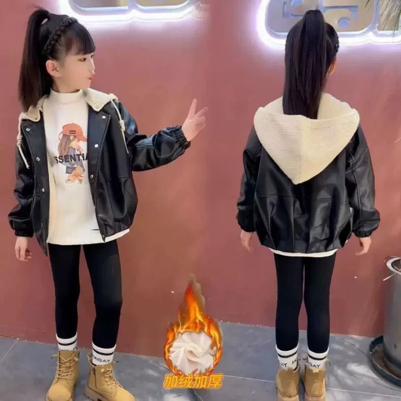 소녀 가죽 자켓 가을과 겨울 2024 새로운 어린이 중 큰 어린이 두꺼운 복고풍 분리 모자 최고 유행 재킷스토어 가기
