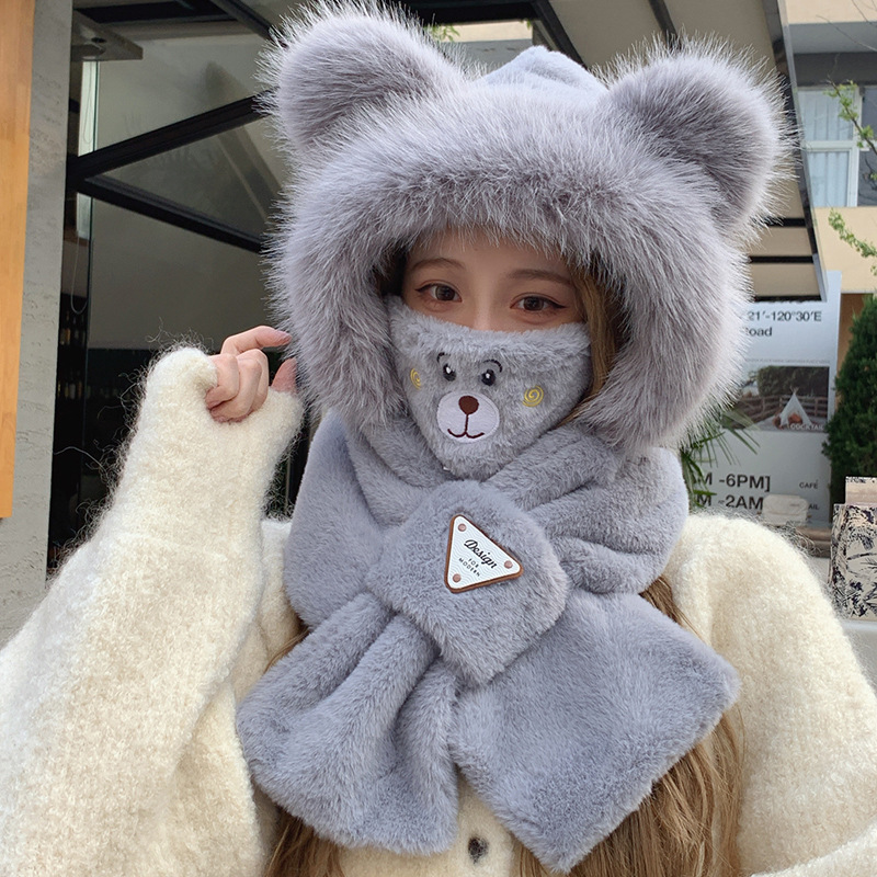 • 시옹바오 모피 모자 + 따뜻한 벨벳 마스크 - 따뜻한 회색