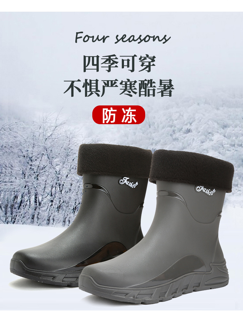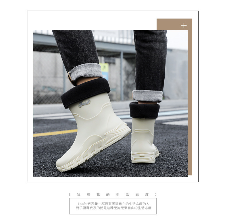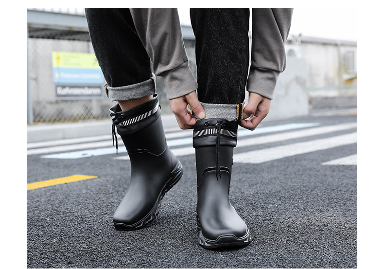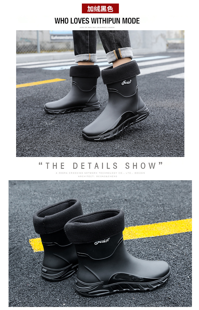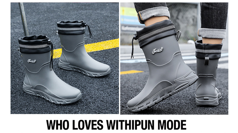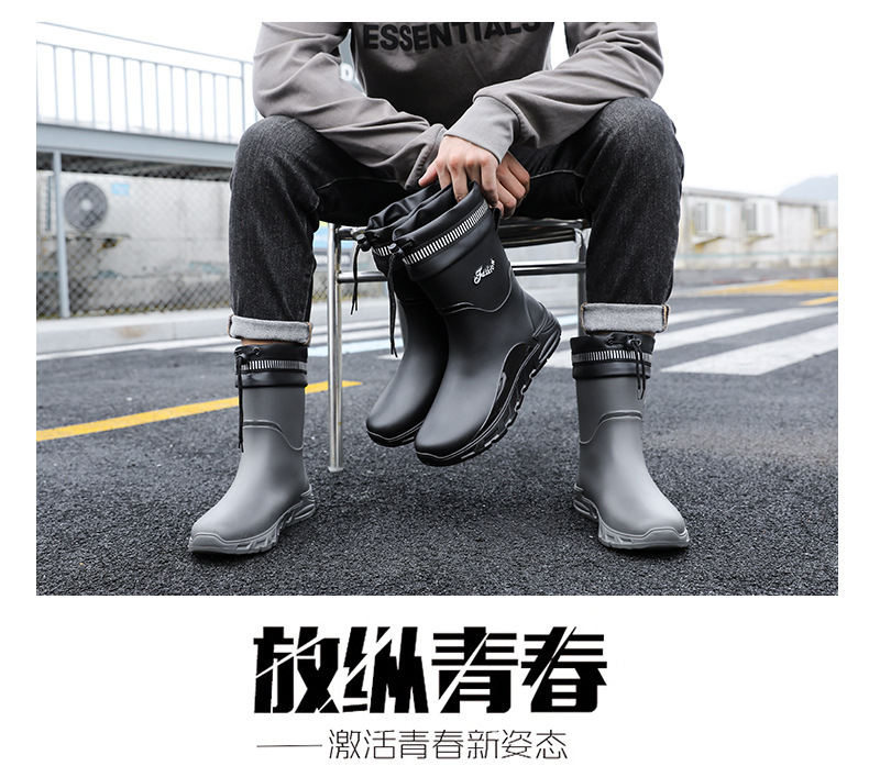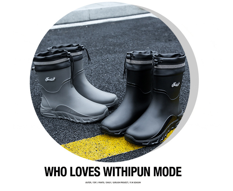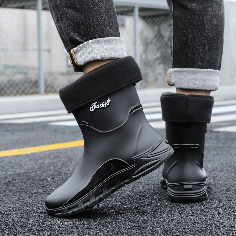 새로운 장화 남성용 미끄럼 방지 남성용 기모 고무 신발 주방 내마모성 낚시 방수 장화 패션 워터 슈즈