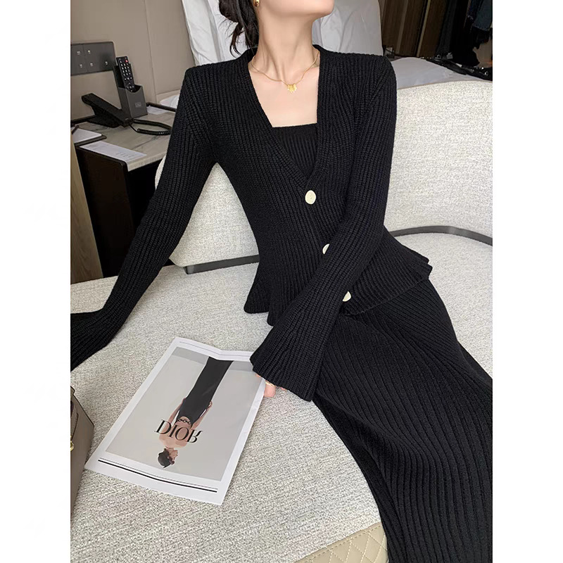 검은 니트 슬링 원피스 여성의 가을과 겨울 2024 새로운 프랑스 스타일 우아한 슬리밍 스웨터 원피스 투피스 세트