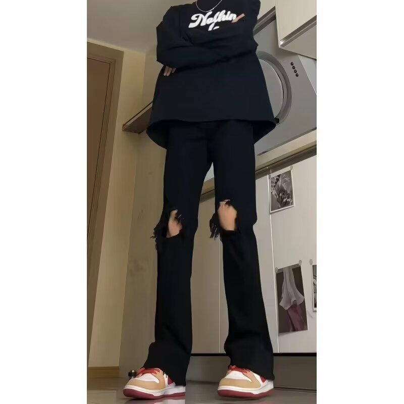 미국식 하이 스트리트 내셔널 패션 브랜드 청바지 레트로 스트레이트 무릎 찢어진 캐주얼 슬리밍 하이 스트리트 바지 트렌디 바지스토어 가기