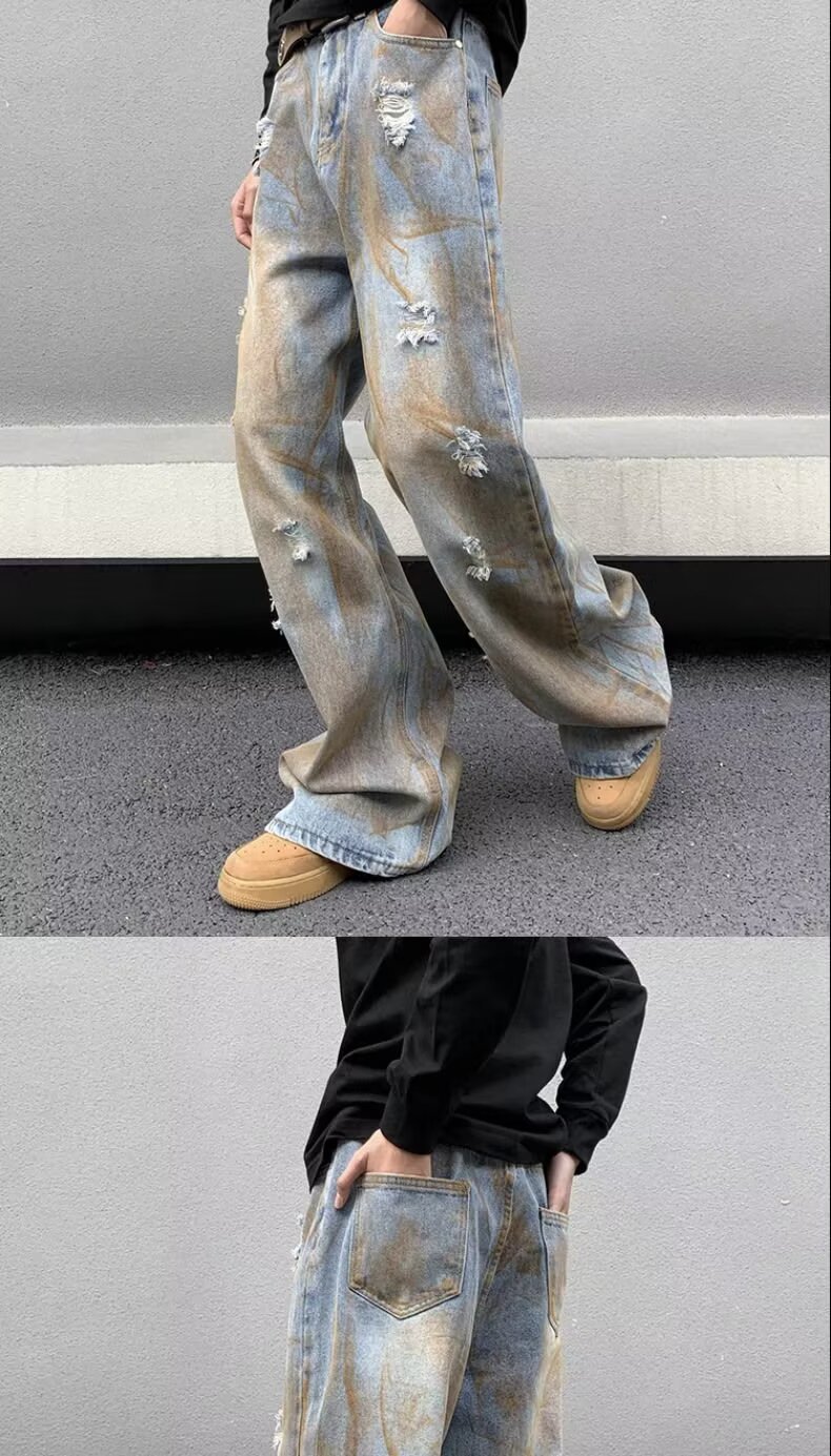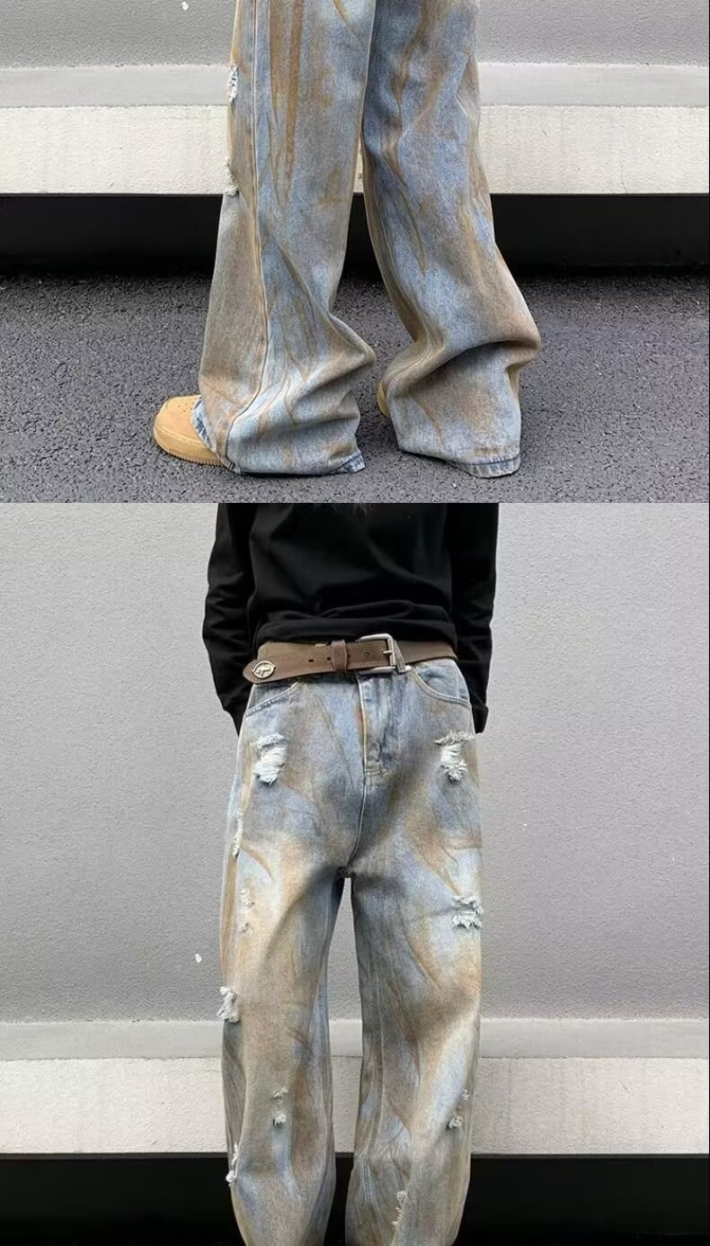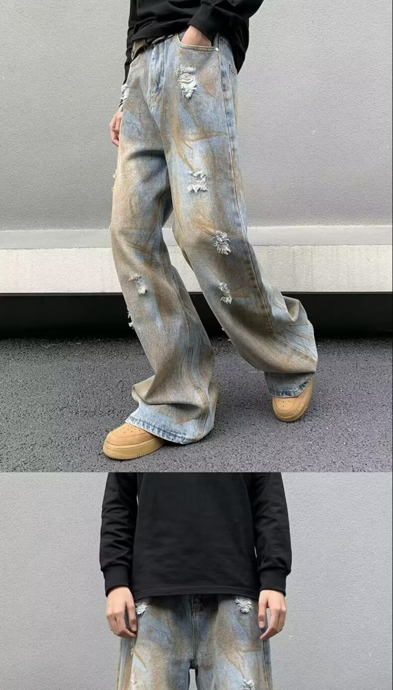 아메리칸 스타일 빈티지 타이-다이 리핑 청바지 남성용 스트레이트 루즈 워시 올드 하이 스트리트 팬츠 트렌디 브랜드 캐주얼 바지스토어 가기