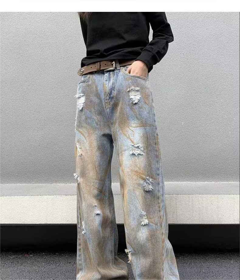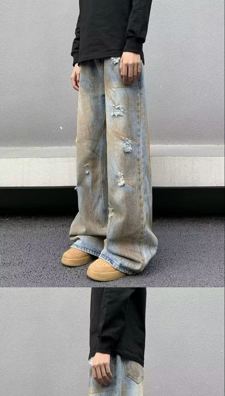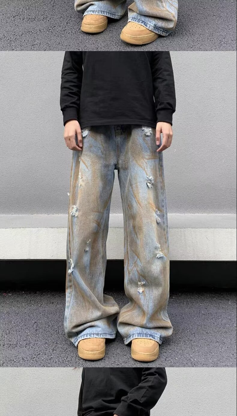아메리칸 스타일 빈티지 타이-다이 리핑 청바지 남성용 스트레이트 루즈 워시 올드 하이 스트리트 팬츠 트렌디 브랜드 캐주얼 바지스토어 가기