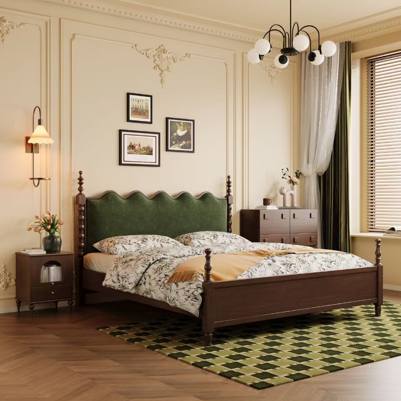 프렌치 레트로 스타일의 마스터 침실 1.8m 더블 침대, 미드센추리 스타일의 원목 침대, 그린 컬러의 소형 아파트용 수납형 소프트 침대