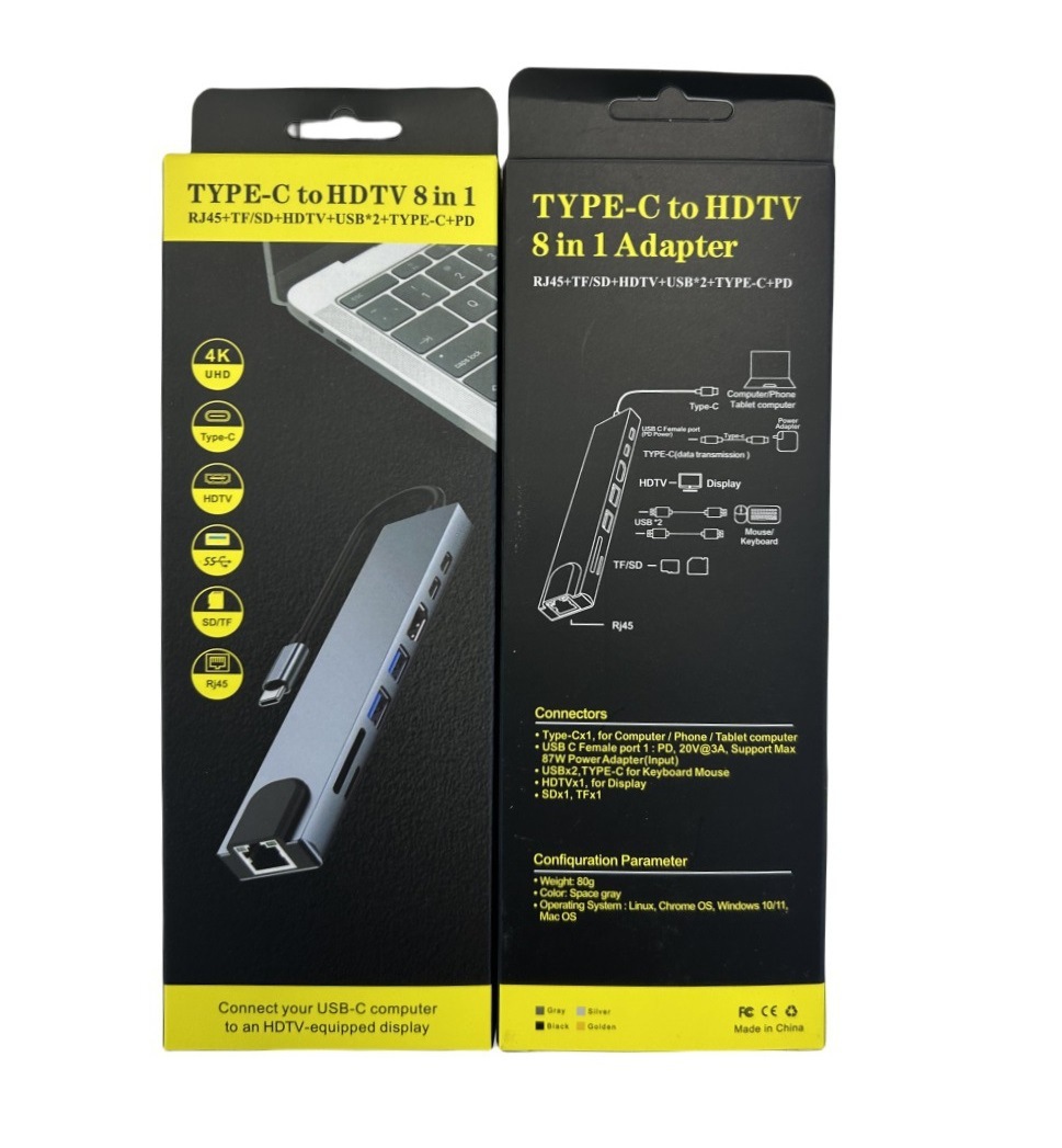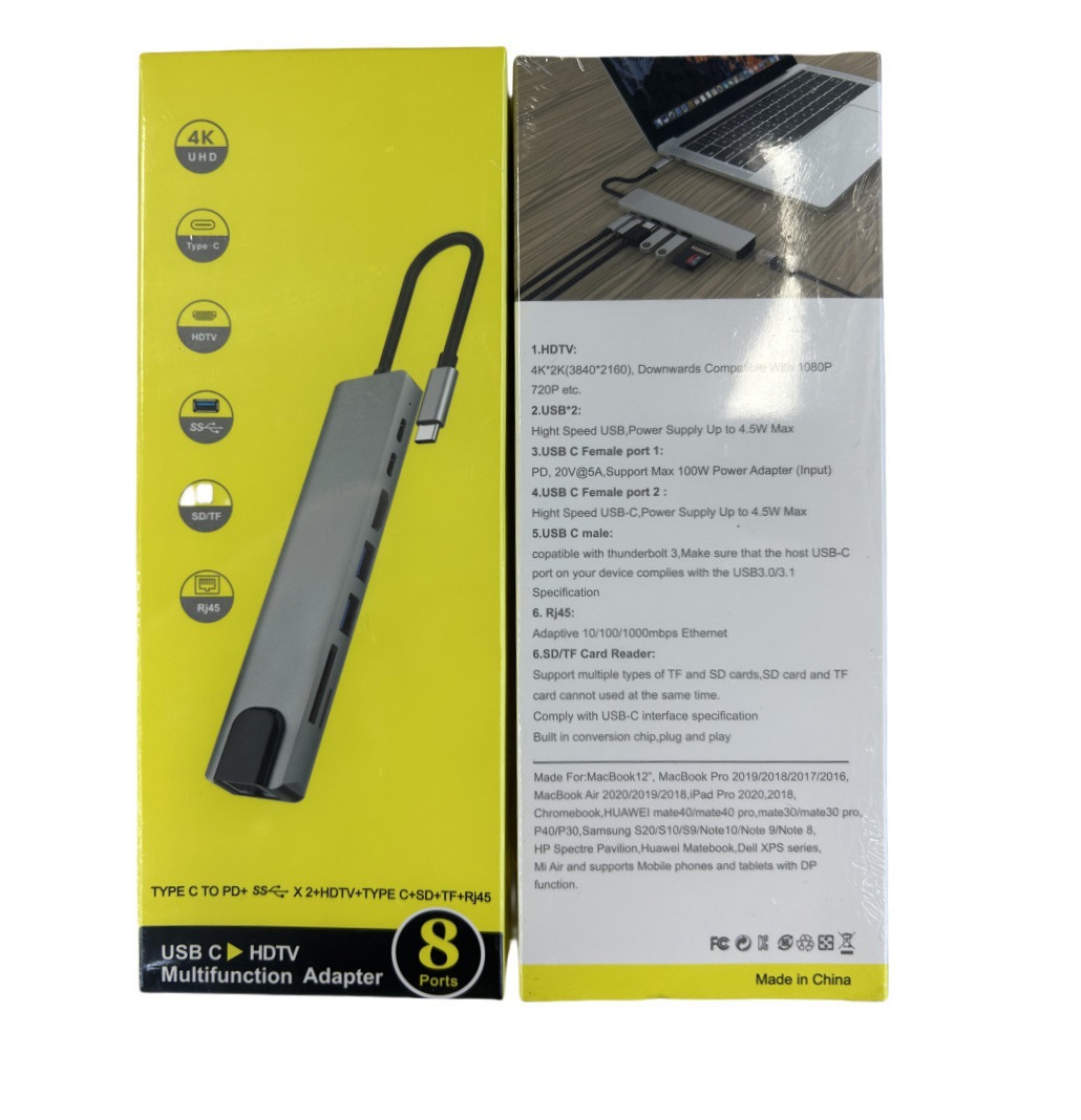 产品名称:Type-C to PD+USB3.0*2+SD+TF+HDMI+RJ45+type-c 扩展坞 (8 in 1)