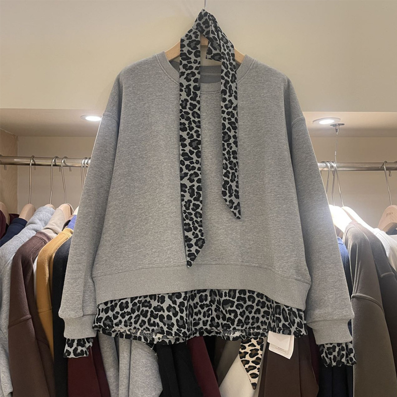 한국 스타일 게으른 스타일 레오파드 무늬 바느질 기모 땀 여자 가을과 겨울 새로운 느슨한 긴팔 탑 하이 엔드 올매치