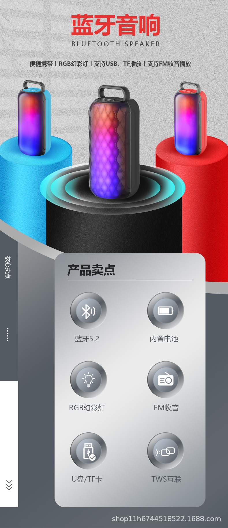 蓝牙功能,MIC输入  幻彩灯,5个按键
