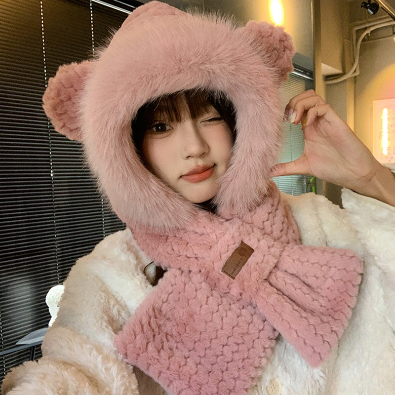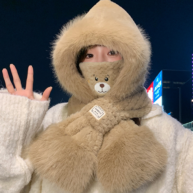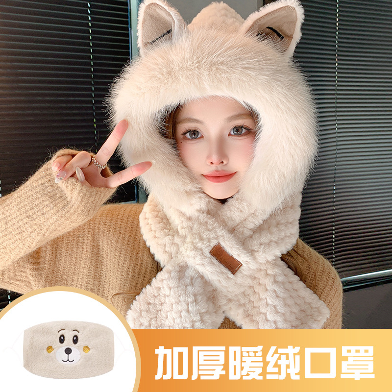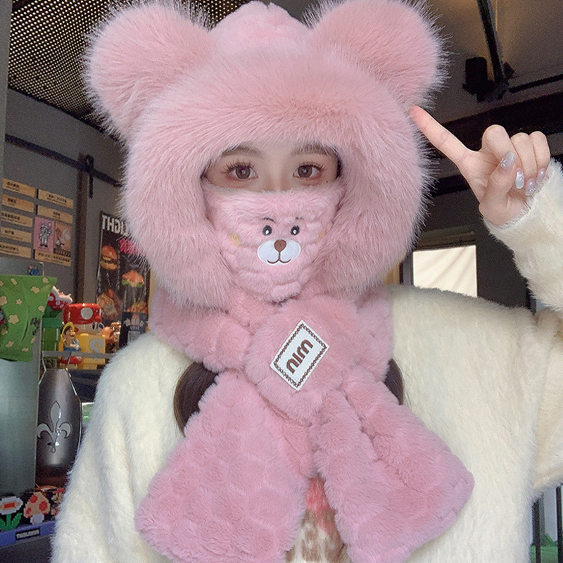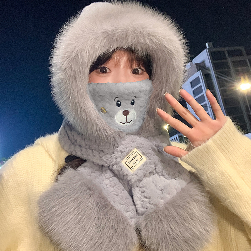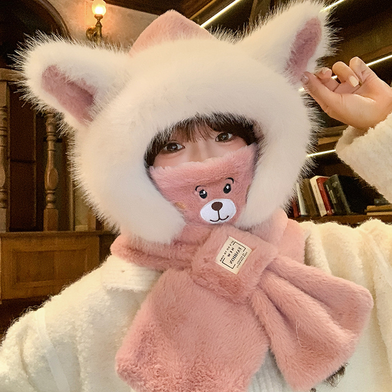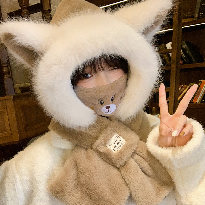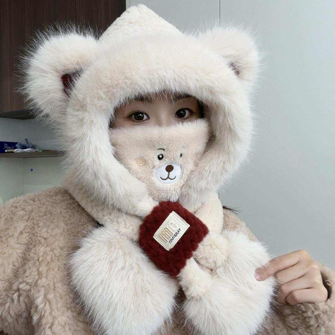 모자와 스카프가 하나로 통합된 여성용 겨울 사이클링 플러시 따뜻한 귀 보호 방풍 및 방한 곰 다용도 스카프 모자 레이펑 모자스토어 가기