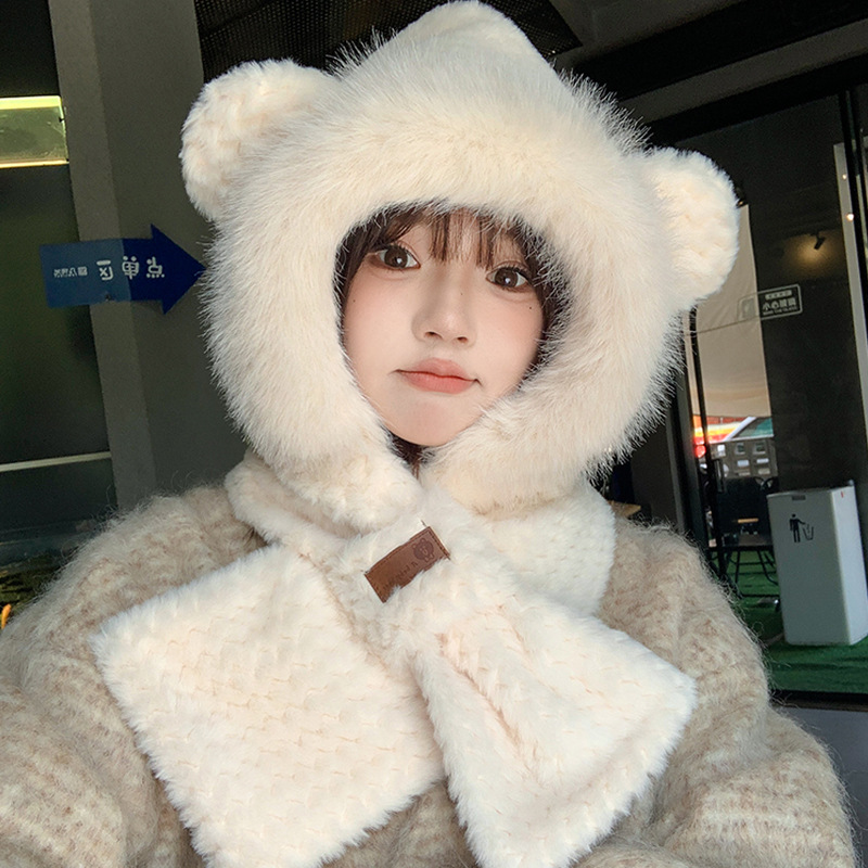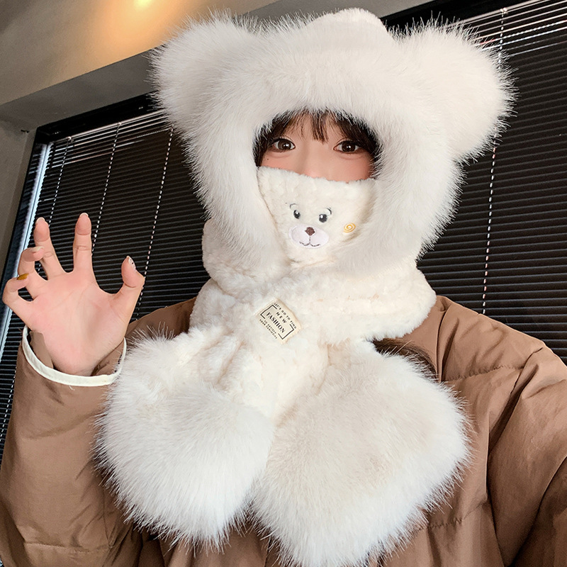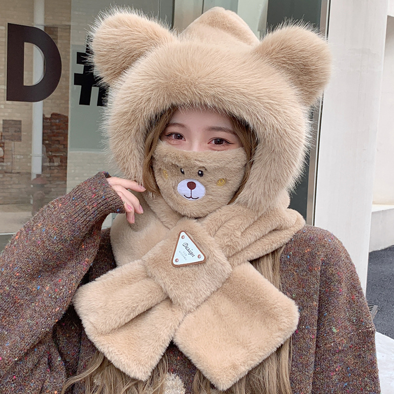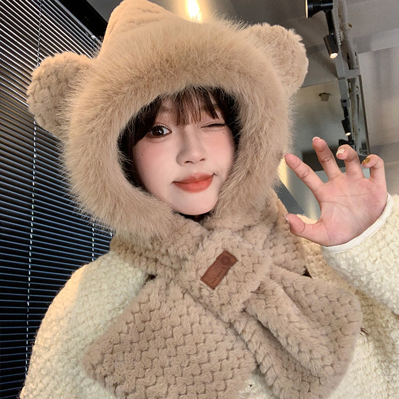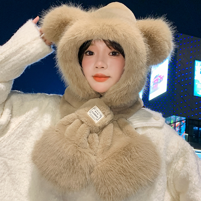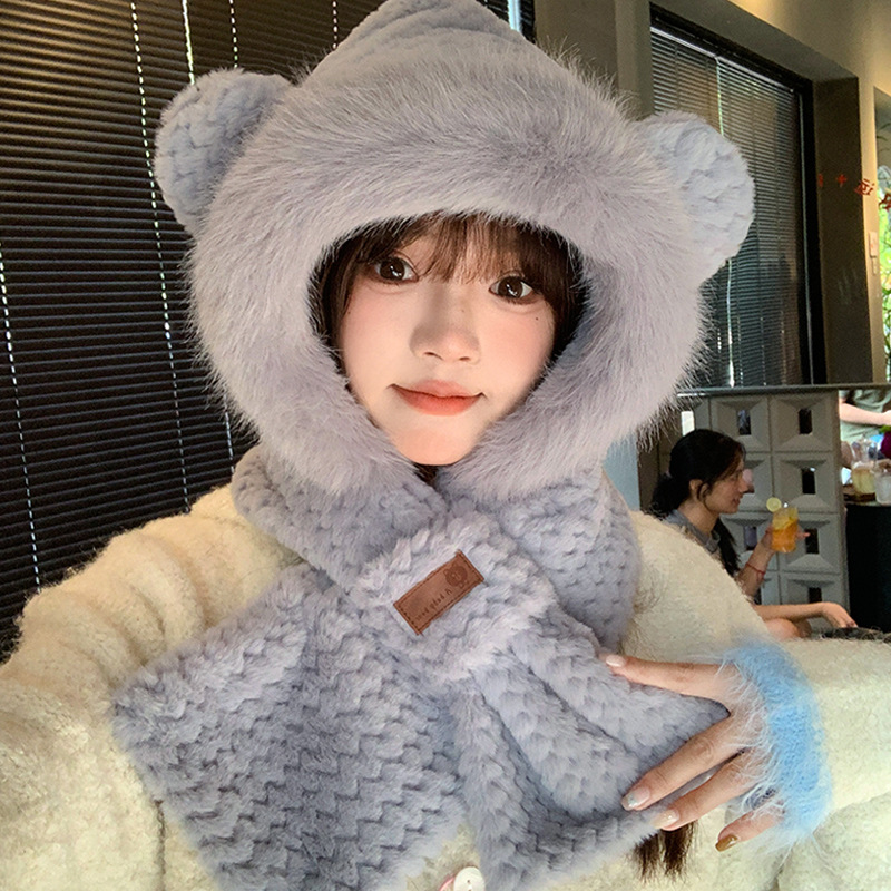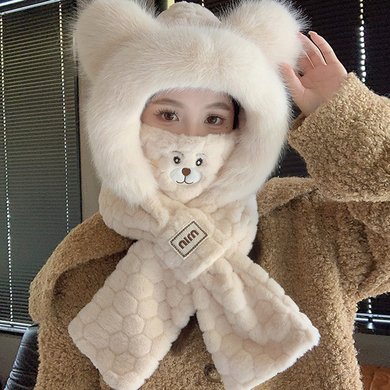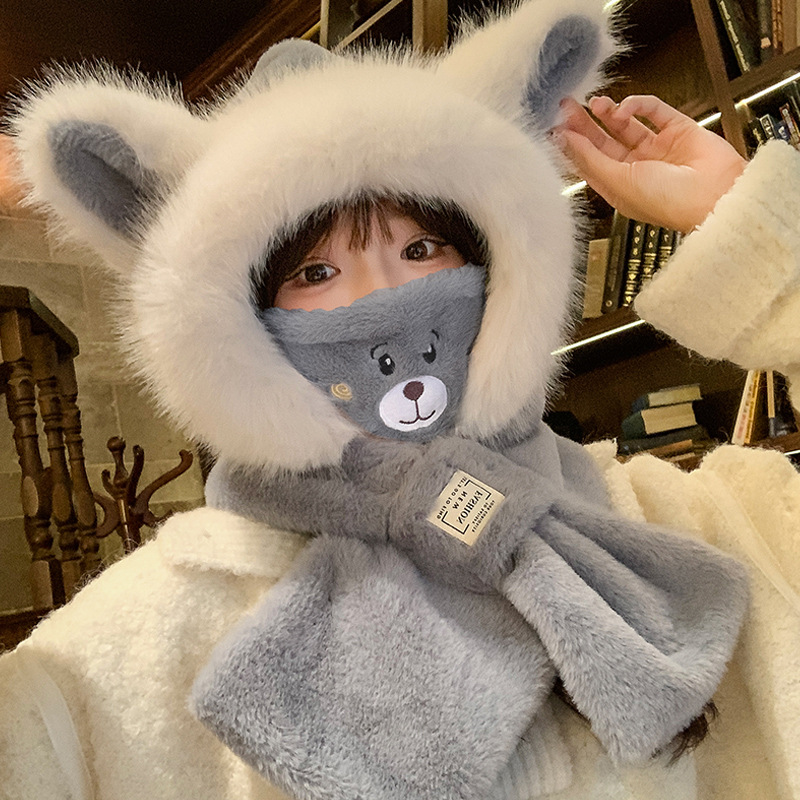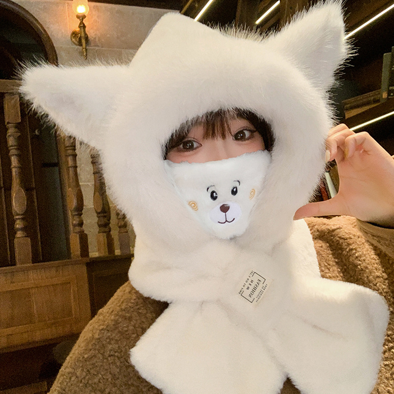 모자와 스카프가 하나로 통합된 여성용 겨울 사이클링 플러시 따뜻한 귀 보호 방풍 및 방한 곰 다용도 스카프 모자 레이펑 모자스토어 가기