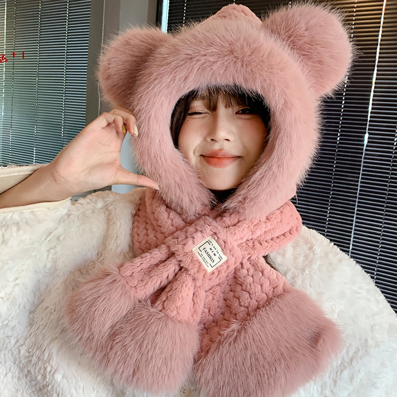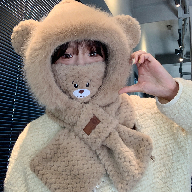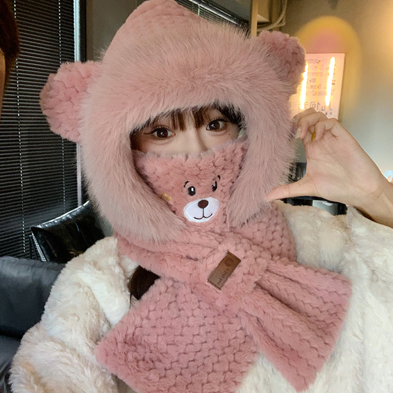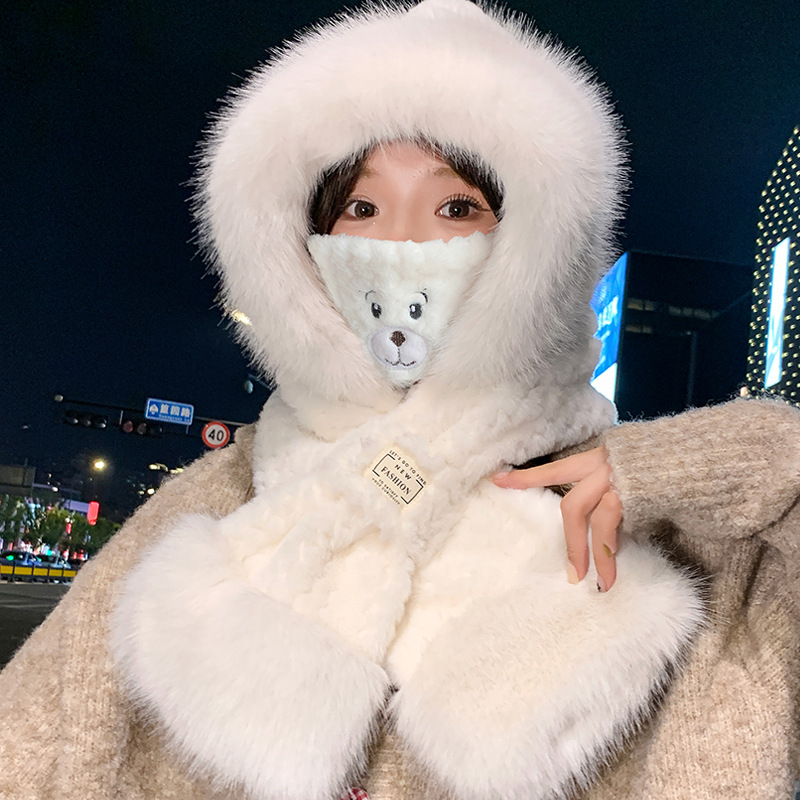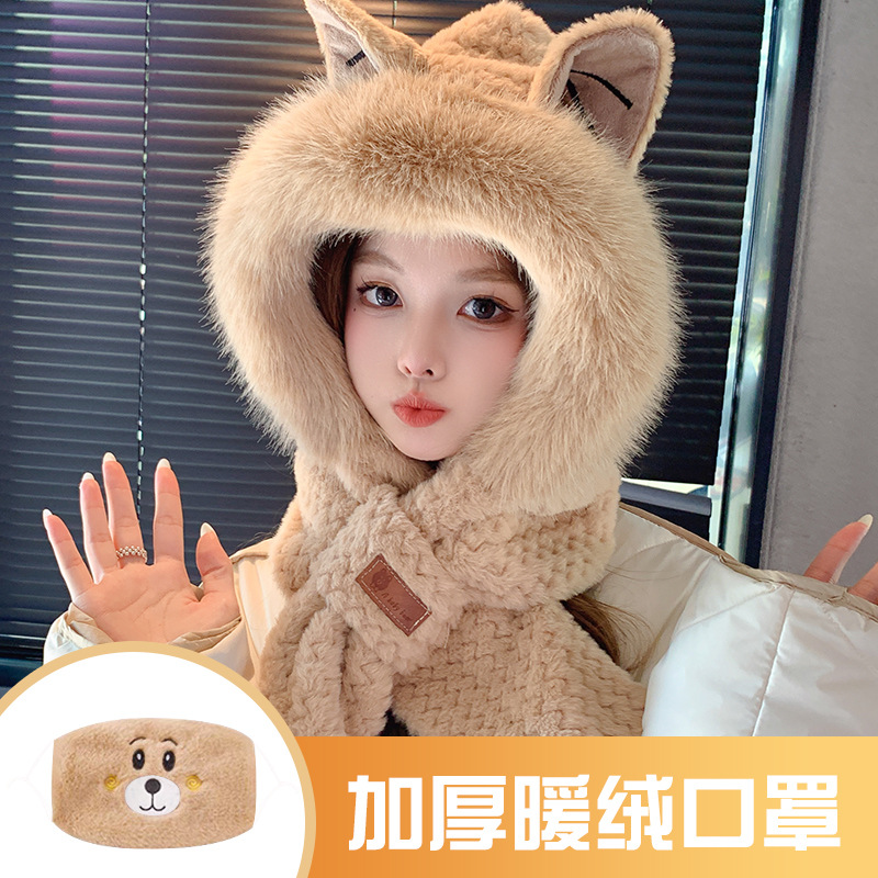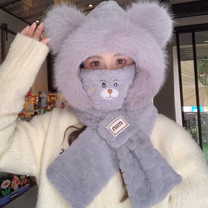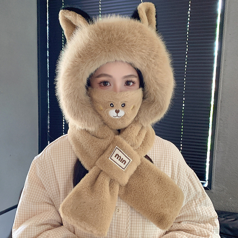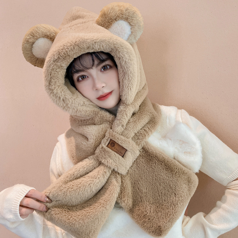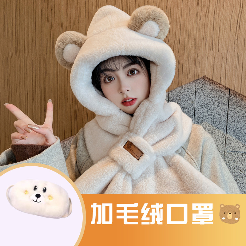 모자와 스카프가 하나로 통합된 여성용 겨울 사이클링 플러시 따뜻한 귀 보호 방풍 및 방한 곰 다용도 스카프 모자 레이펑 모자스토어 가기