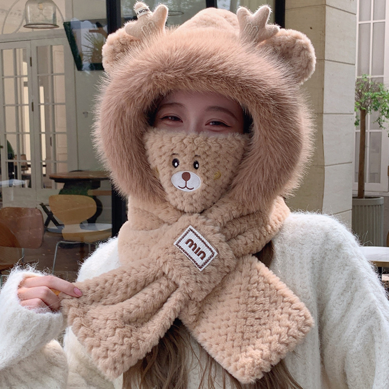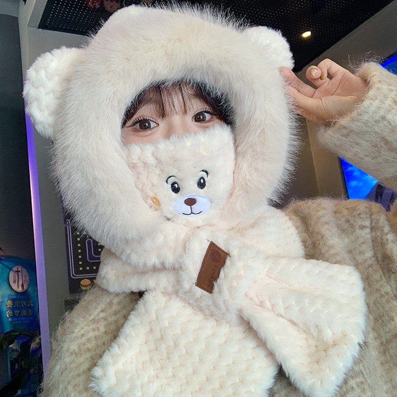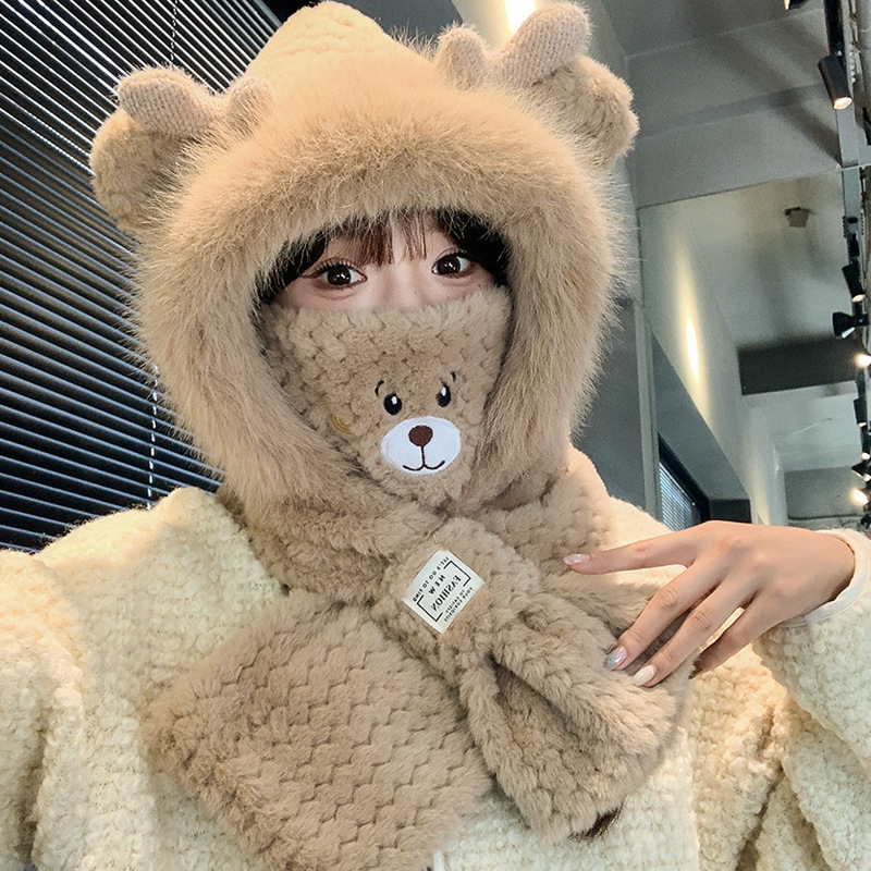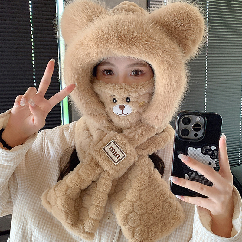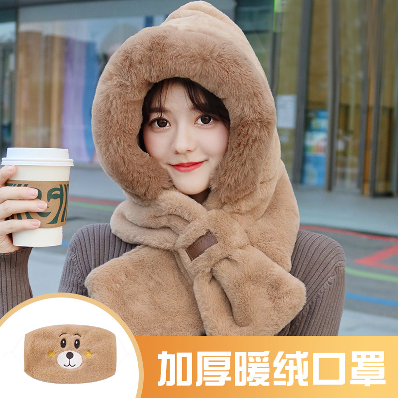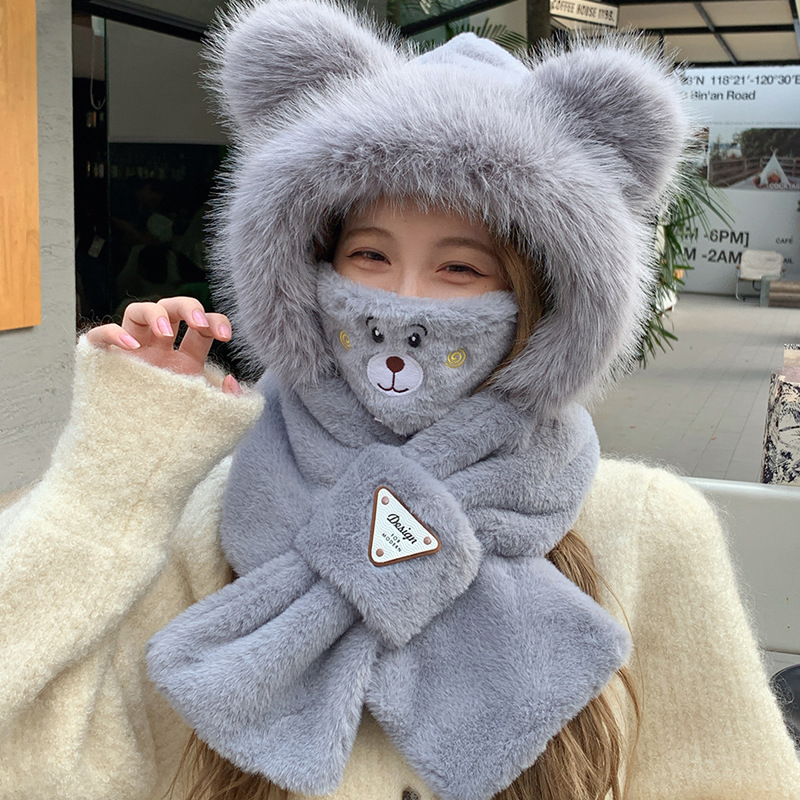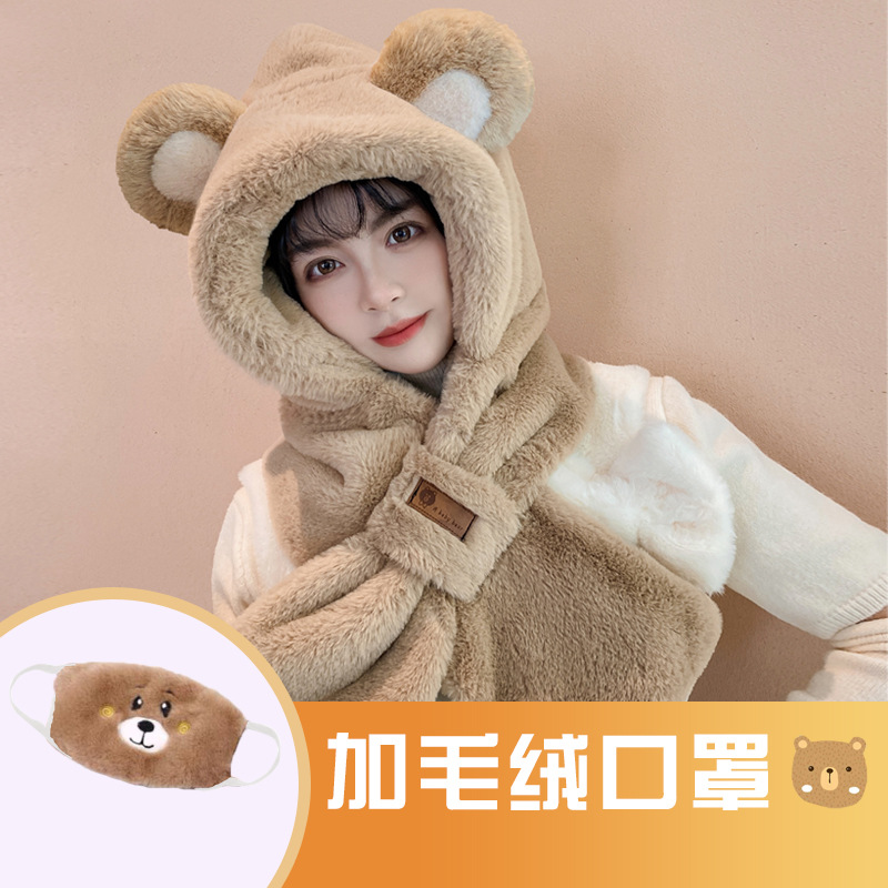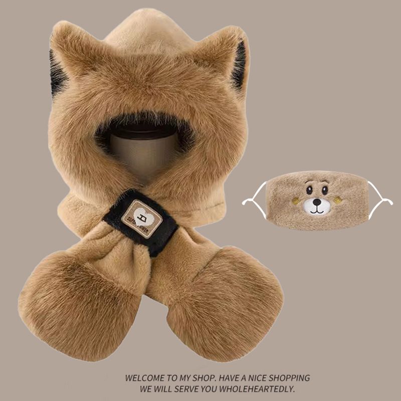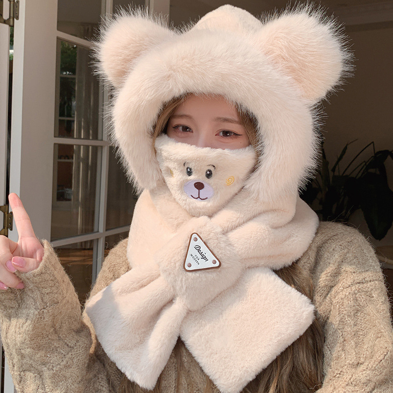 모자와 스카프가 하나로 통합된 여성용 겨울 사이클링 플러시 따뜻한 귀 보호 방풍 및 방한 곰 다용도 스카프 모자 레이펑 모자스토어 가기