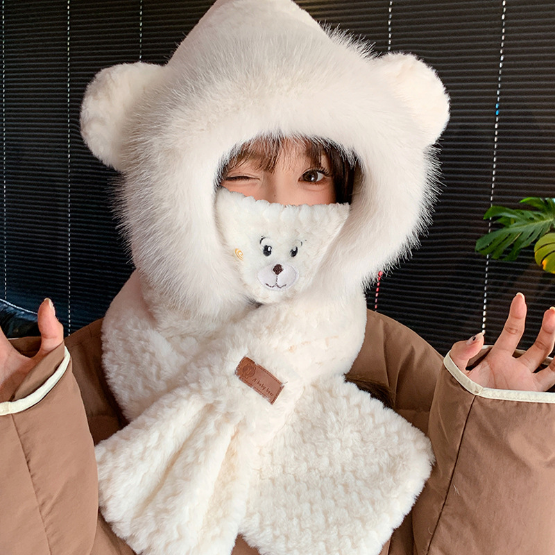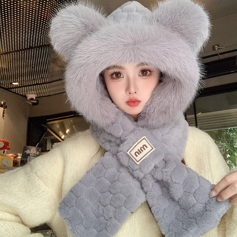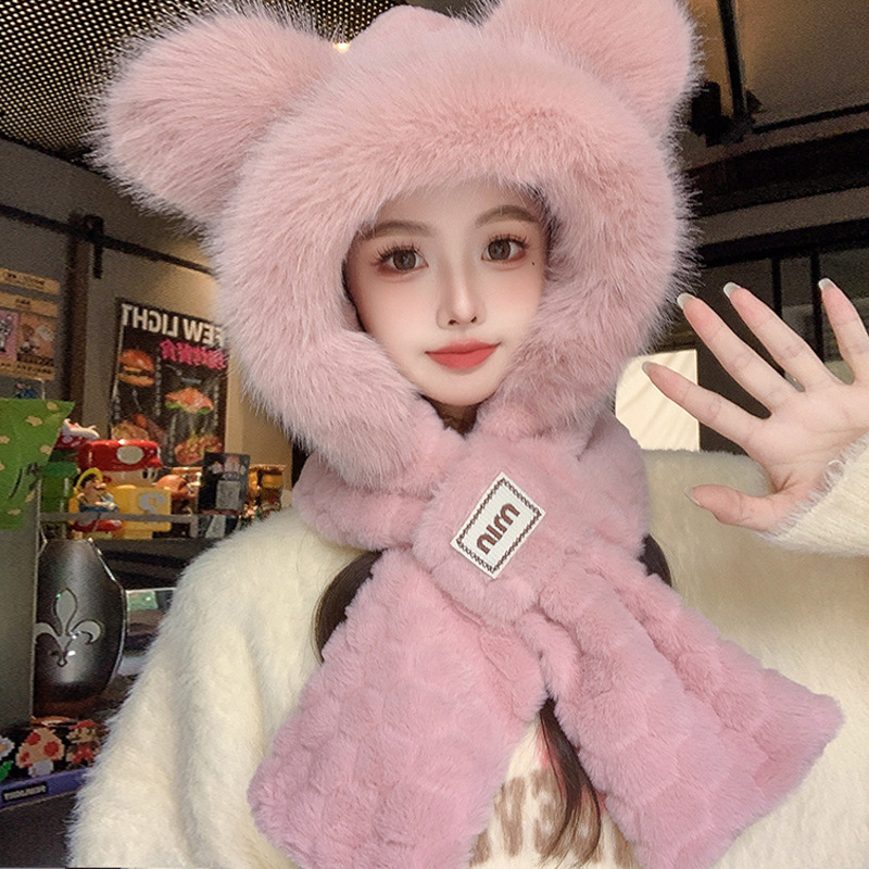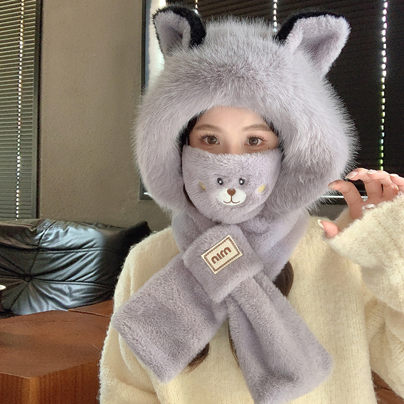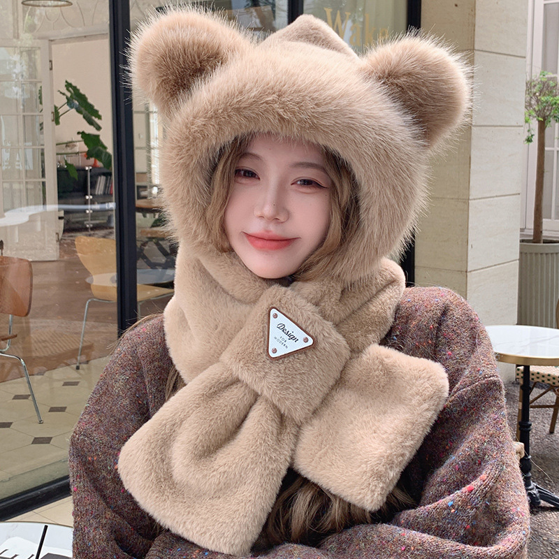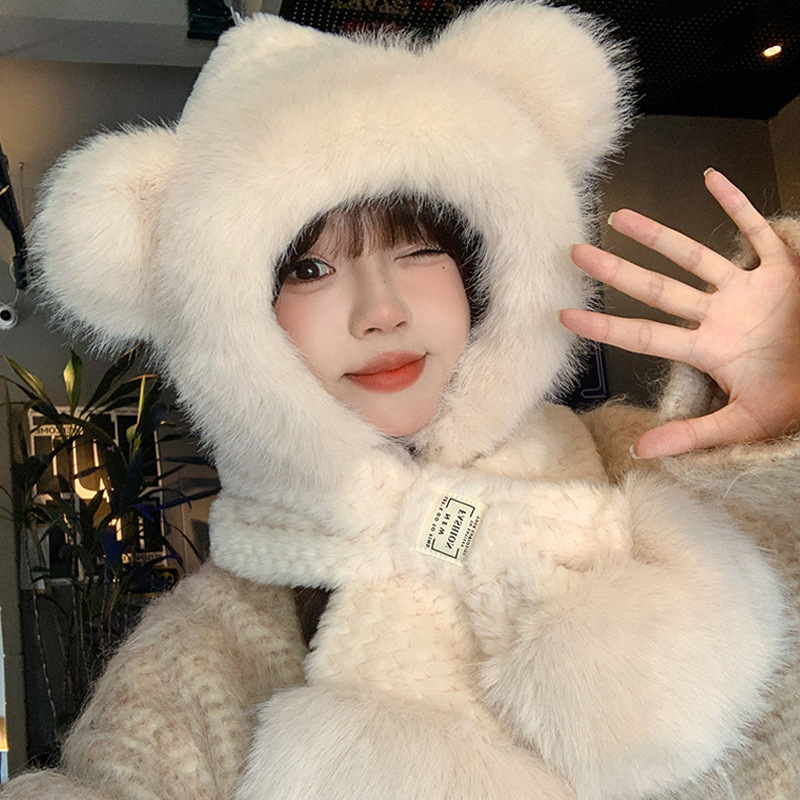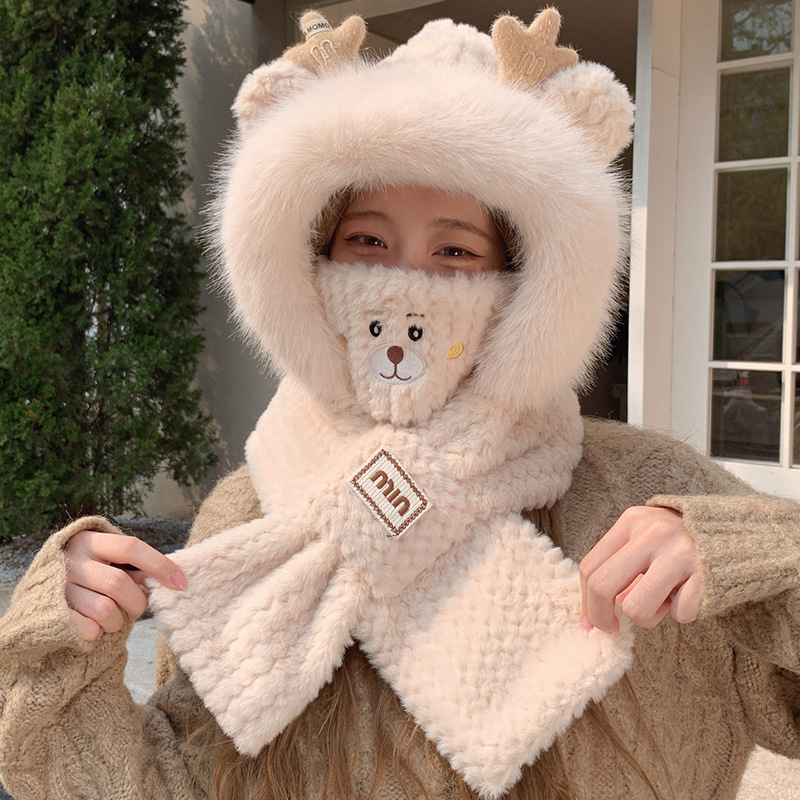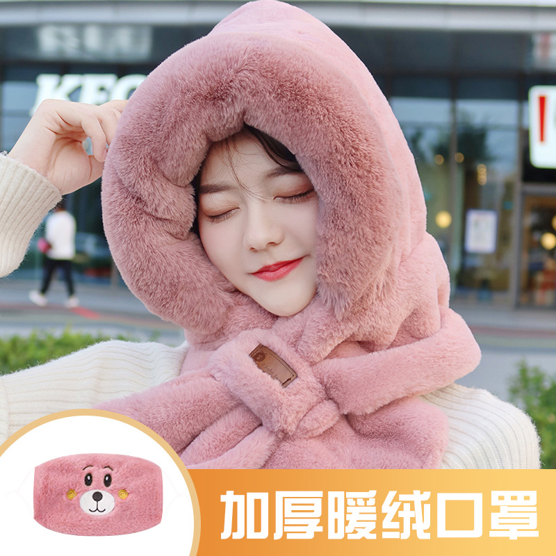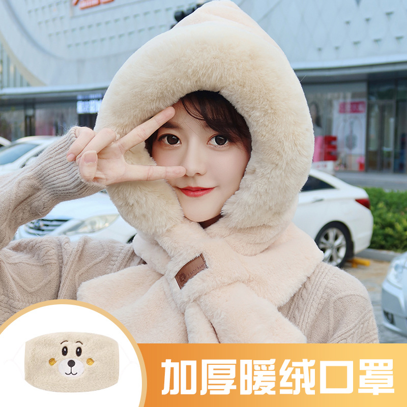 모자와 스카프가 하나로 통합된 여성용 겨울 사이클링 플러시 따뜻한 귀 보호 방풍 및 방한 곰 다용도 스카프 모자 레이펑 모자스토어 가기