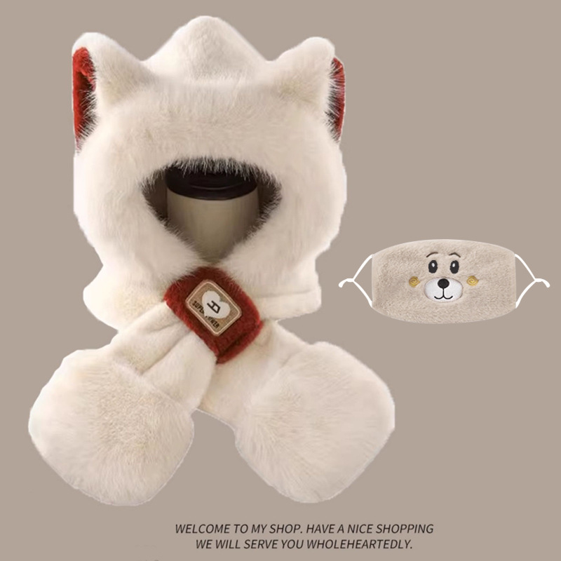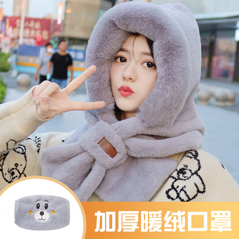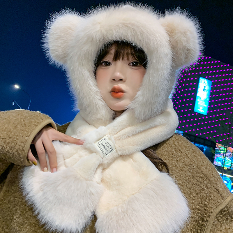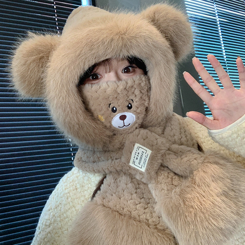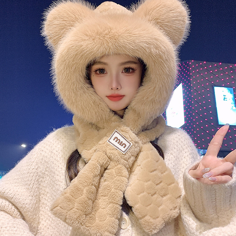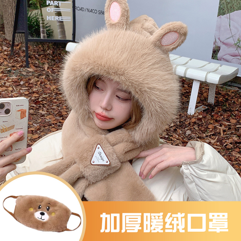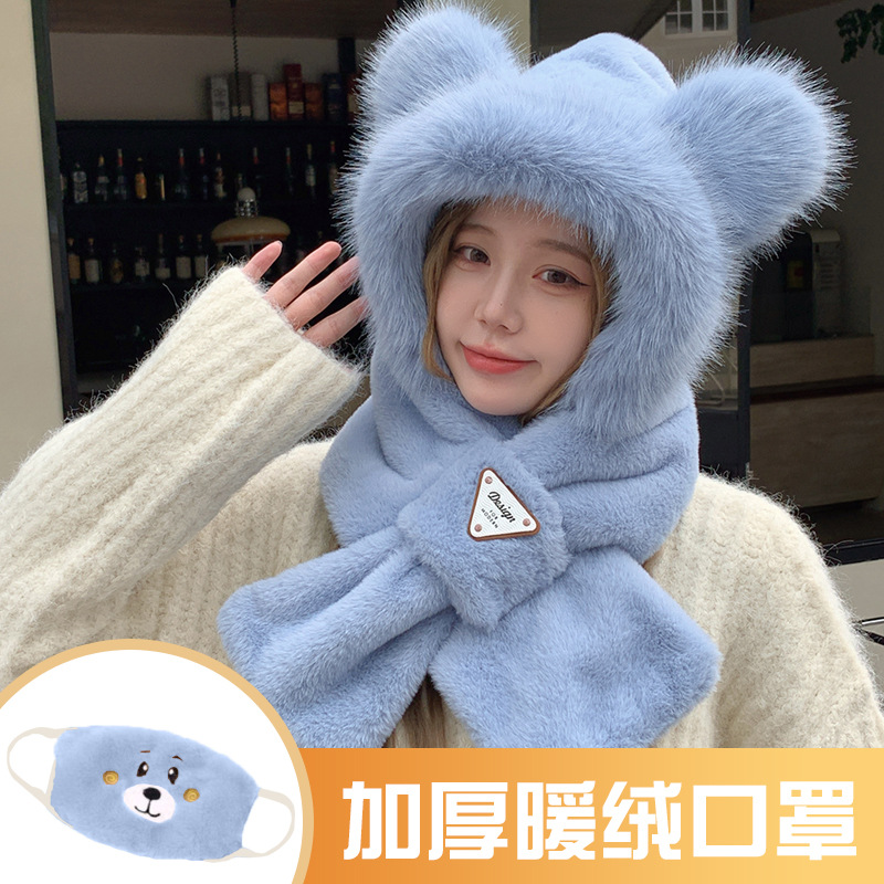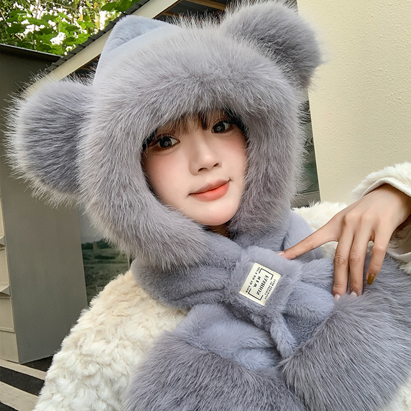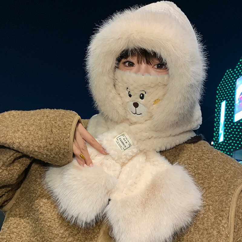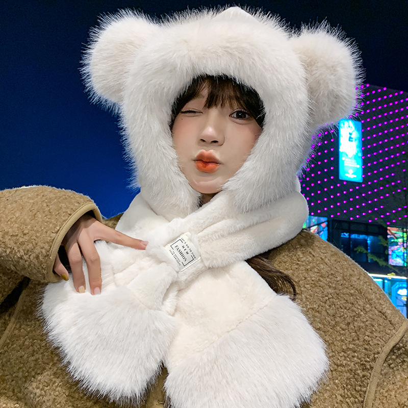 모자와 스카프가 하나로 통합된 여성용 겨울 사이클링 플러시 따뜻한 귀 보호 방풍 및 방한 곰 다용도 스카프 모자 레이펑 모자스토어 가기