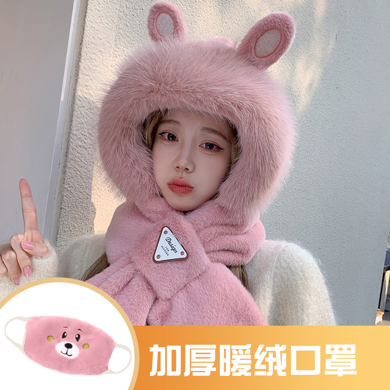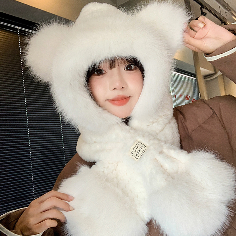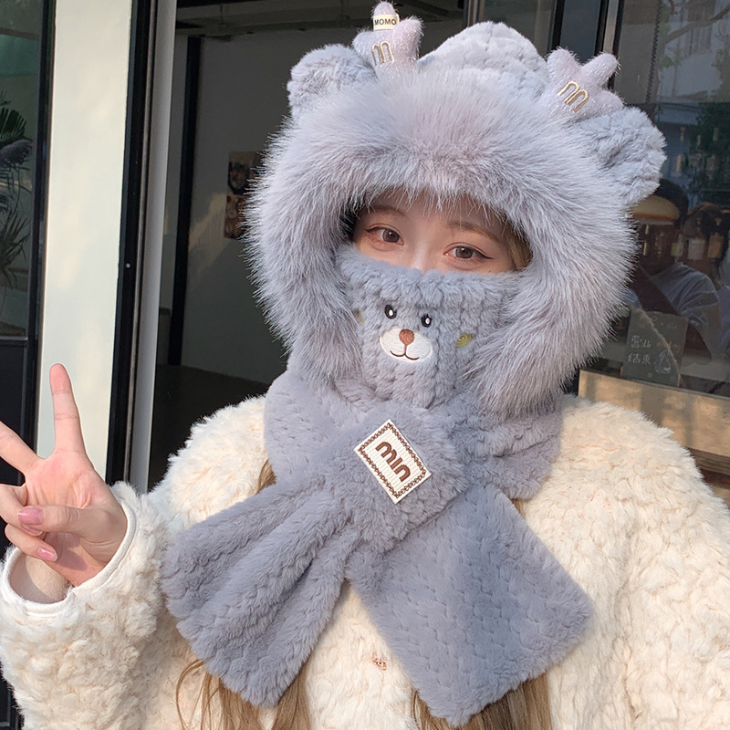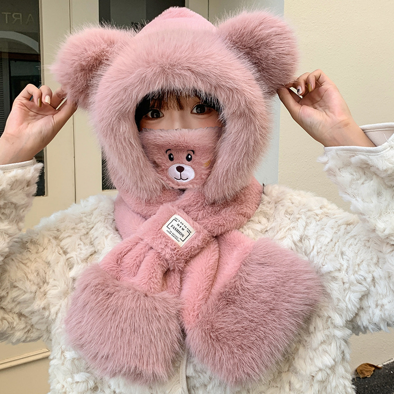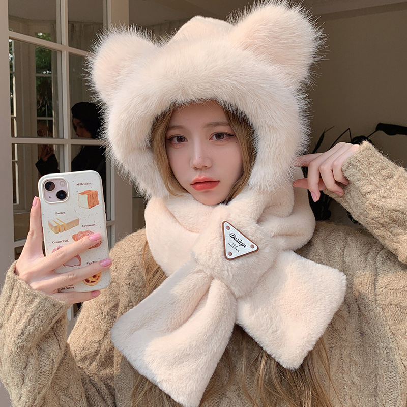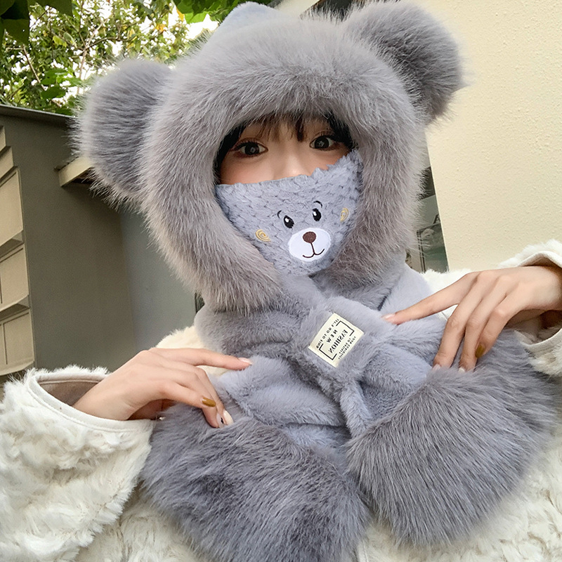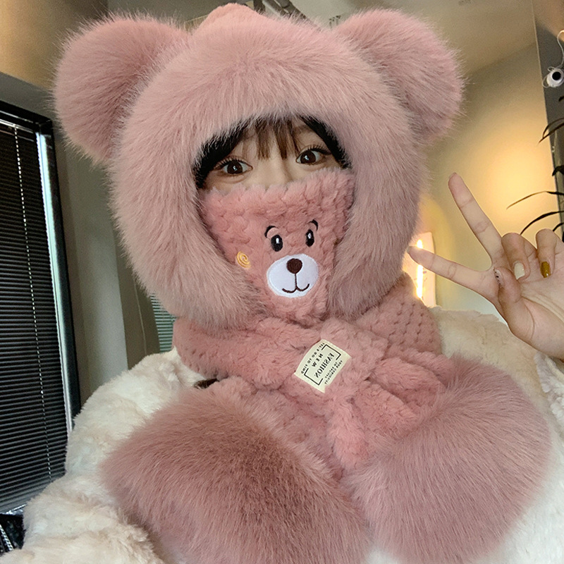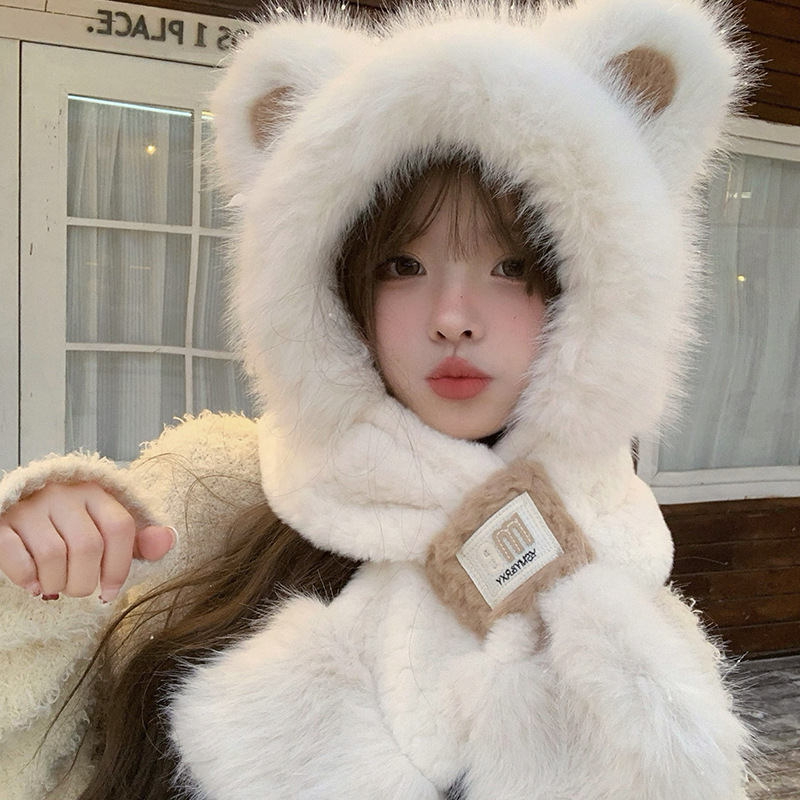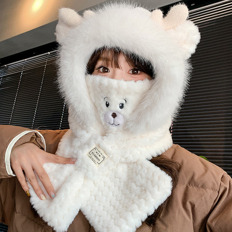 모자와 스카프가 하나로 통합된 여성용 겨울 사이클링 플러시 따뜻한 귀 보호 방풍 및 방한 곰 다용도 스카프 모자 레이펑 모자스토어 가기