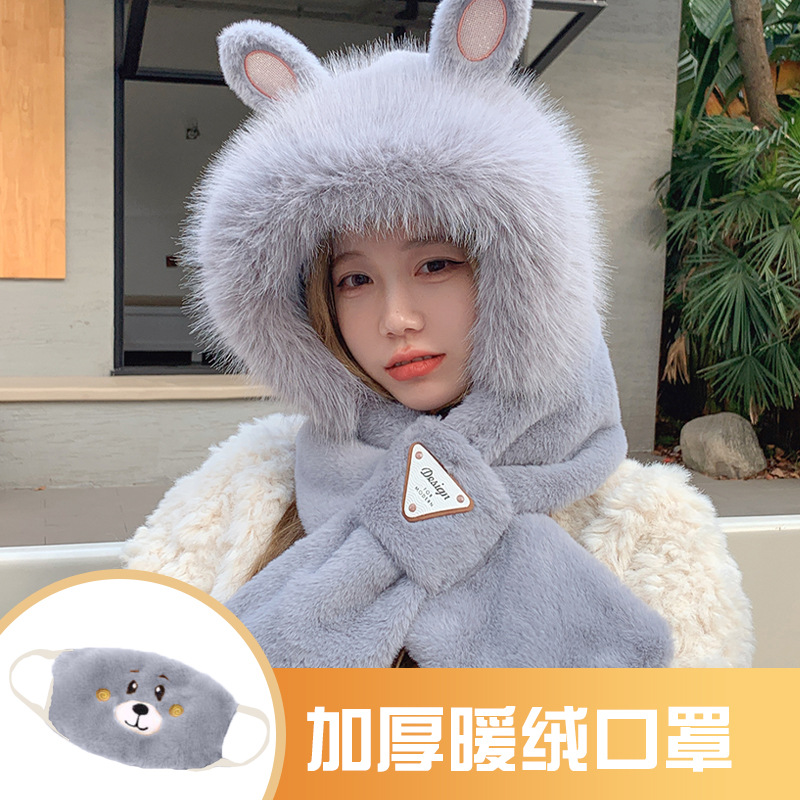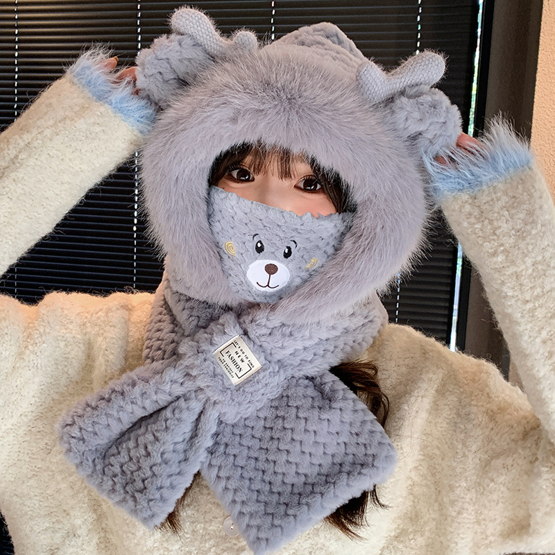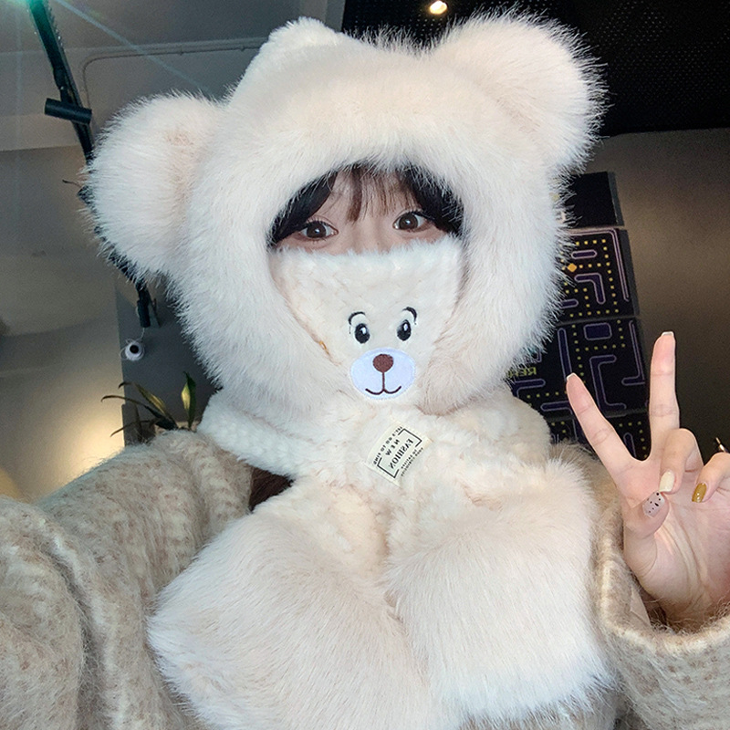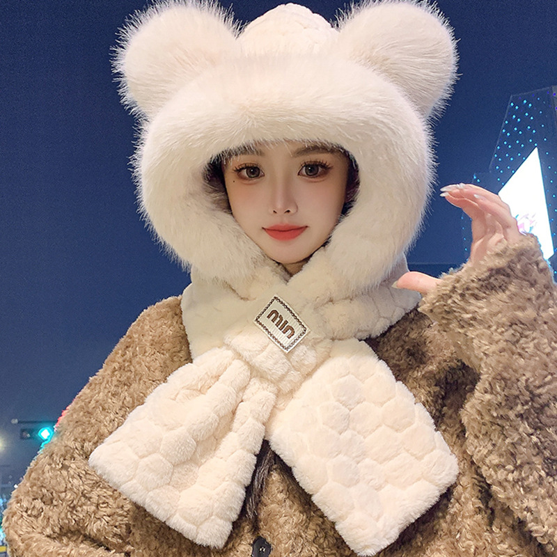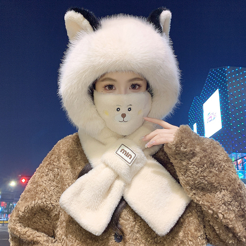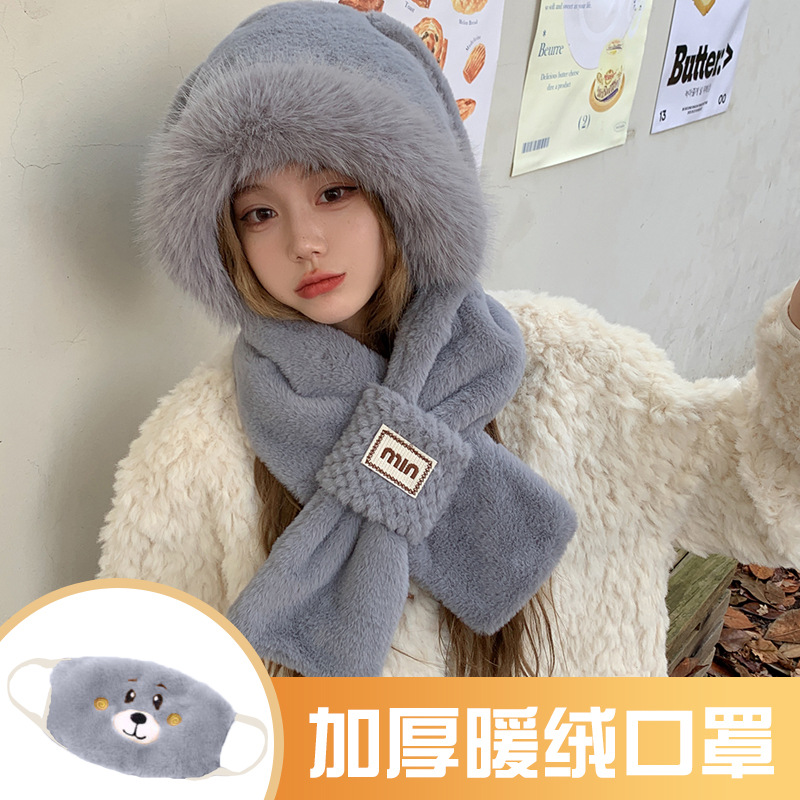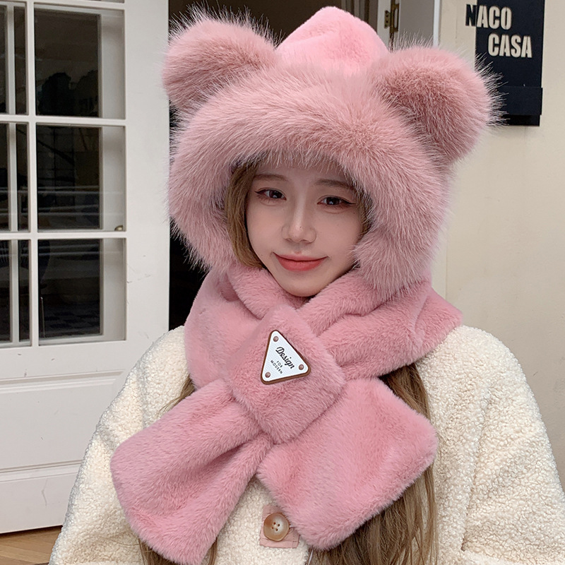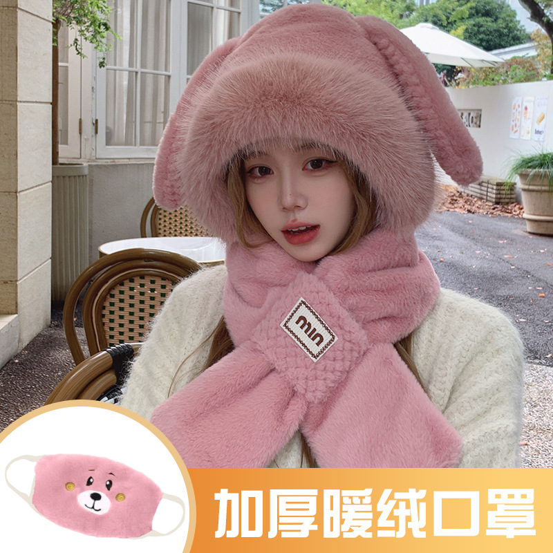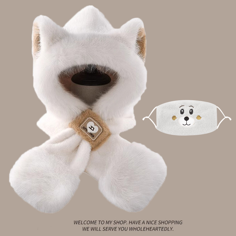 모자와 스카프가 하나로 통합된 여성용 겨울 사이클링 플러시 따뜻한 귀 보호 방풍 및 방한 곰 다용도 스카프 모자 레이펑 모자스토어 가기