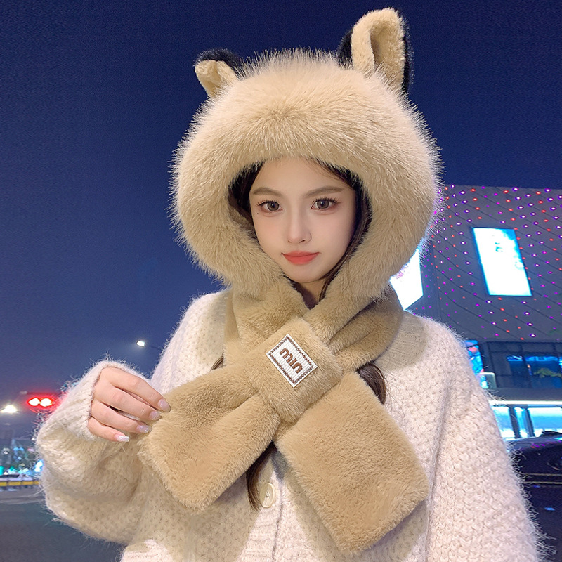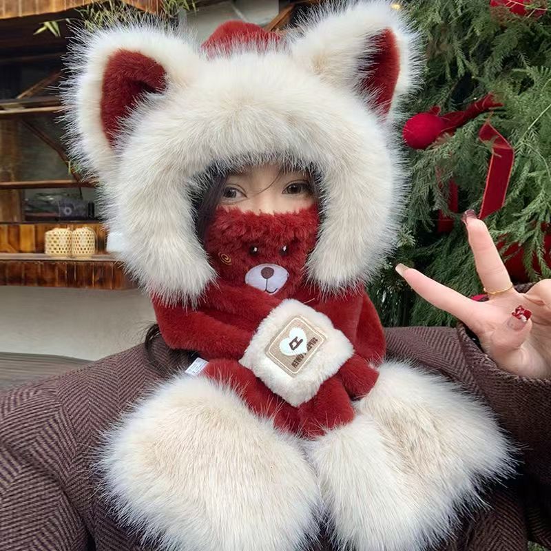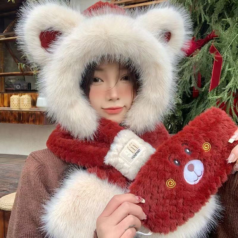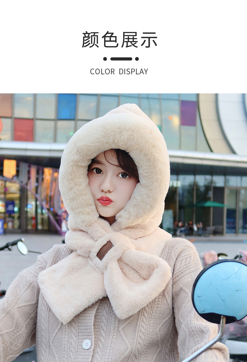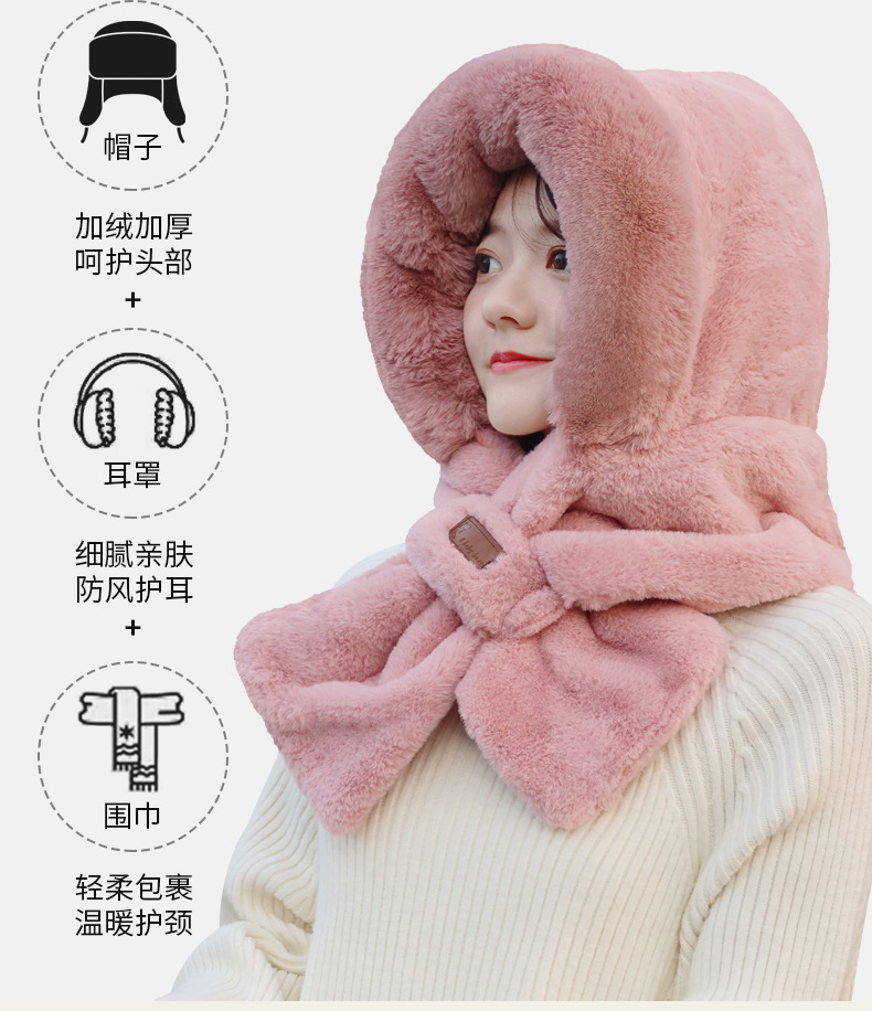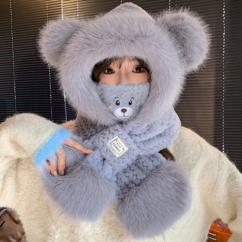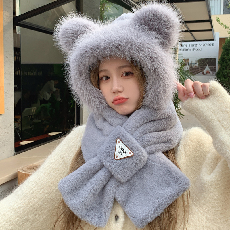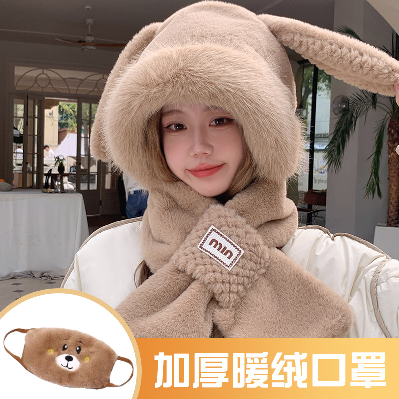 모자와 스카프가 하나로 통합된 여성용 겨울 사이클링 플러시 따뜻한 귀 보호 방풍 및 방한 곰 다용도 스카프 모자 레이펑 모자스토어 가기