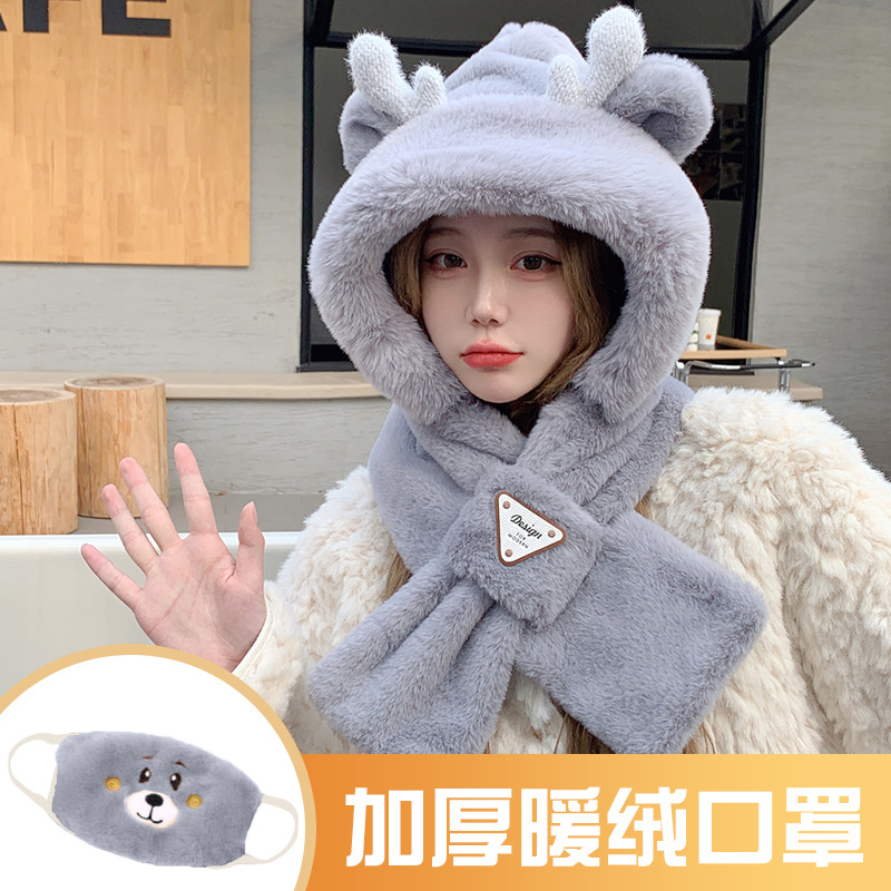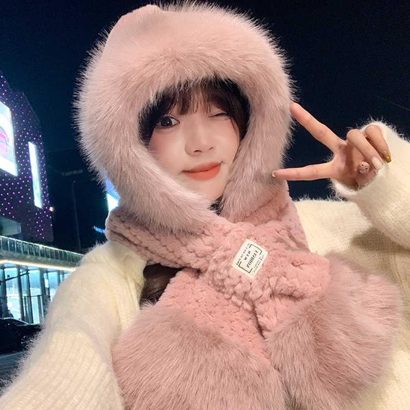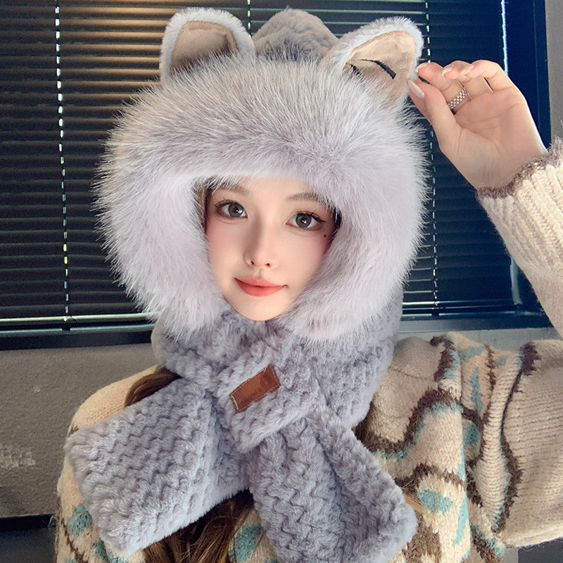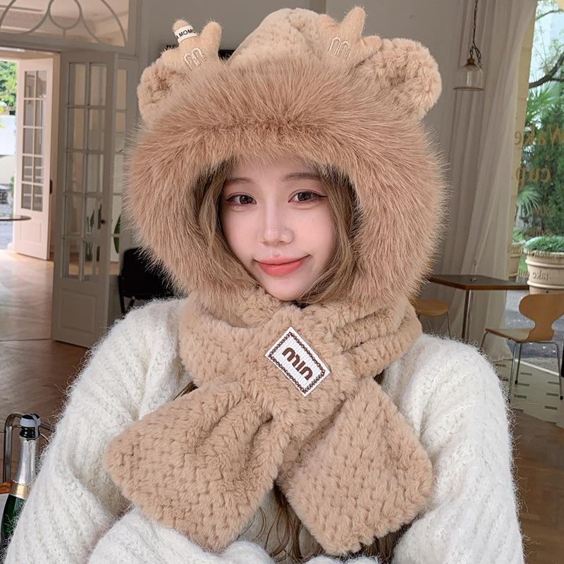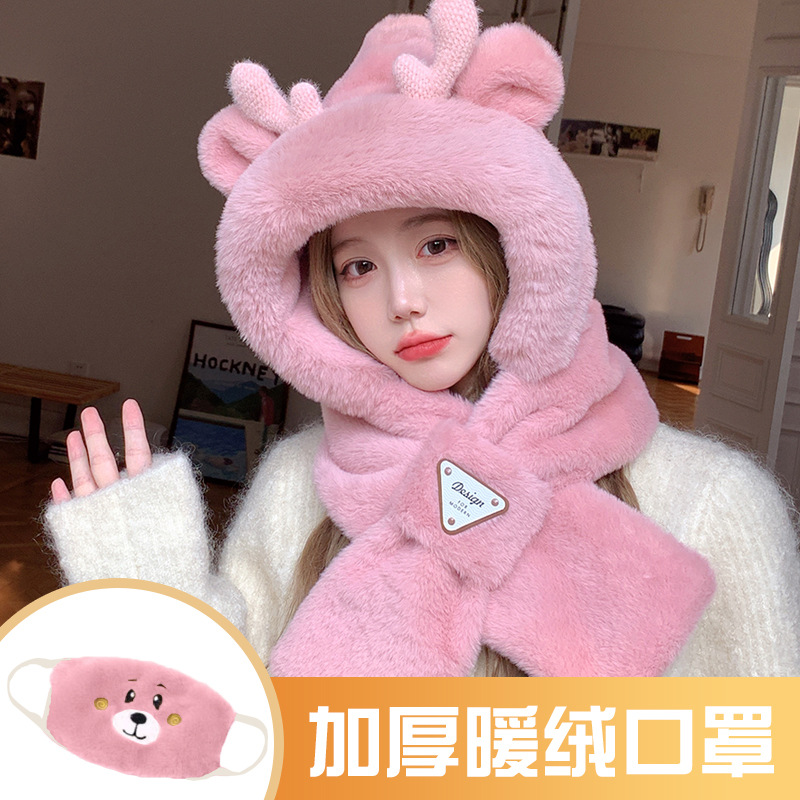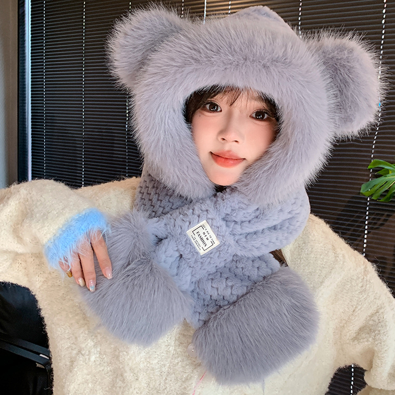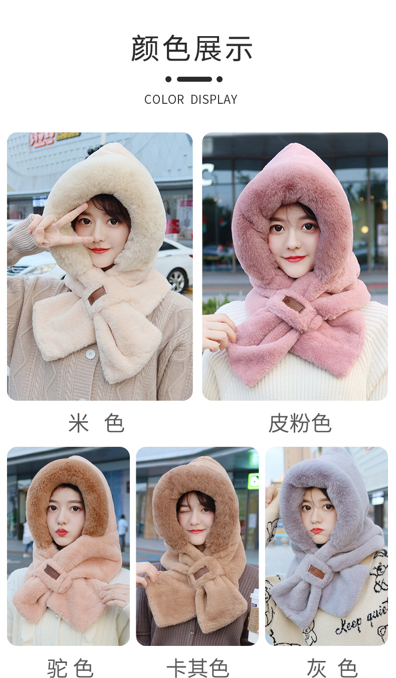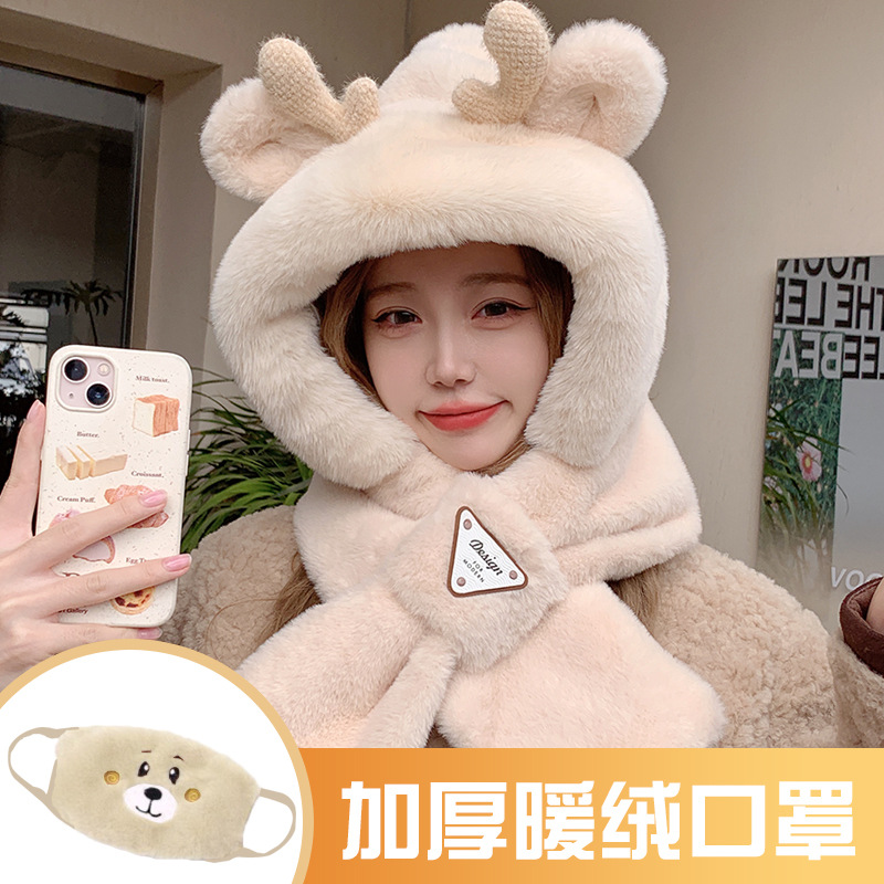 모자와 스카프가 하나로 통합된 여성용 겨울 사이클링 플러시 따뜻한 귀 보호 방풍 및 방한 곰 다용도 스카프 모자 레이펑 모자스토어 가기