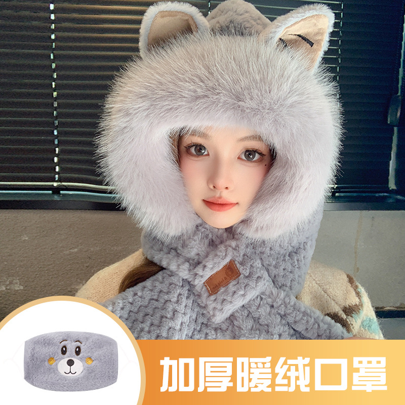• 시옹바오 모피 모자 + 따뜻한 벨벳 마스크 - 따뜻한 회색