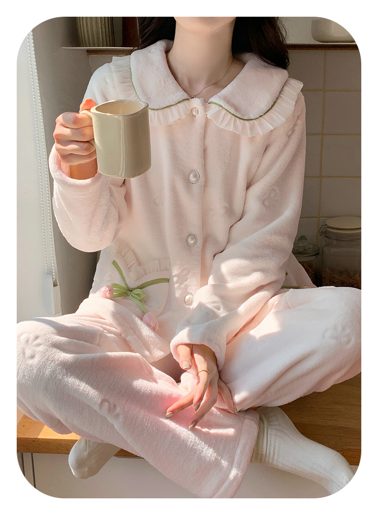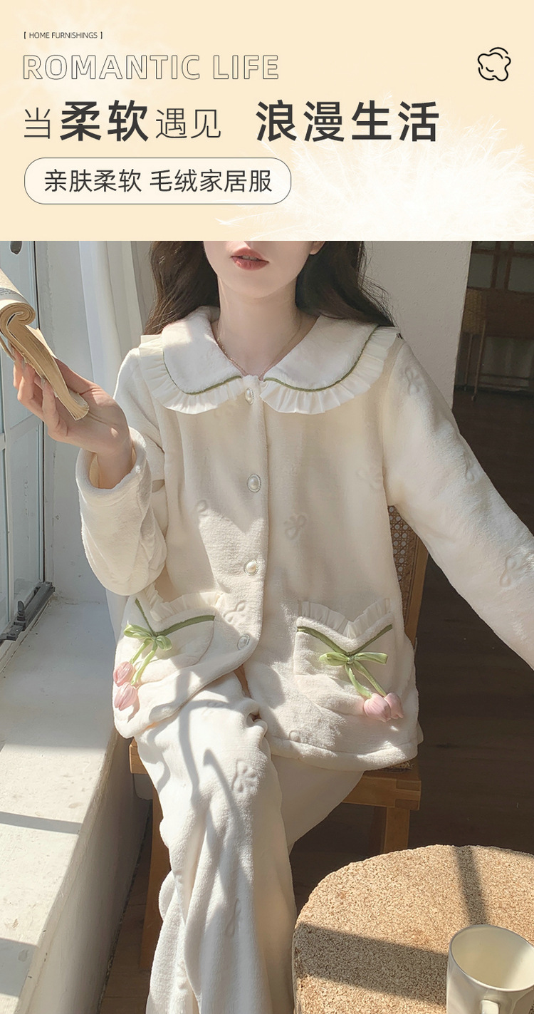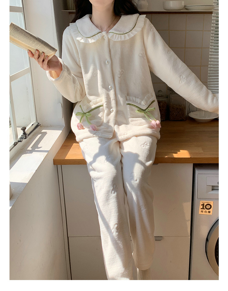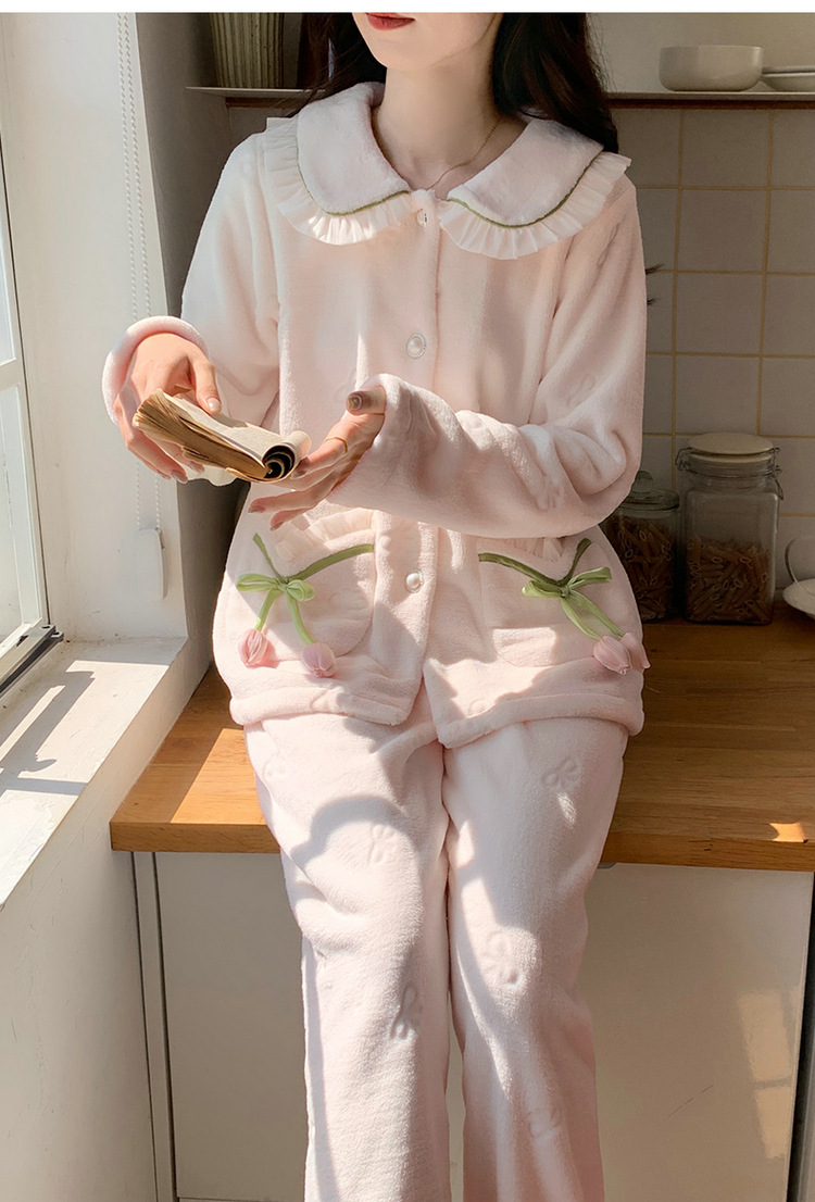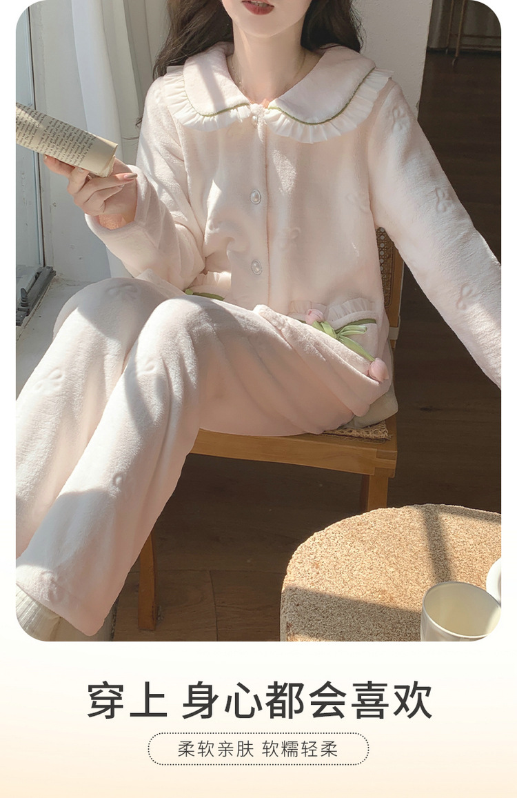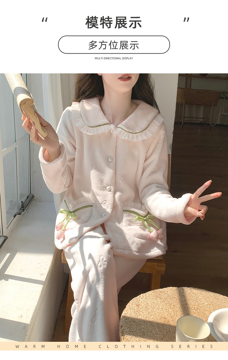 D 와우 미 다 겨울 새로운 달콤한 튤립 장식 두꺼운 따뜻한 산호 양털 잠옷 세트 여성의 집 옷