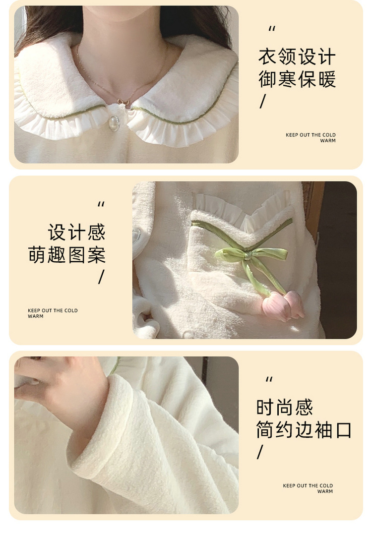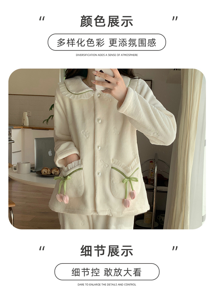 D 와우 미 다 겨울 새로운 달콤한 튤립 장식 두꺼운 따뜻한 산호 양털 잠옷 세트 여성의 집 옷스토어 가기
