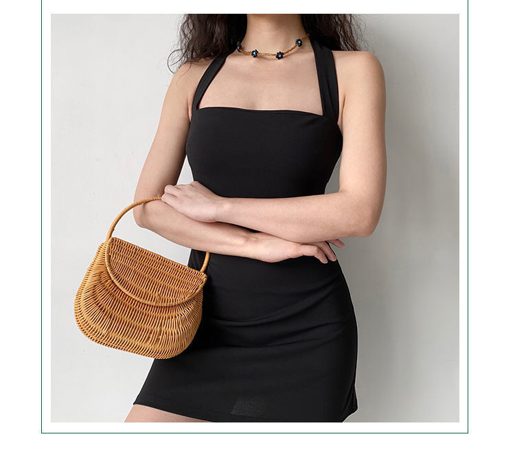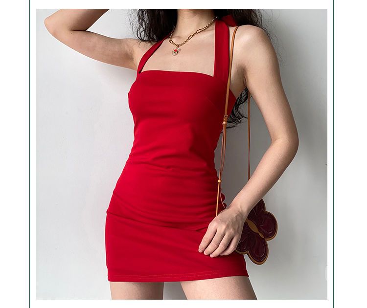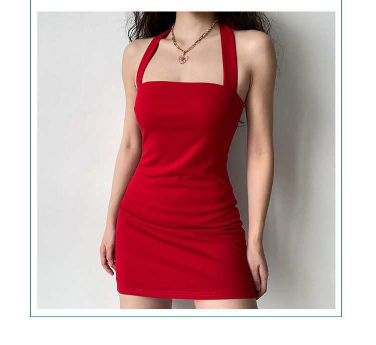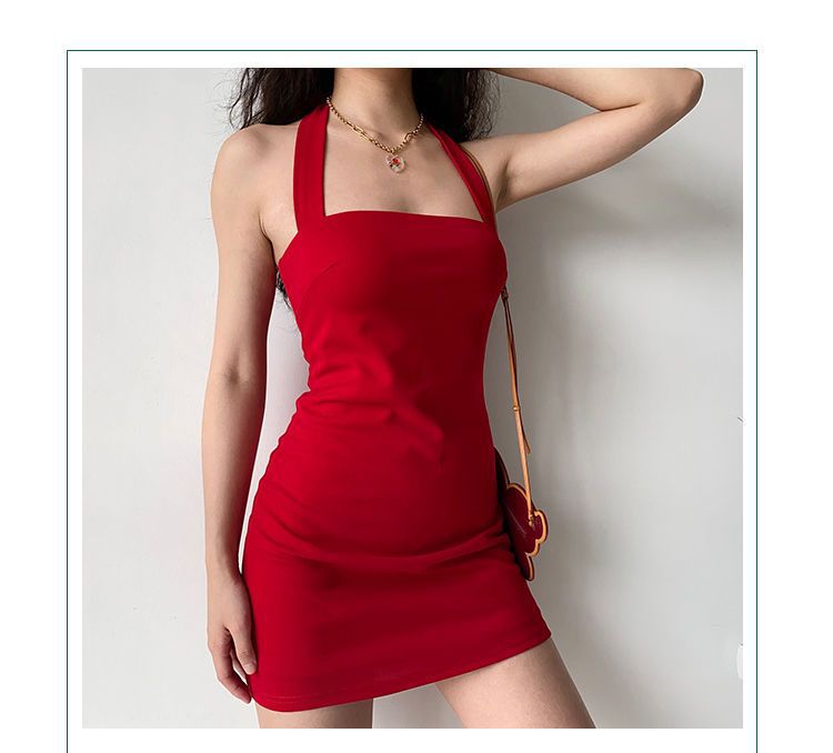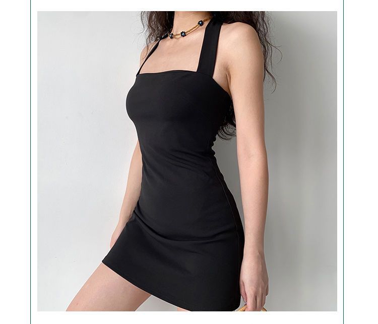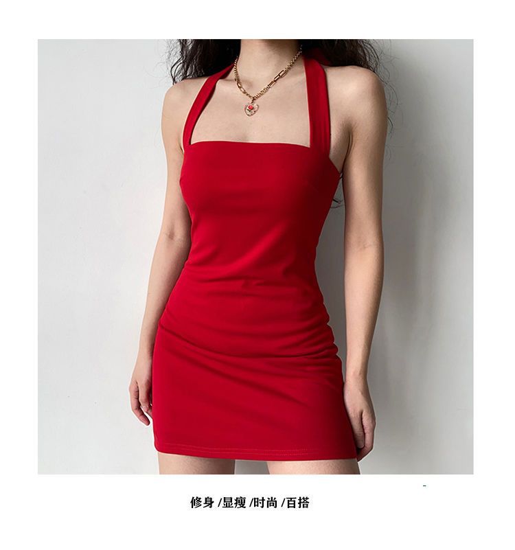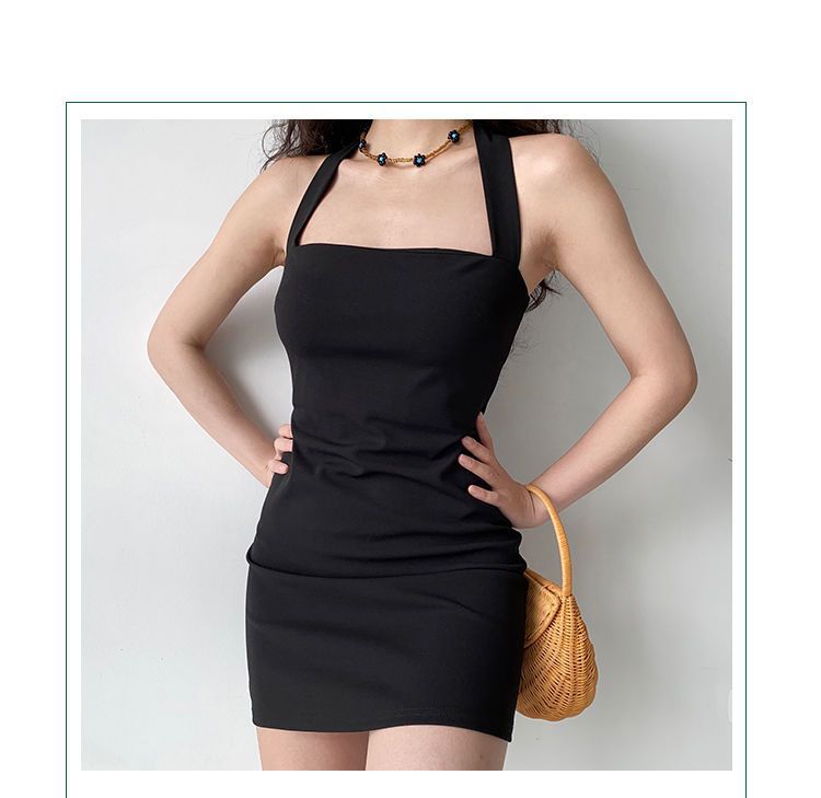 가슴 패드 포함 2021 새로운 여름 슬림 레트로 섹시한 백리스 플랫 넥 홀터넥 서스펜더 드레스 여성 Jiang Wu Hong스토어 가기