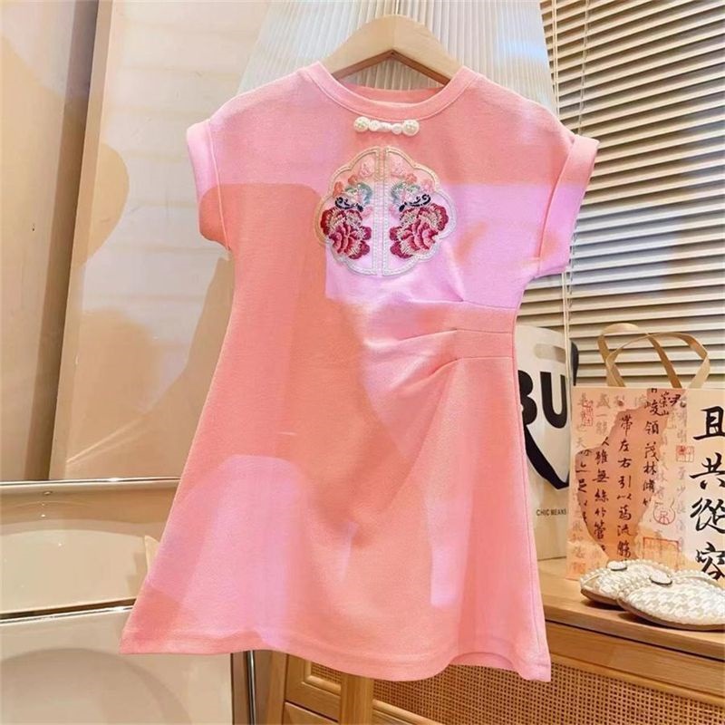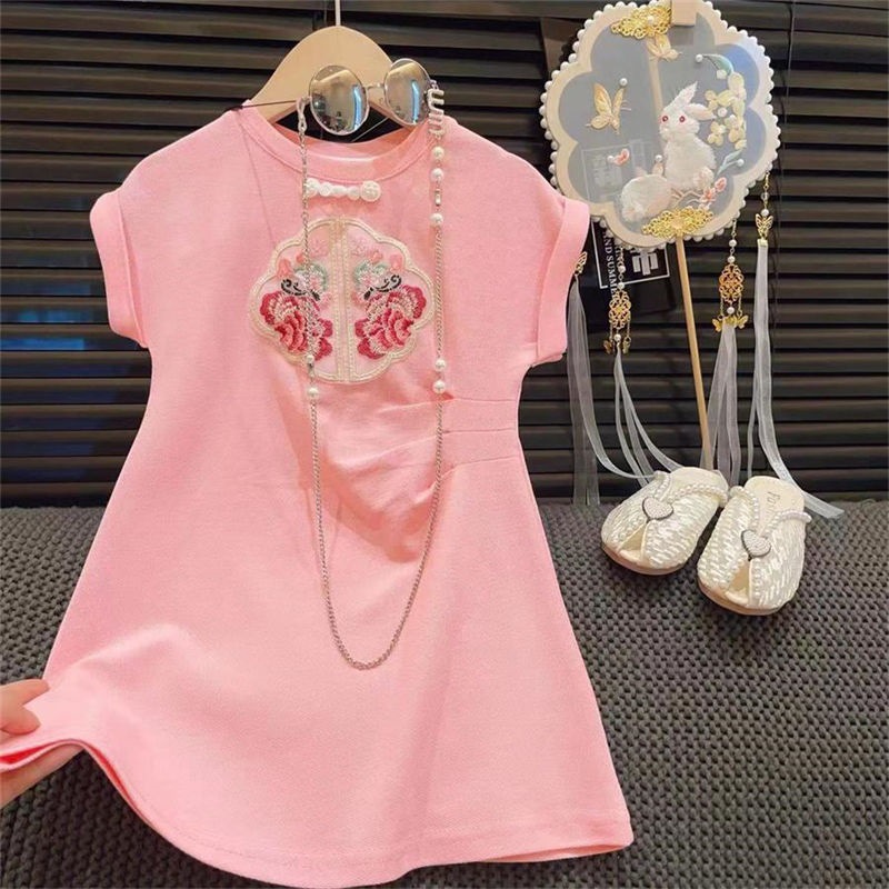여자 청삼 원피스 2024 년 여름 새로운 어린이 중국 스타일 한후 탕 세트 아기 여름 반팔 원피스스토어 가기