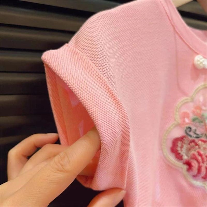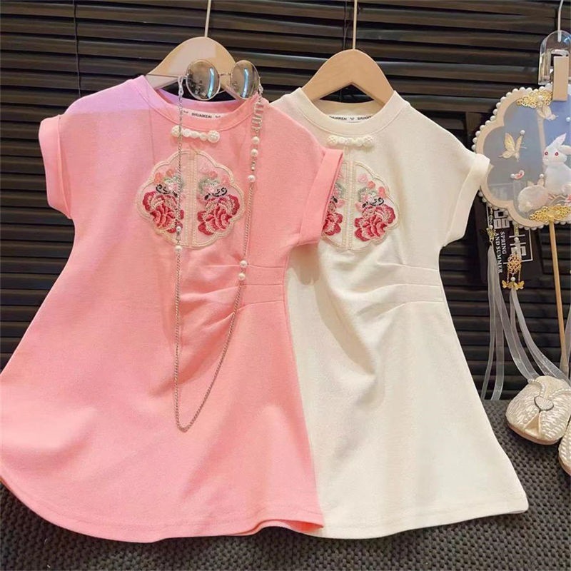 여자 청삼 원피스 2024 년 여름 새로운 어린이 중국 스타일 한후 탕 세트 아기 여름 반팔 원피스