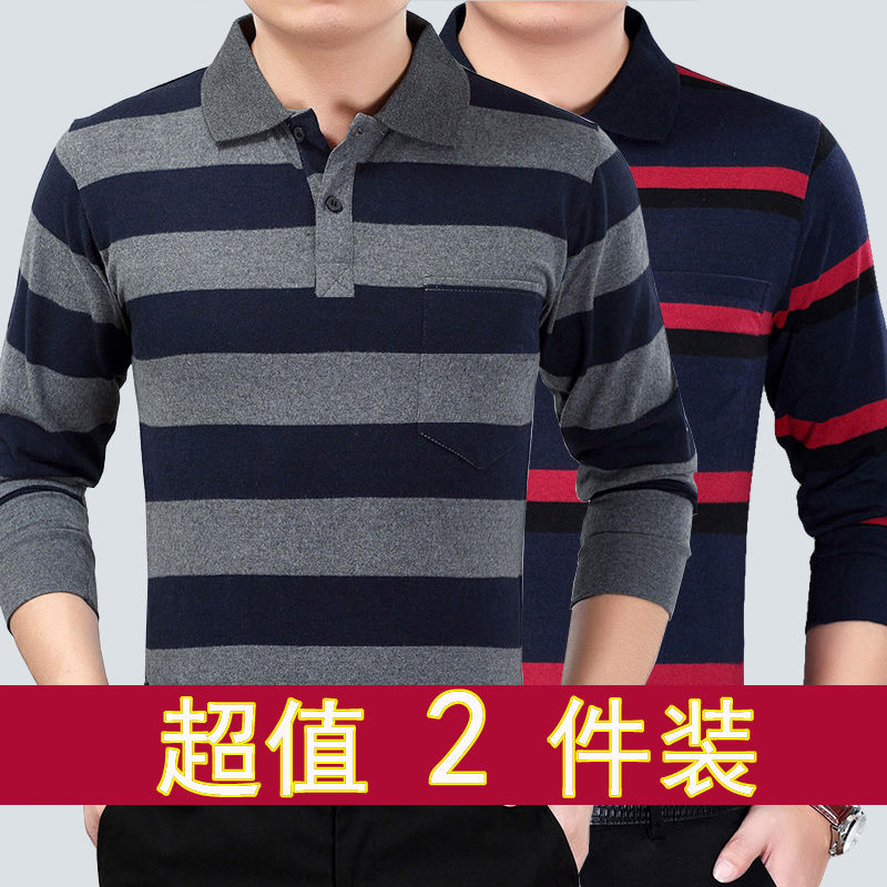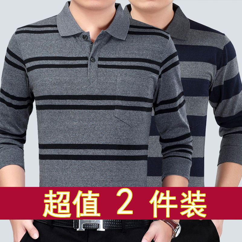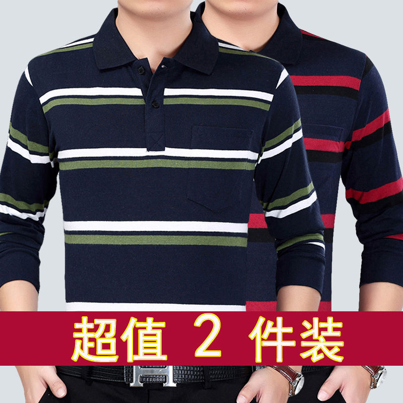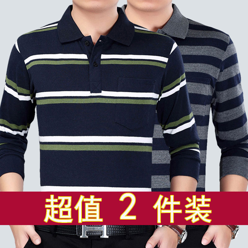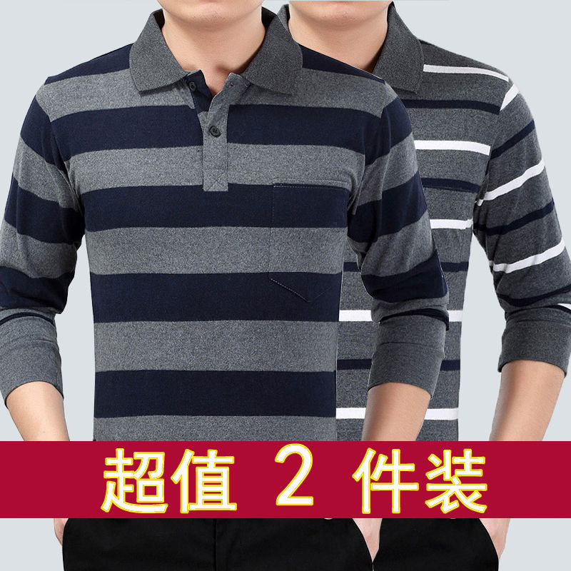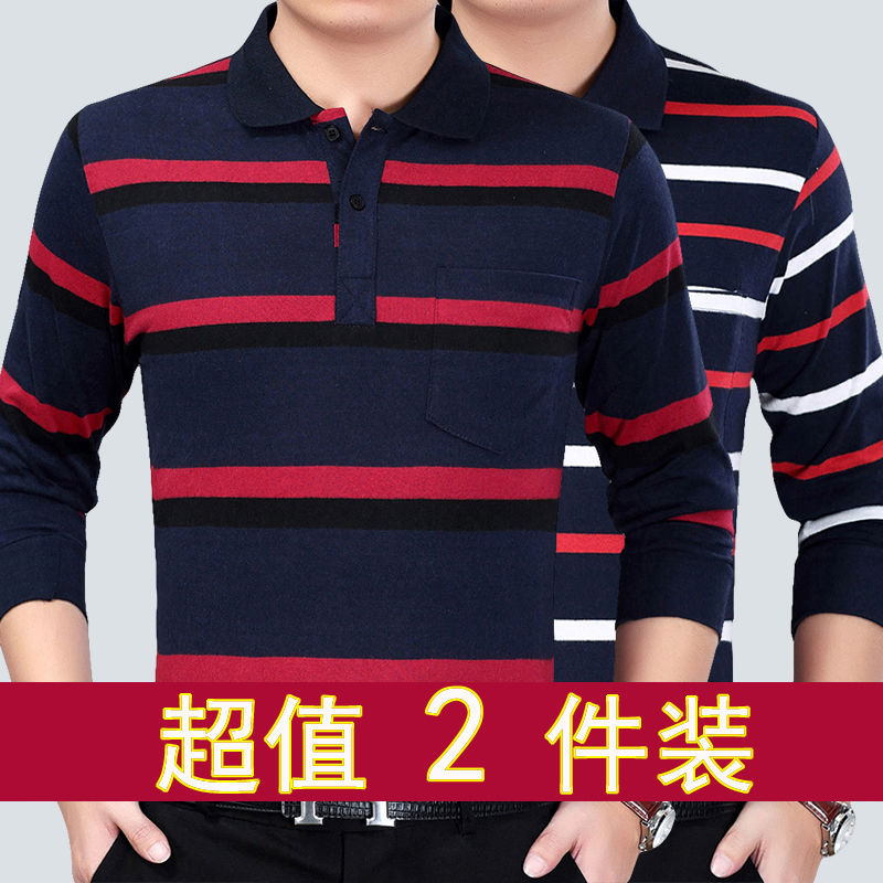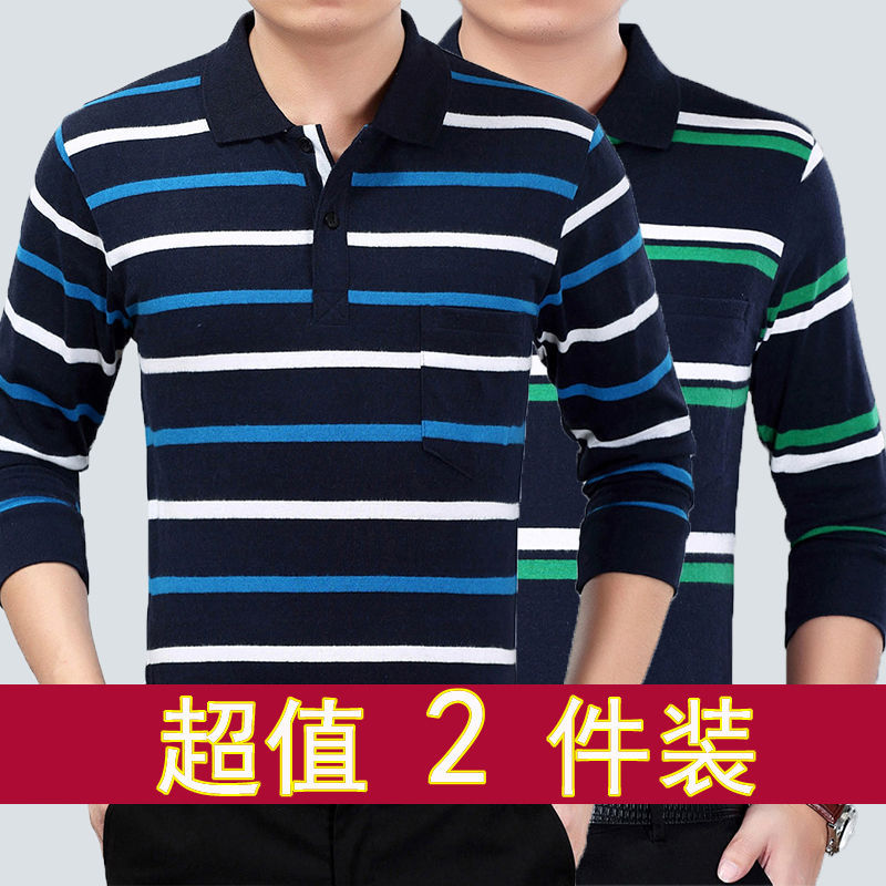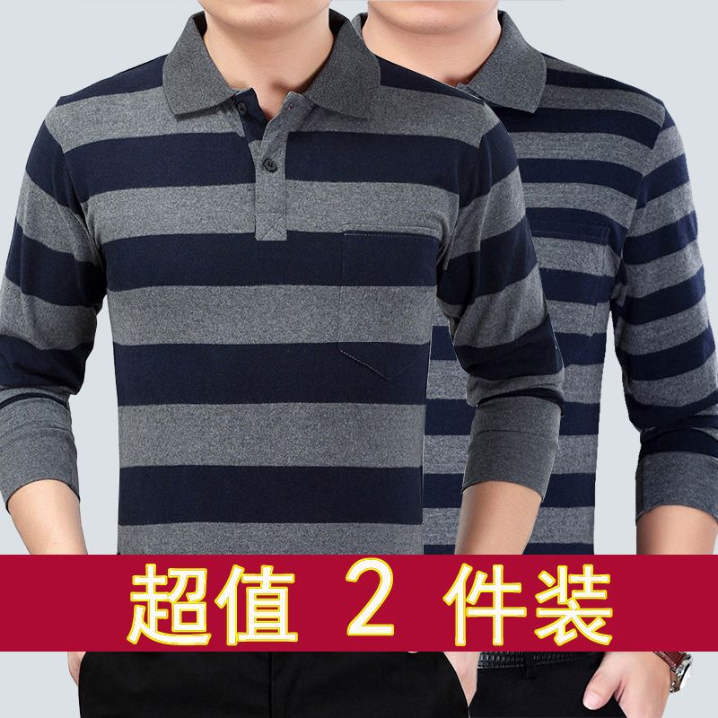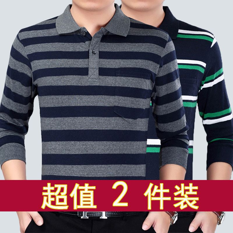[1/2 팩] 봄과 가을 남자 긴 소매 티셔츠 옷깃 스트라이프 루즈베이스 셔츠 중년 Jiang Wuhong