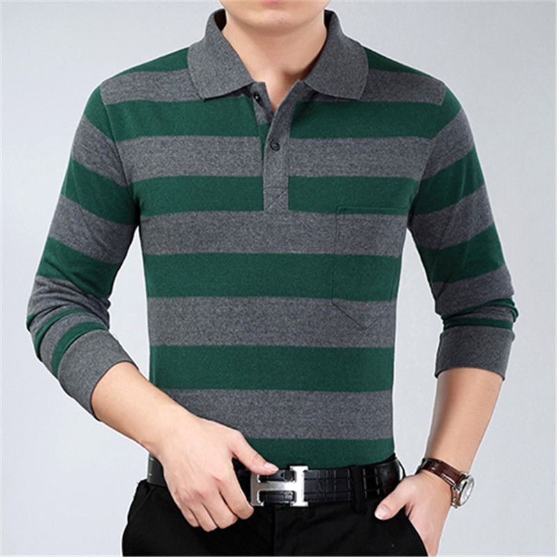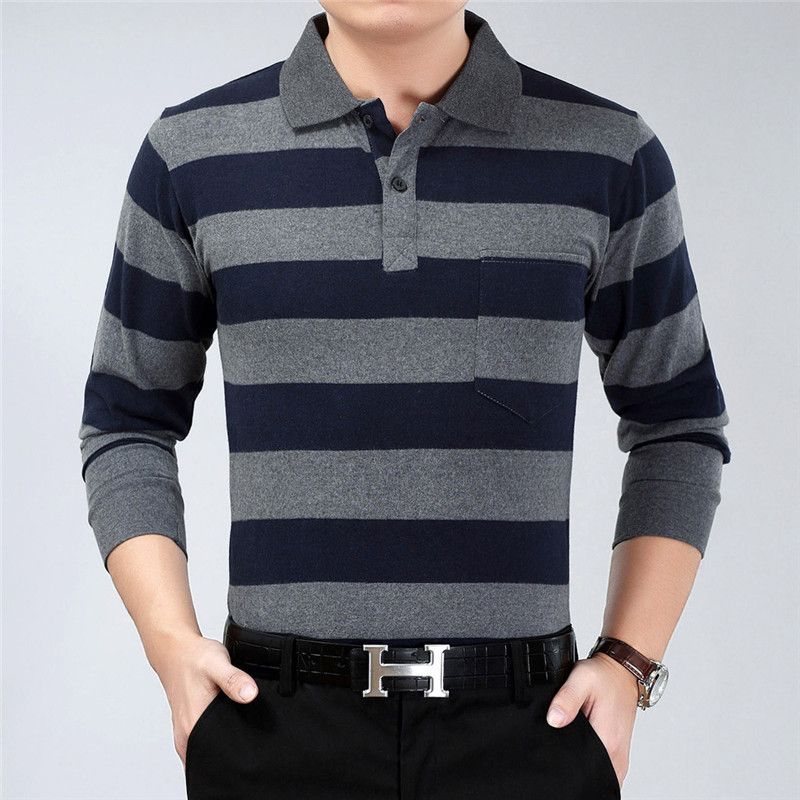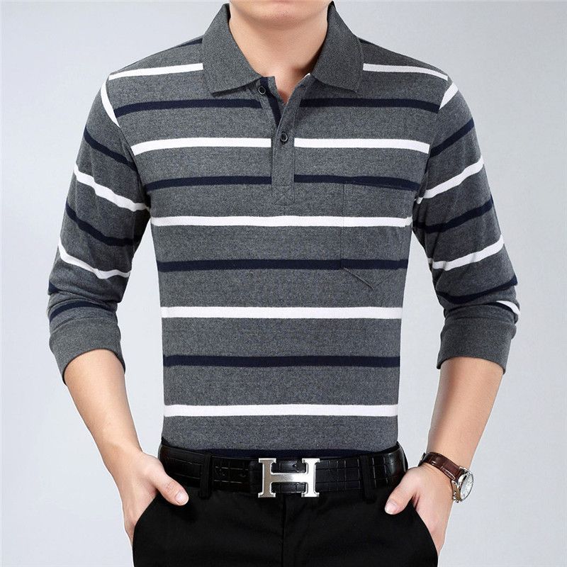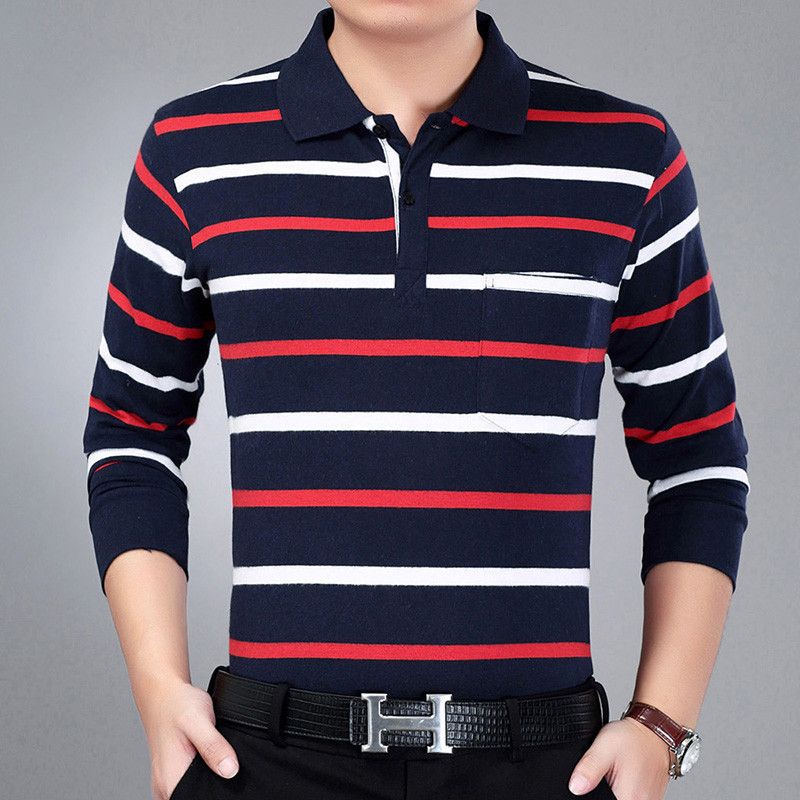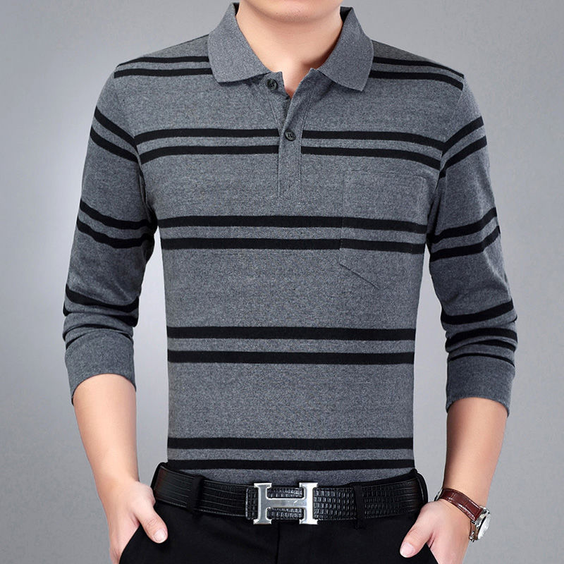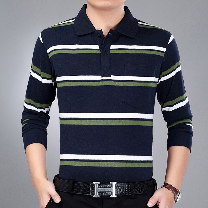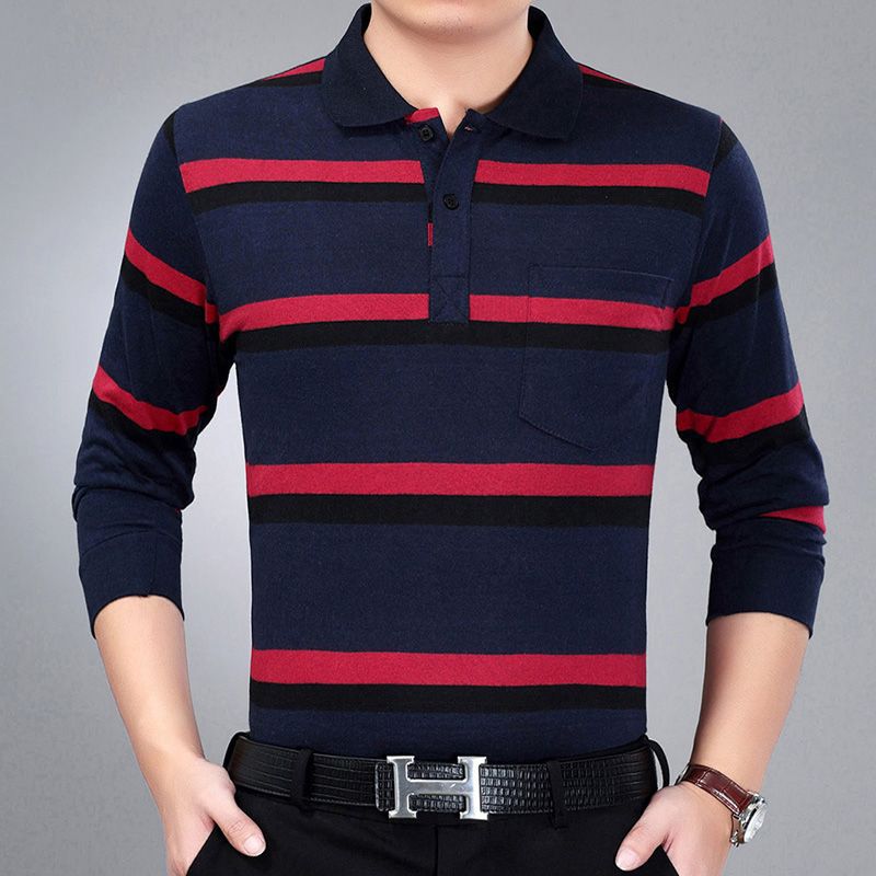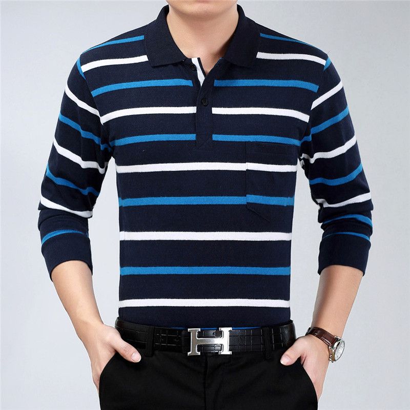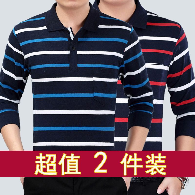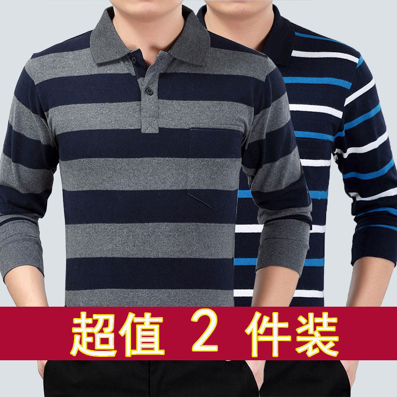 [1/2 팩] 봄과 가을 남자 긴 소매 티셔츠 옷깃 스트라이프 루즈베이스 셔츠 중년 Jiang Wuhong
