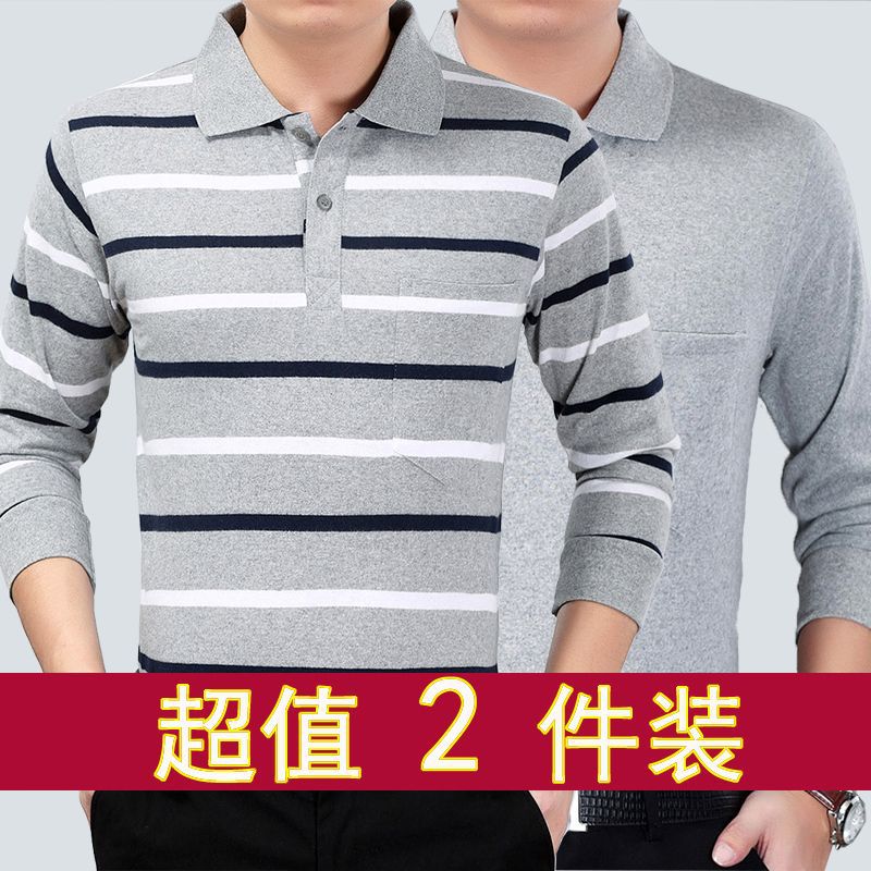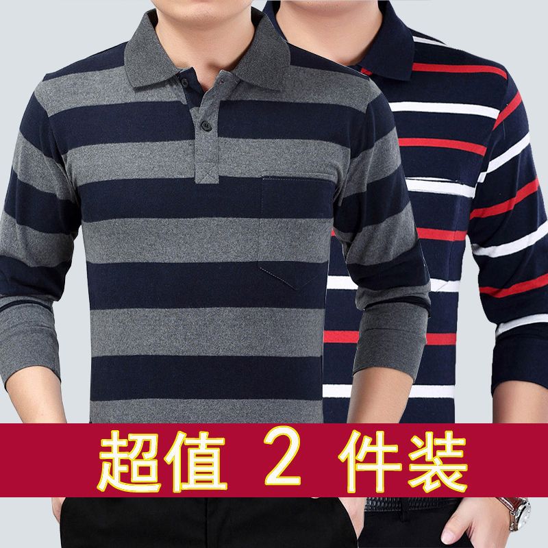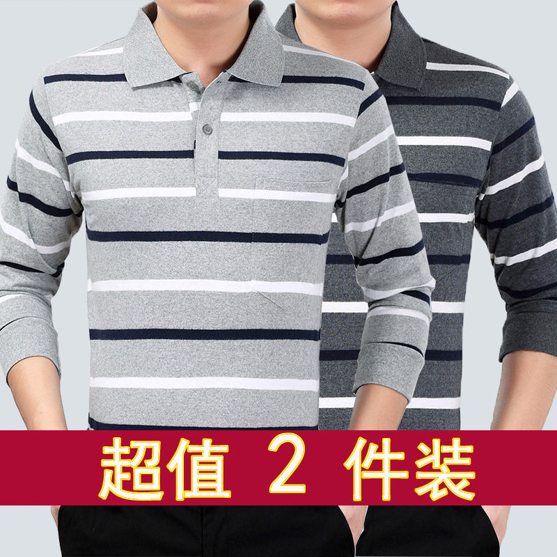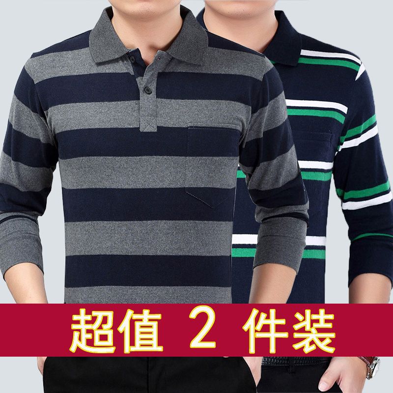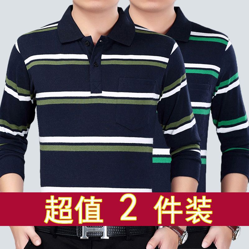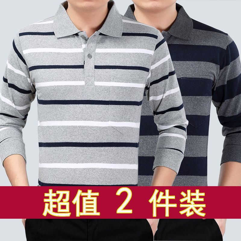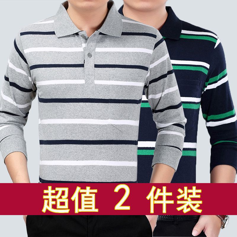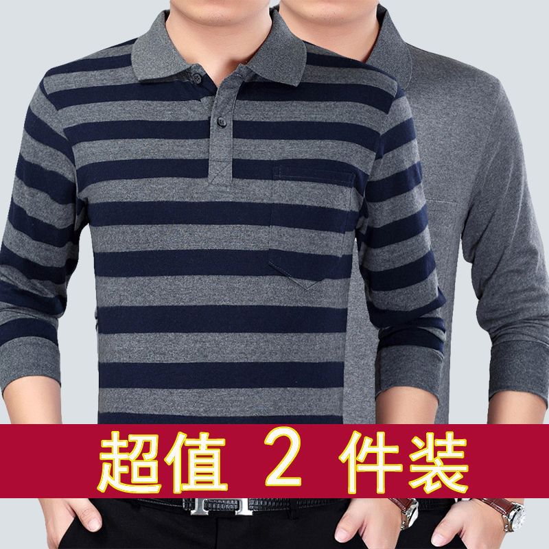[1/2 팩] 봄과 가을 남자 긴 소매 티셔츠 옷깃 스트라이프 루즈베이스 셔츠 중년 Jiang Wuhong스토어 가기
