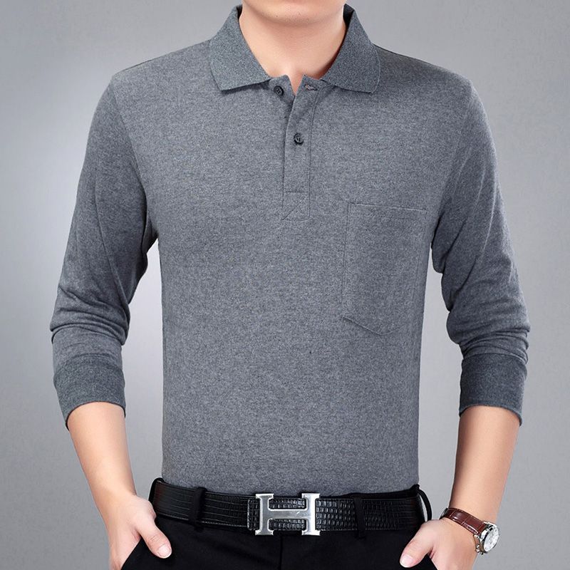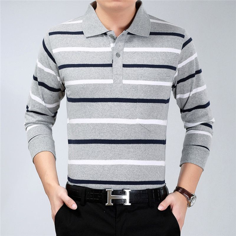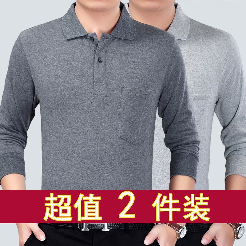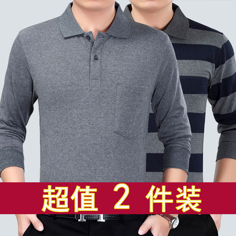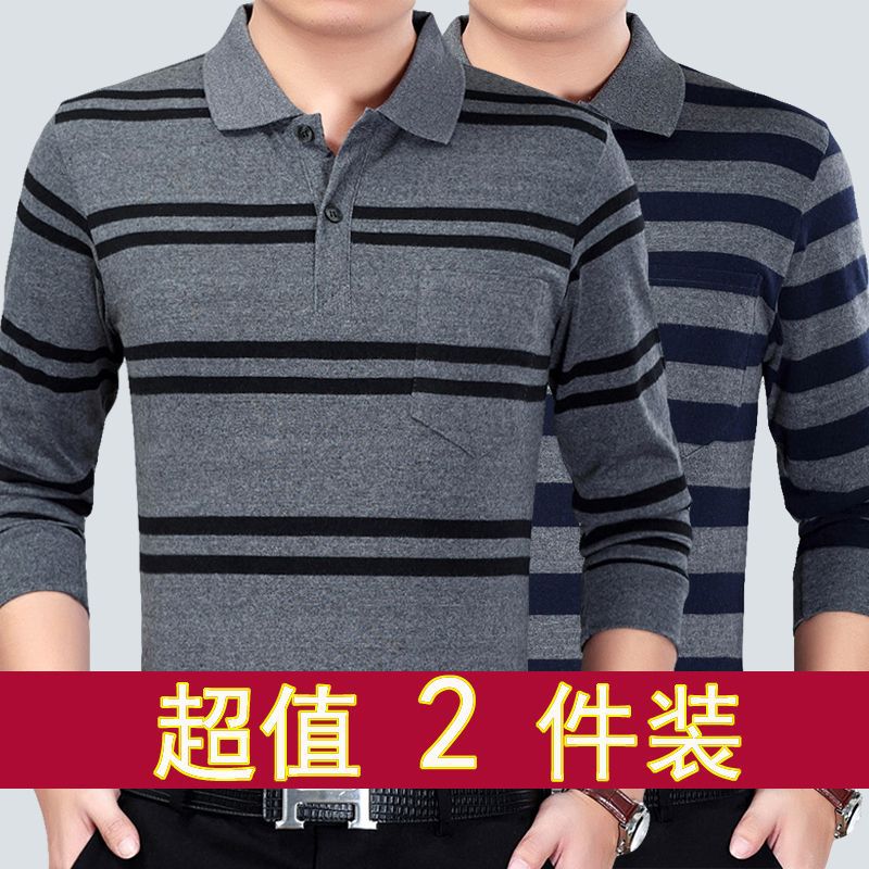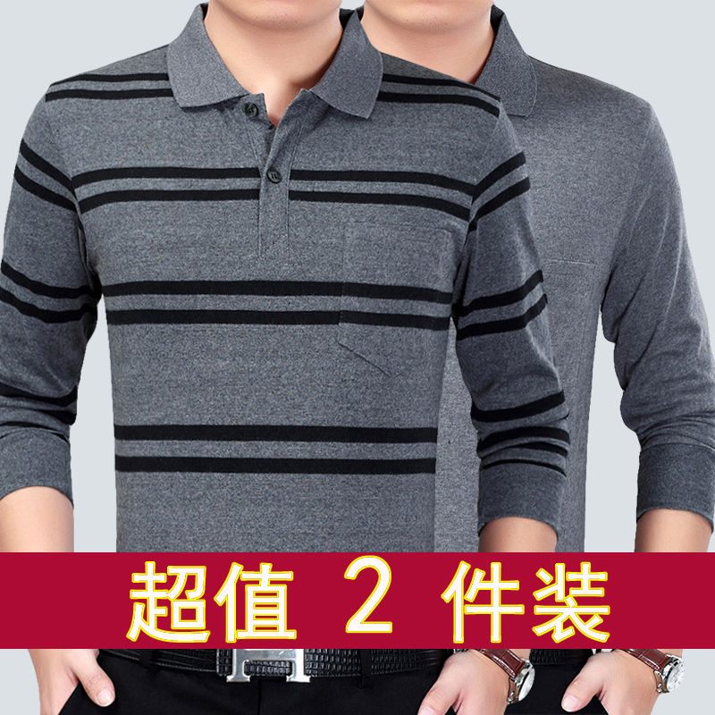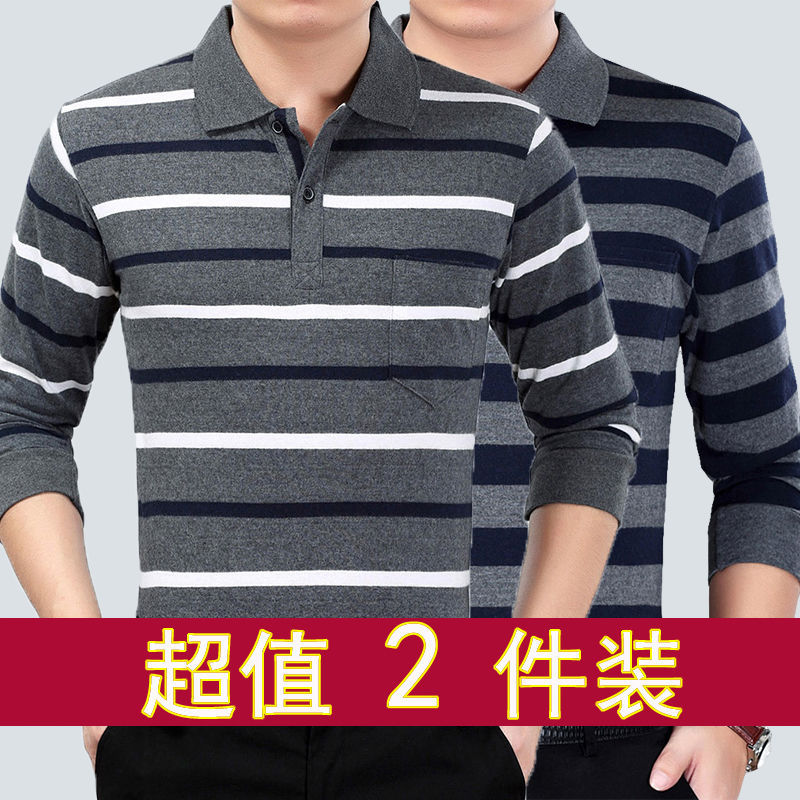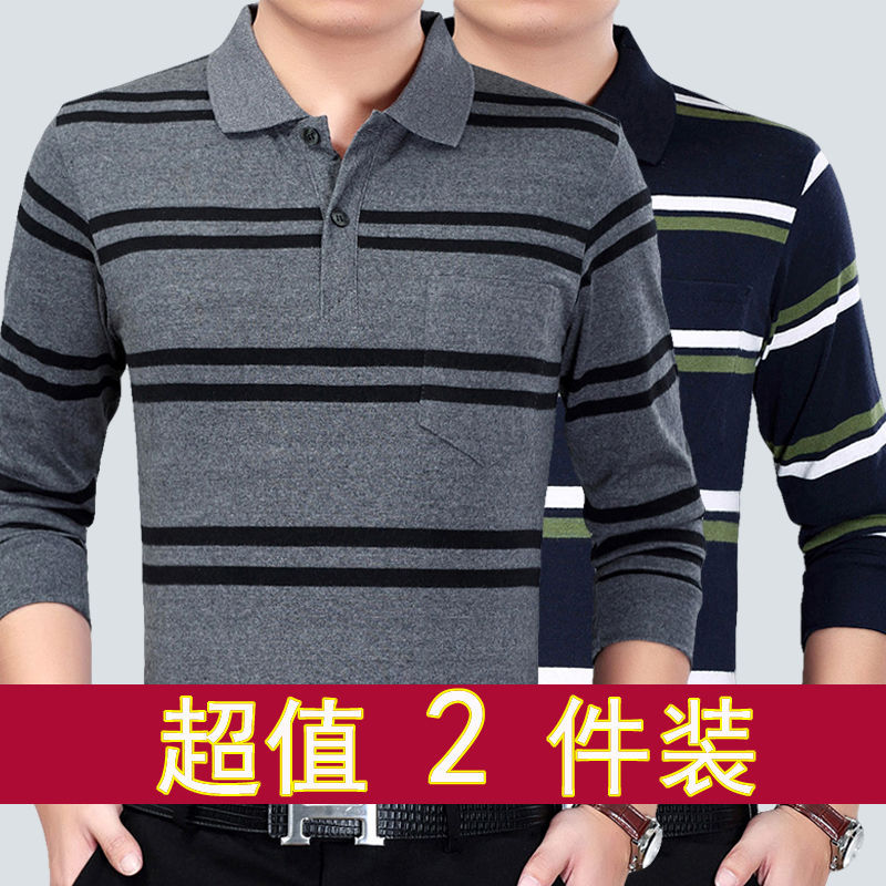 [1/2 팩] 봄과 가을 남자 긴 소매 티셔츠 옷깃 스트라이프 루즈베이스 셔츠 중년 Jiang Wuhong스토어 가기