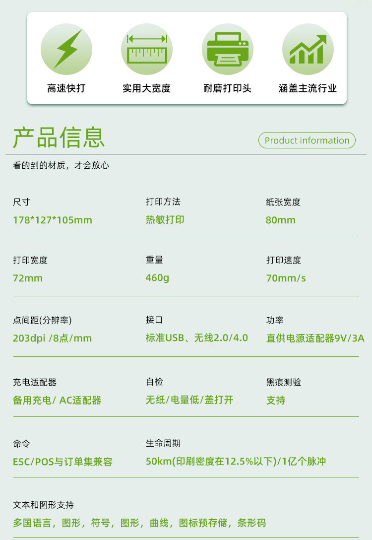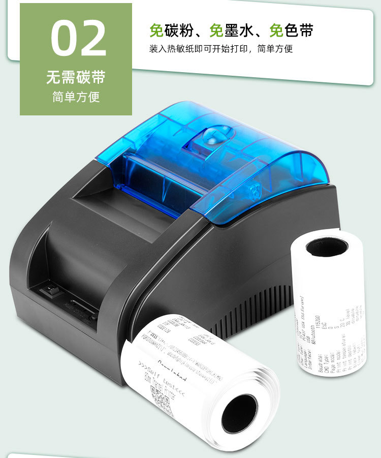 - 支持蓝牙功能,支持Android,iOS和Windows,方便您无线打印设备中的数据
