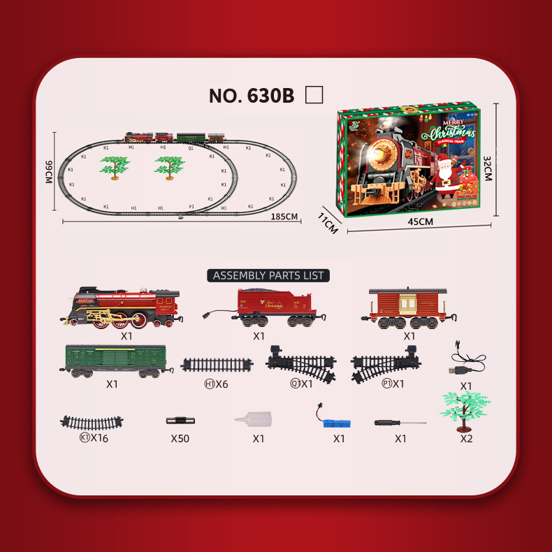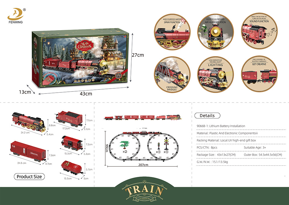 The retro steam train track features 3 steam spray spots, 2 lighting spots, electric remote control, forward and backward functions, realistic steam whistle sounds, DIY track splicing, and a configuration of a lithium battery car. It also supports customized remote control and electric configurations.