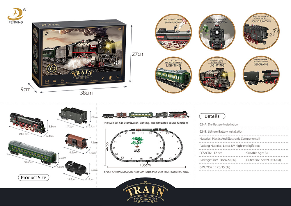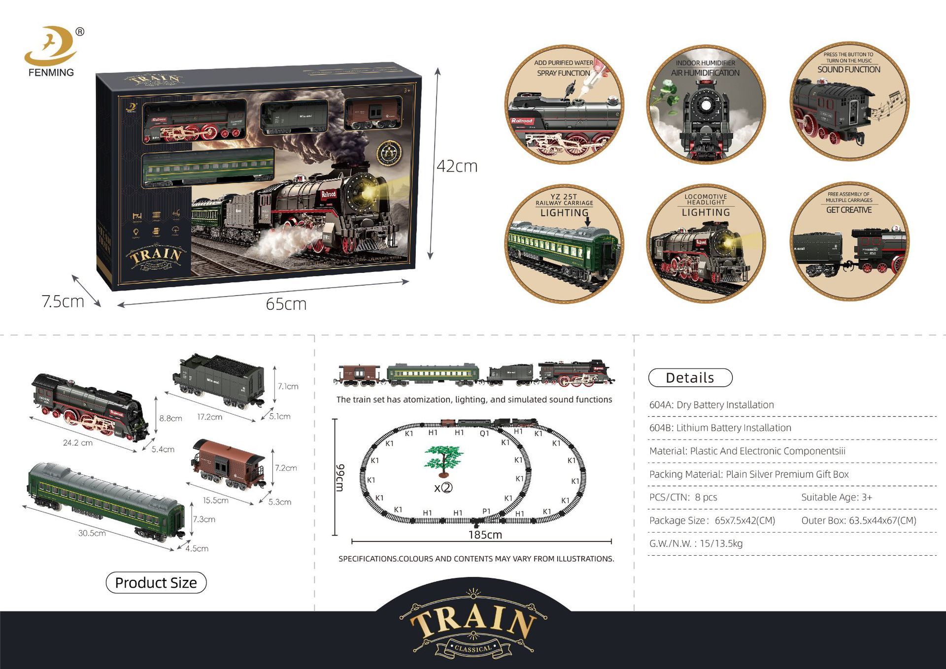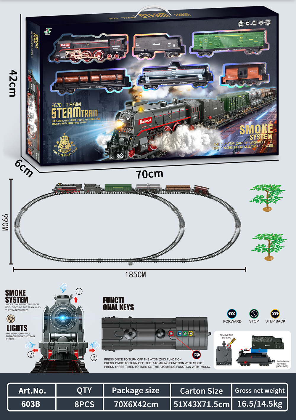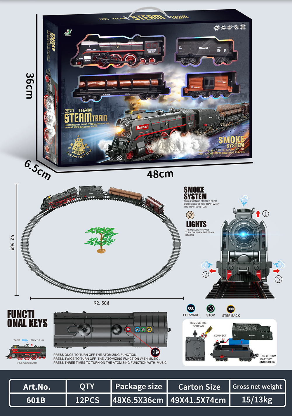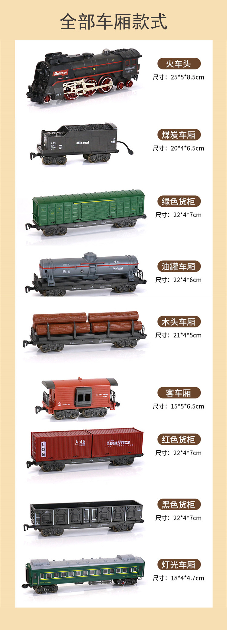 复古蒸汽火车轨道,3处蒸汽喷雾/2处灯光/电动遥/前进后退,仿真蒸汽鸣笛声音,DIY拼接轨道,锂电池车厢的配置,支持定制遥控配置和电动配置