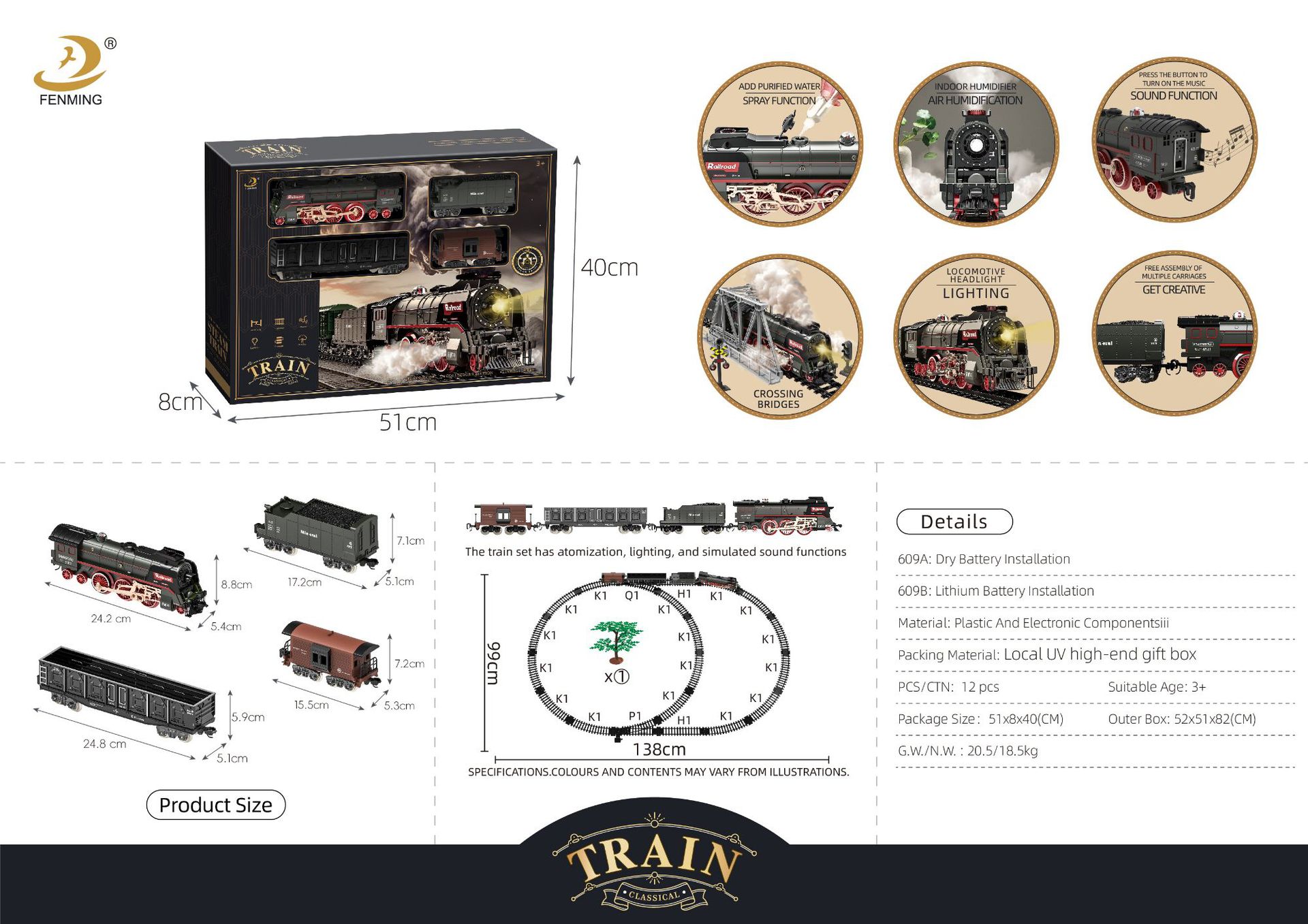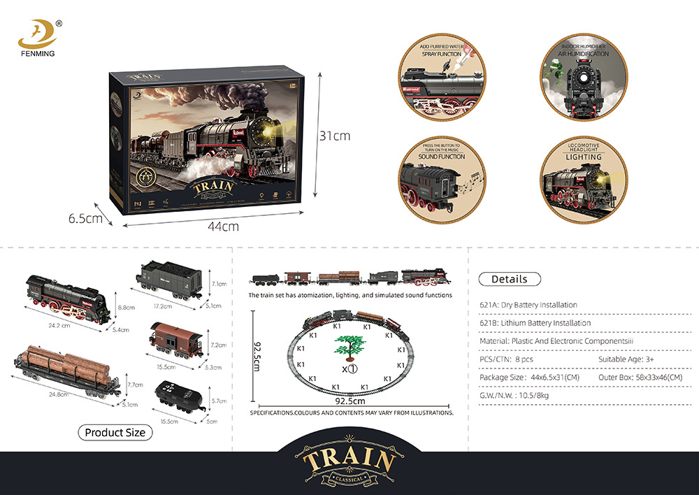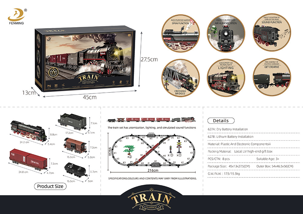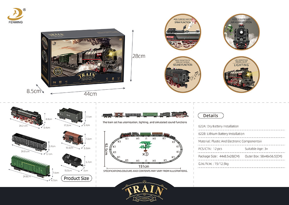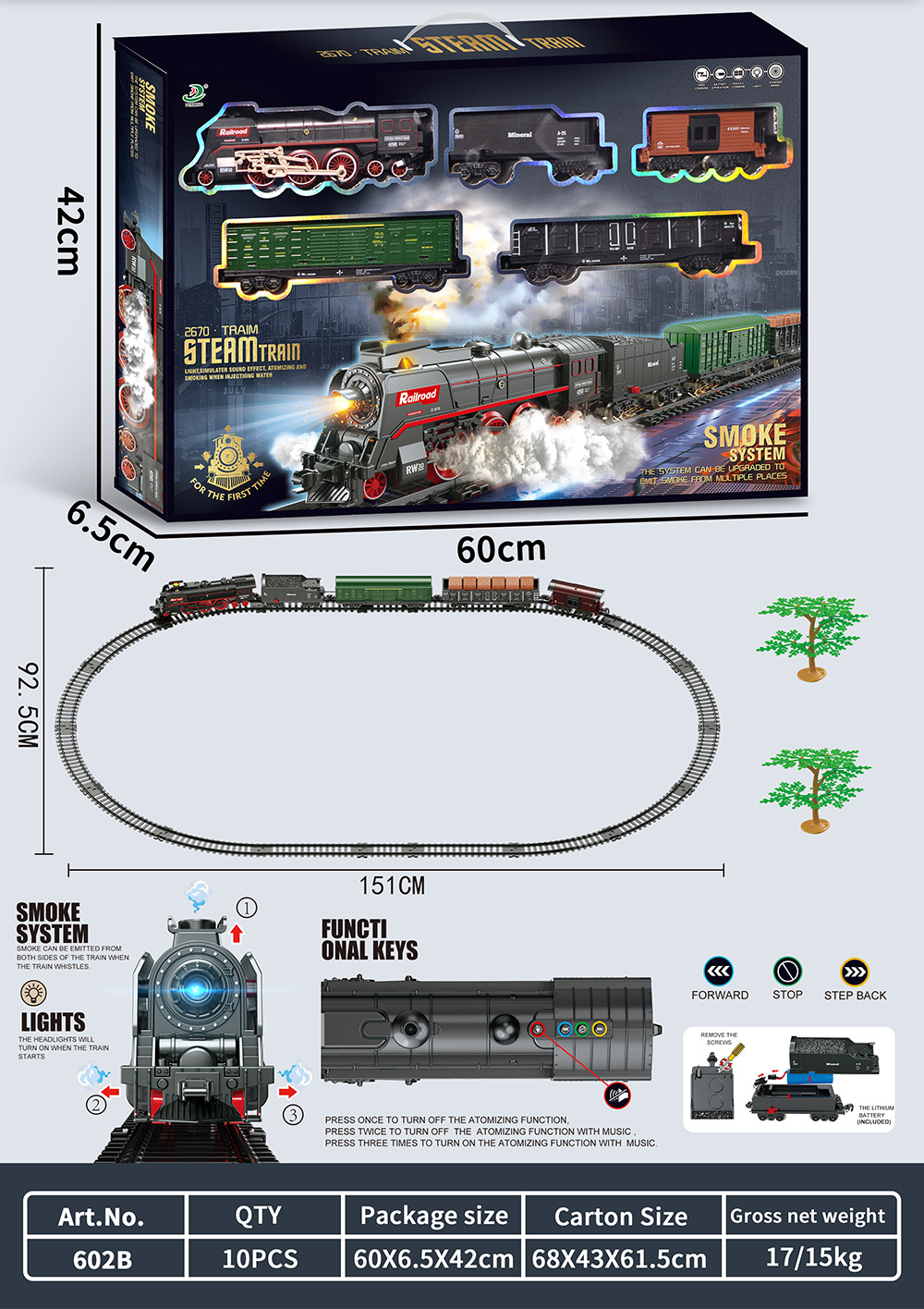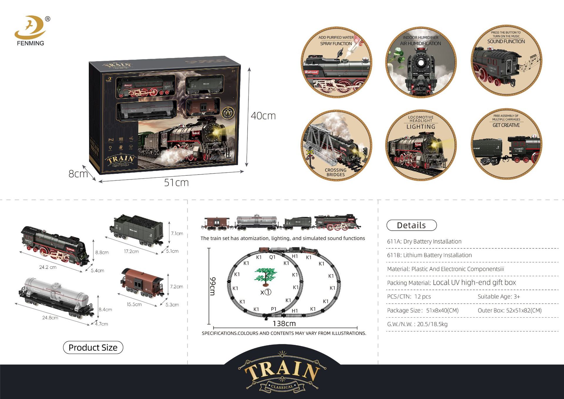 复古蒸汽火车轨道,3处蒸汽喷雾/2处灯光/电动遥/前进后退,仿真蒸汽鸣笛声音,DIY拼接轨道,锂电池车厢的配置,支持定制遥控配置和电动配置