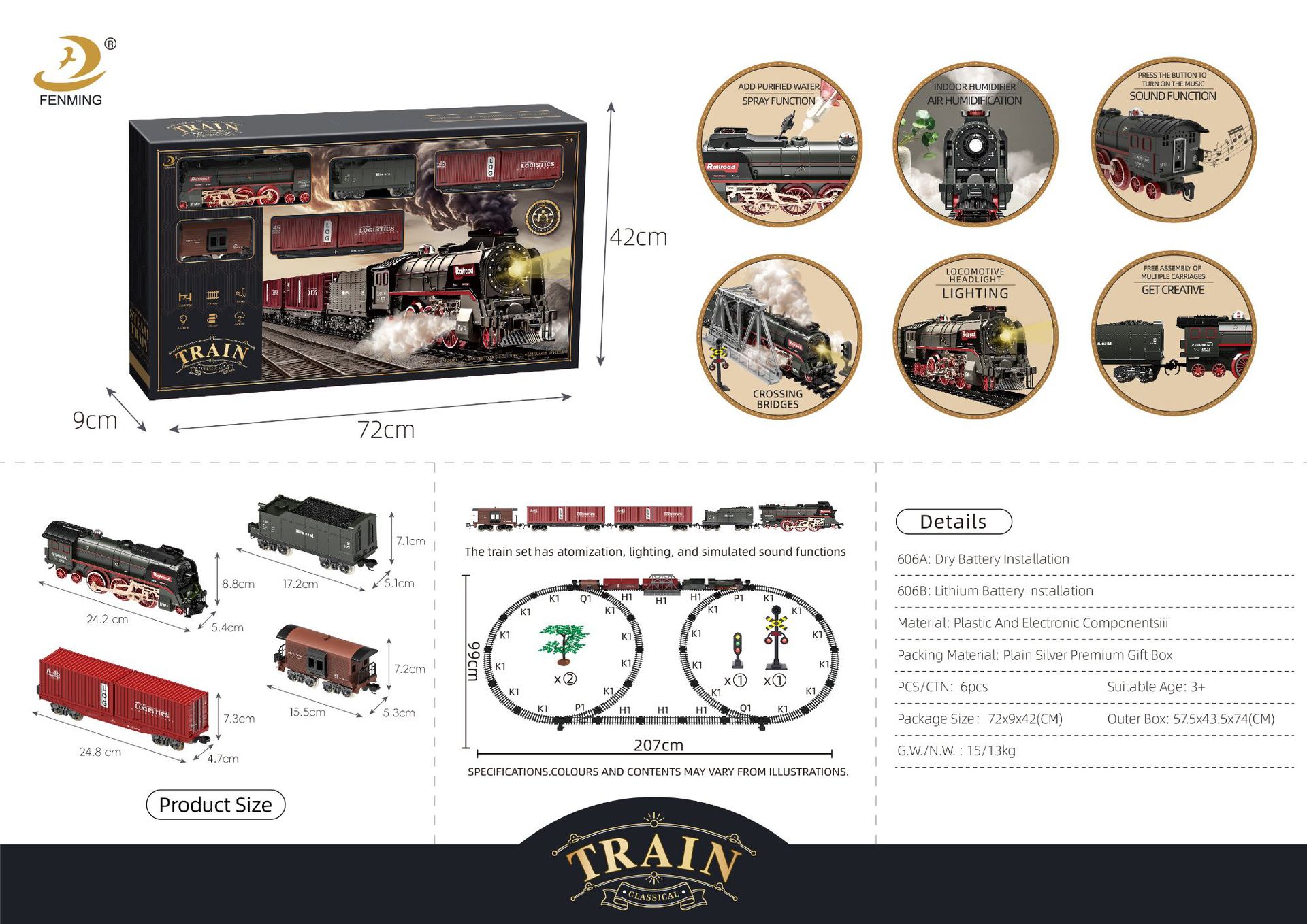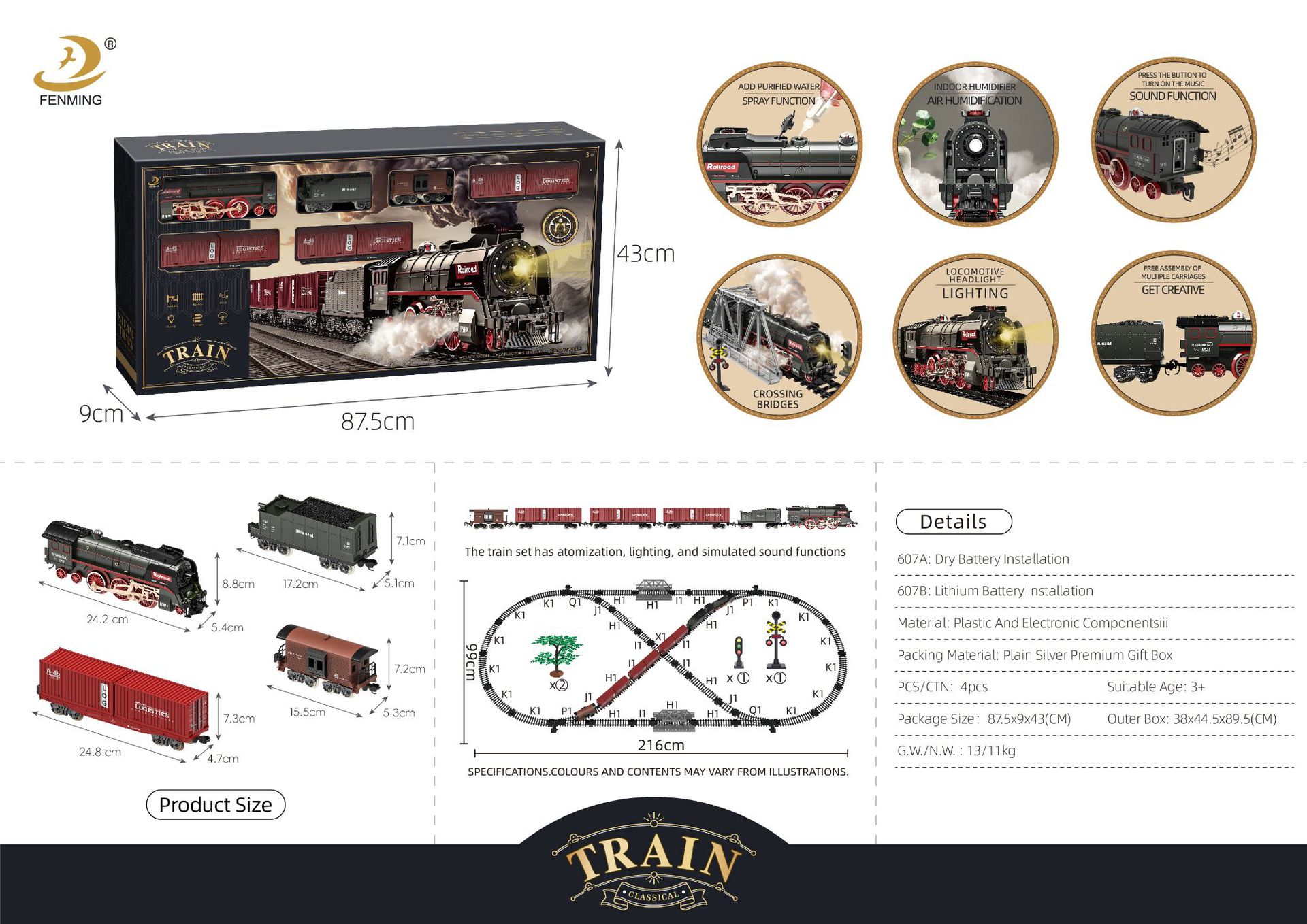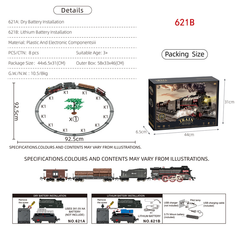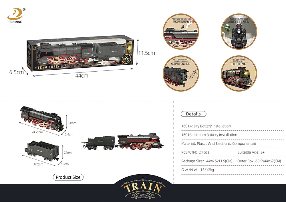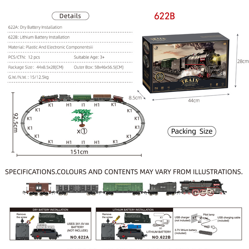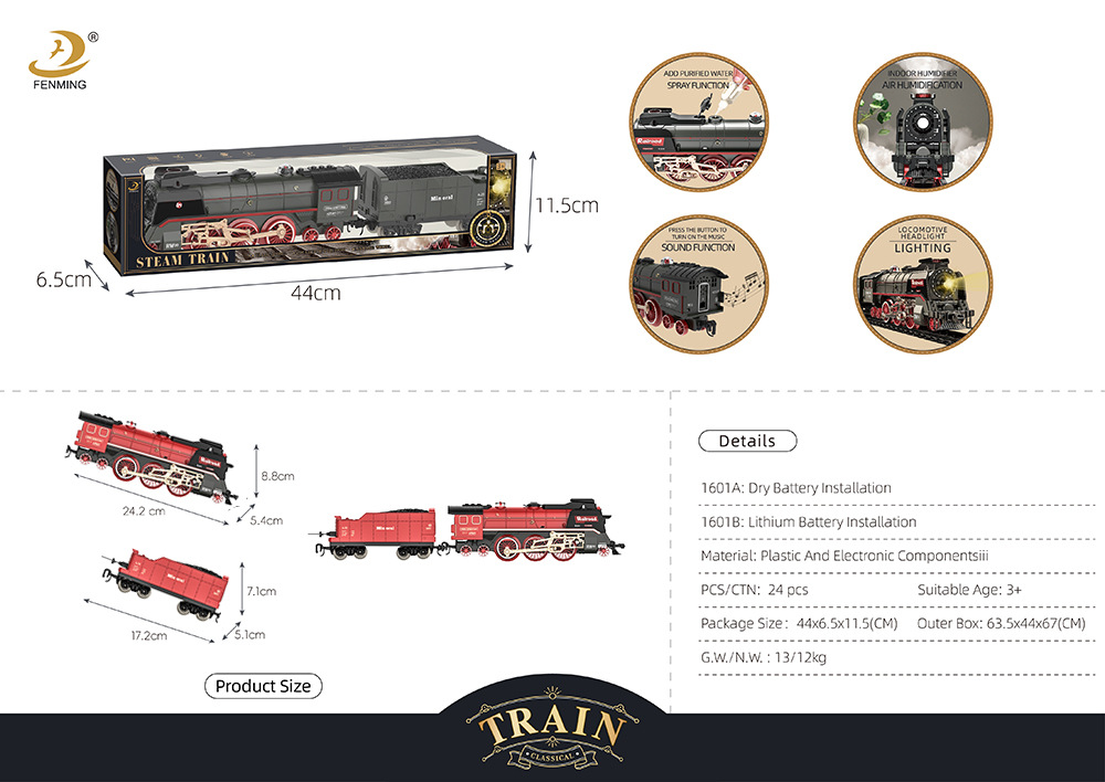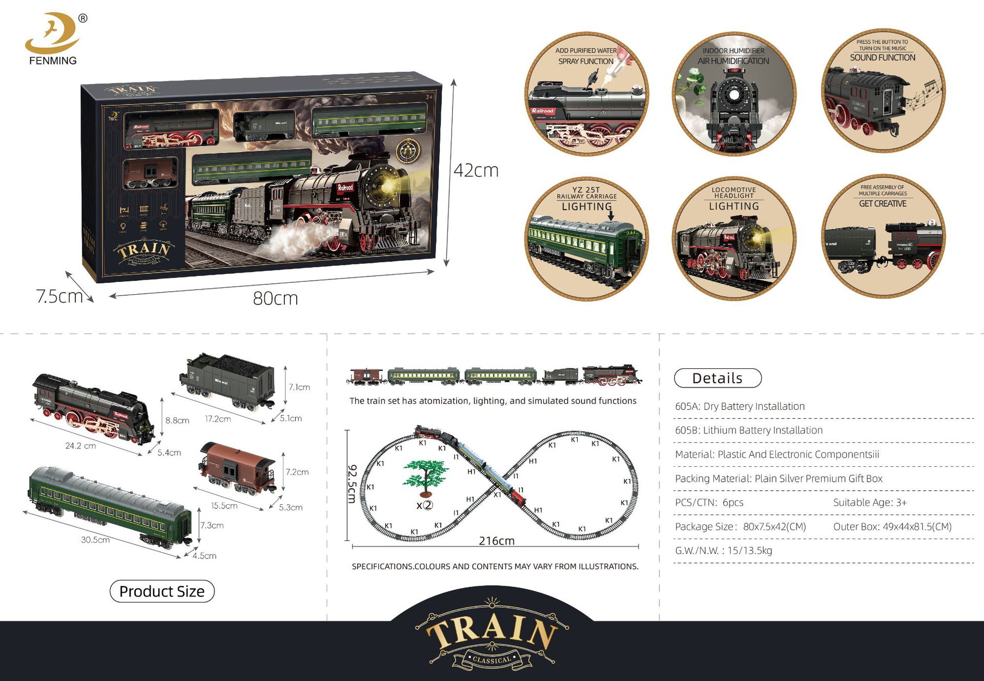 复古蒸汽火车轨道,3处蒸汽喷雾/2处灯光/电动遥/前进后退,仿真蒸汽鸣笛声音,DIY拼接轨道,锂电池车厢的配置,支持定制遥控配置和电动配置