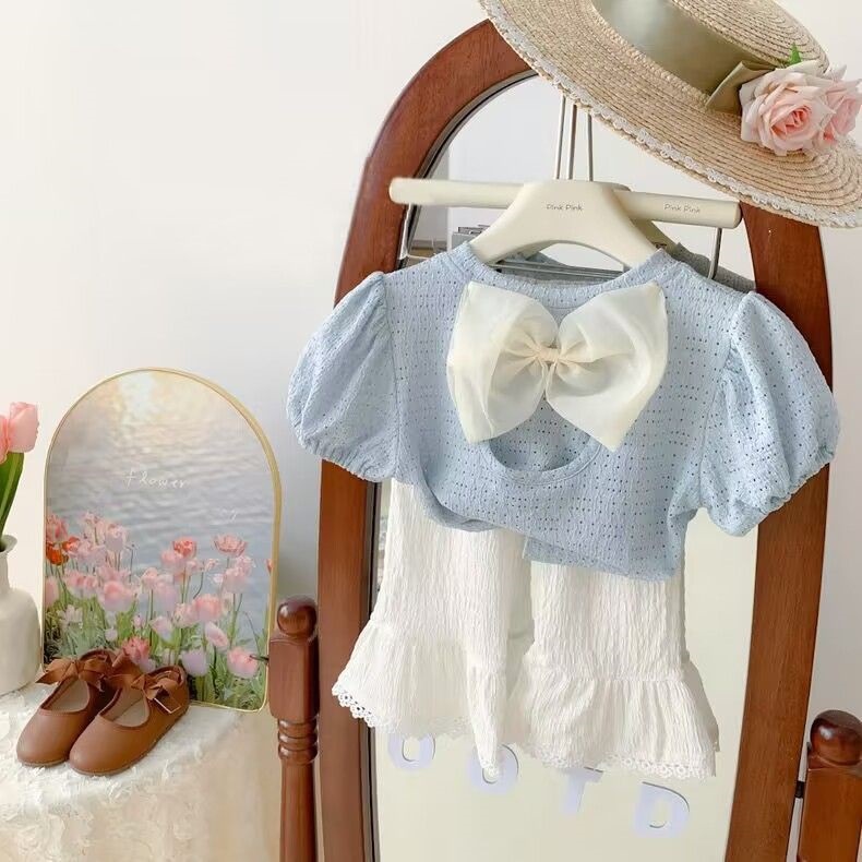 여아 여름 정장 새로운 스타일 여아용 101.25kg 피스 세트 여아용 세련된 백리스 반팔 스포츠 아동복스토어 가기