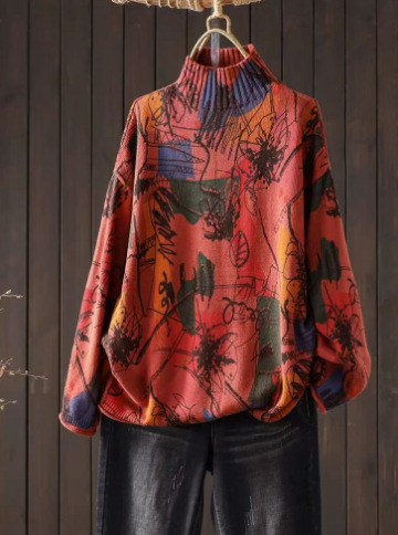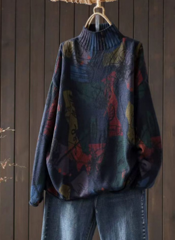 가을 새로운 수직 칼라 터틀넥 바느질 긴팔 느슨한 스웨터 디지털 인쇄 면화 니트 스웨터 여성용스토어 가기