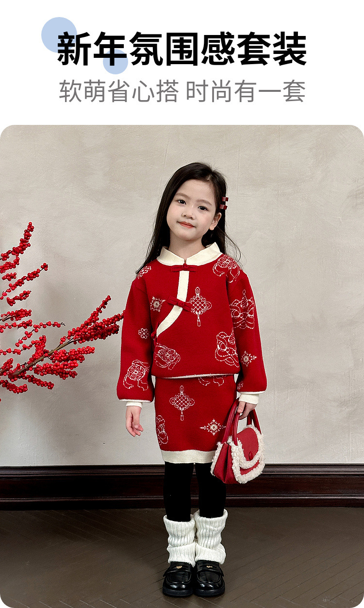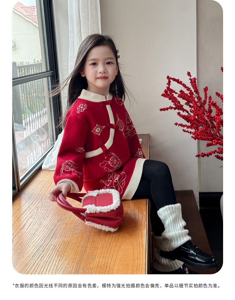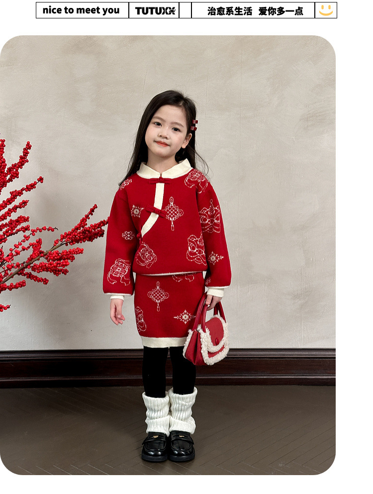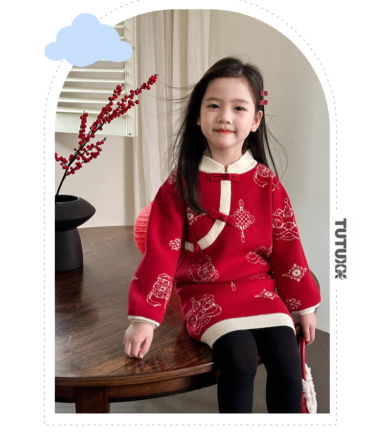 투투 코끼리 소녀의 새해 복 2024 겨울 새 어린이 의류 니트 스웨터 아기의 붉은 신년 의류 투피스 세트스토어 가기