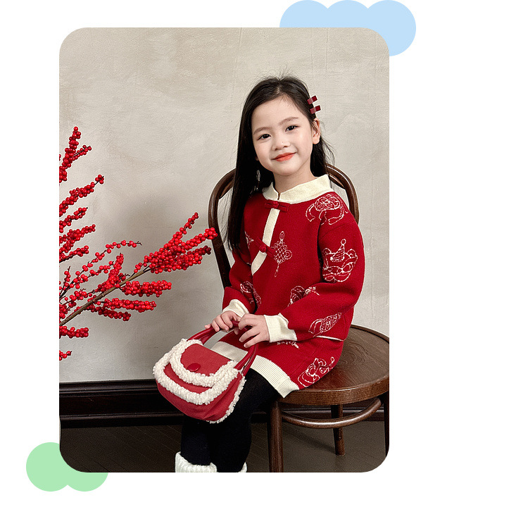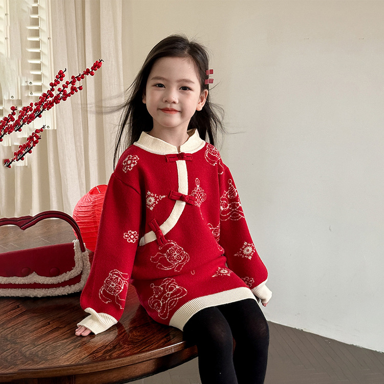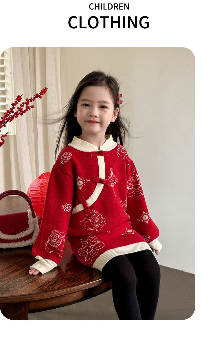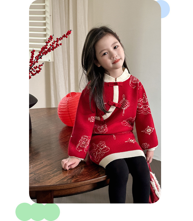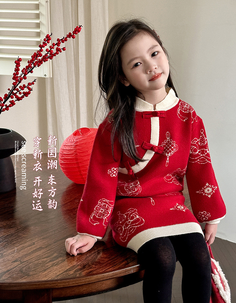 투투 코끼리 소녀의 새해 복 2024 겨울 새 어린이 의류 니트 스웨터 아기의 붉은 신년 의류 투피스 세트스토어 가기