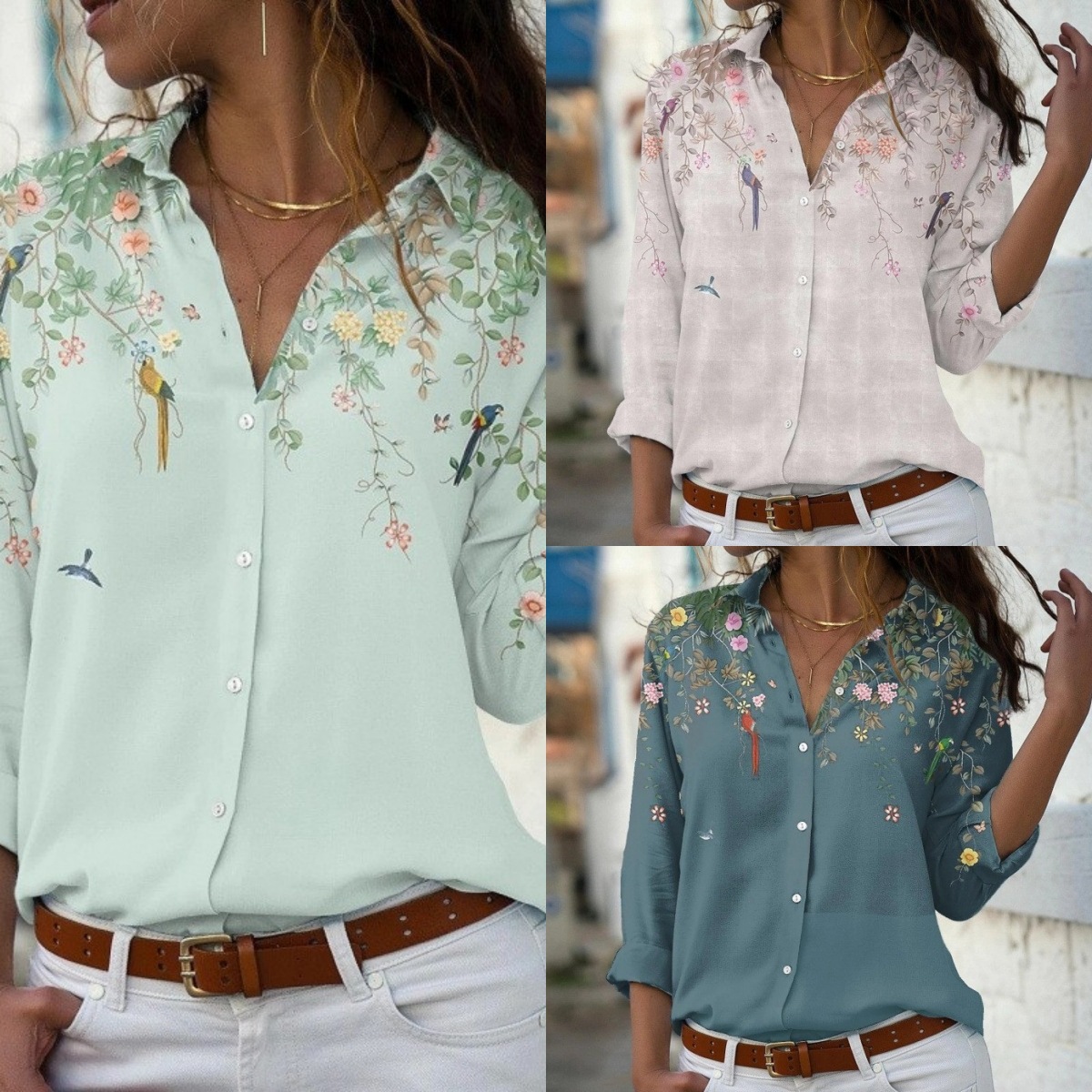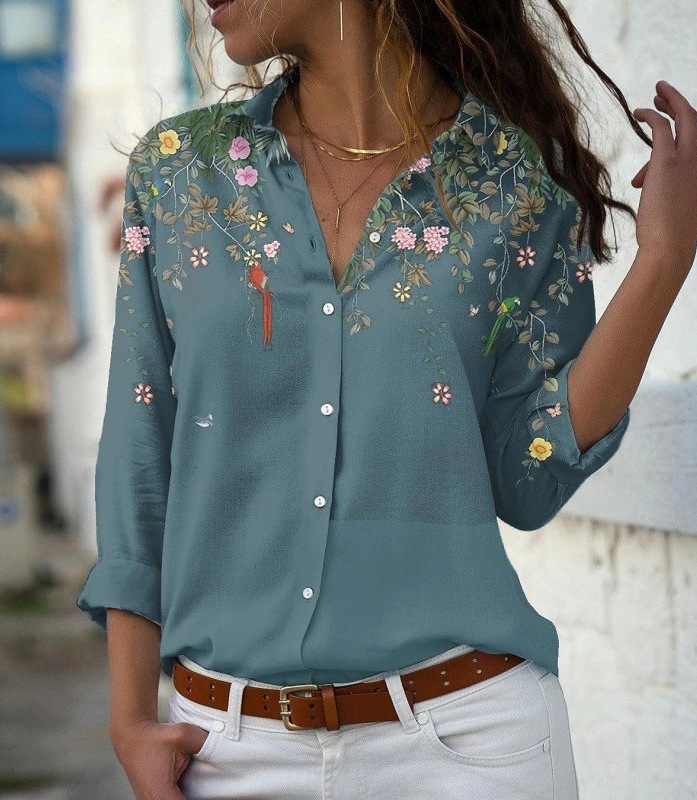 재고 유럽과 미국의 대외 무역 아마존 여성의 느슨한 랩 긴 소매 싱글 브레스트 셔츠 우아한 숙녀 인쇄 탑스토어 가기