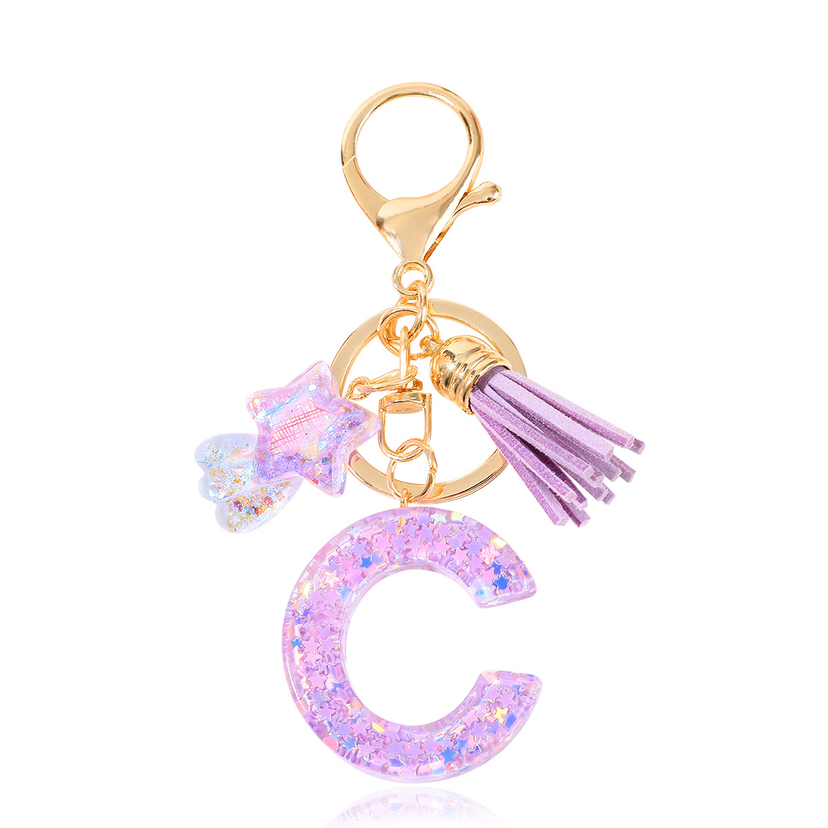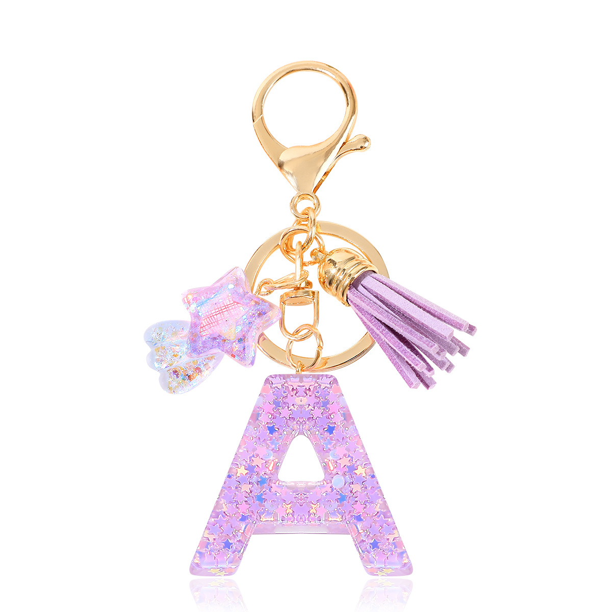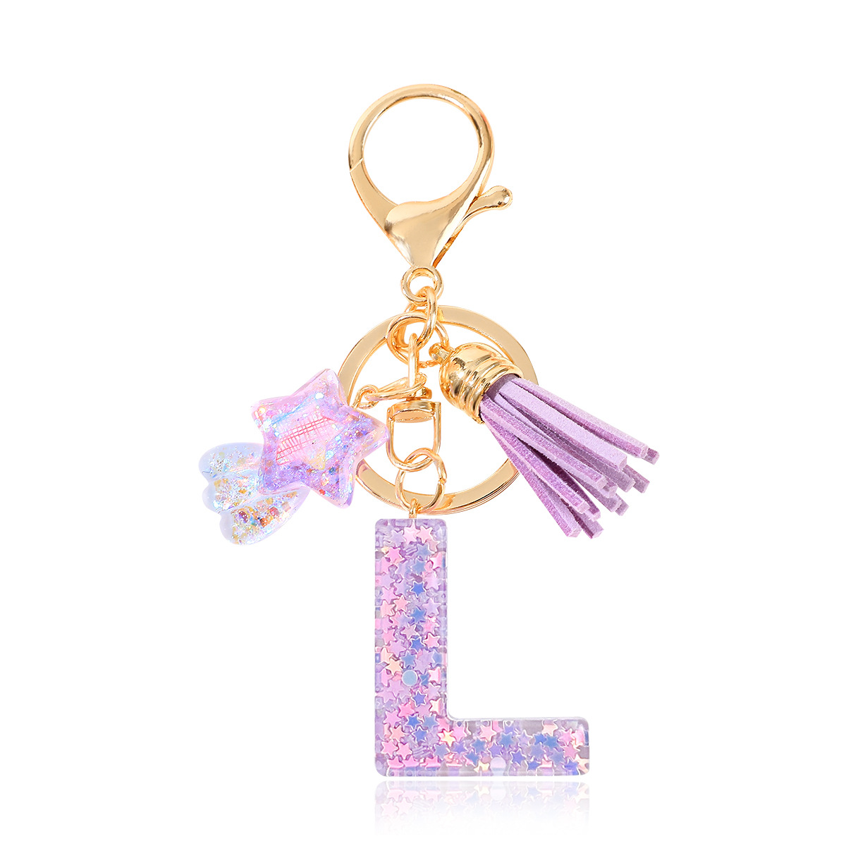 새로운 패션 퍼플 레터 키체인 별 모양 스팽글 별 모양 테슬 크리스탈 드롭 젤 펜던트 여성용 키체인스토어 가기