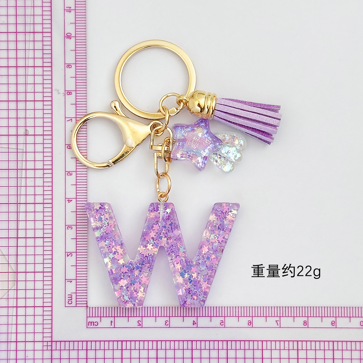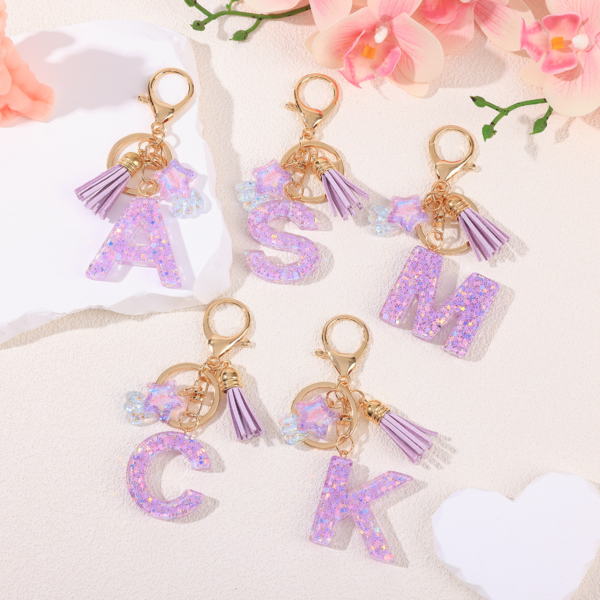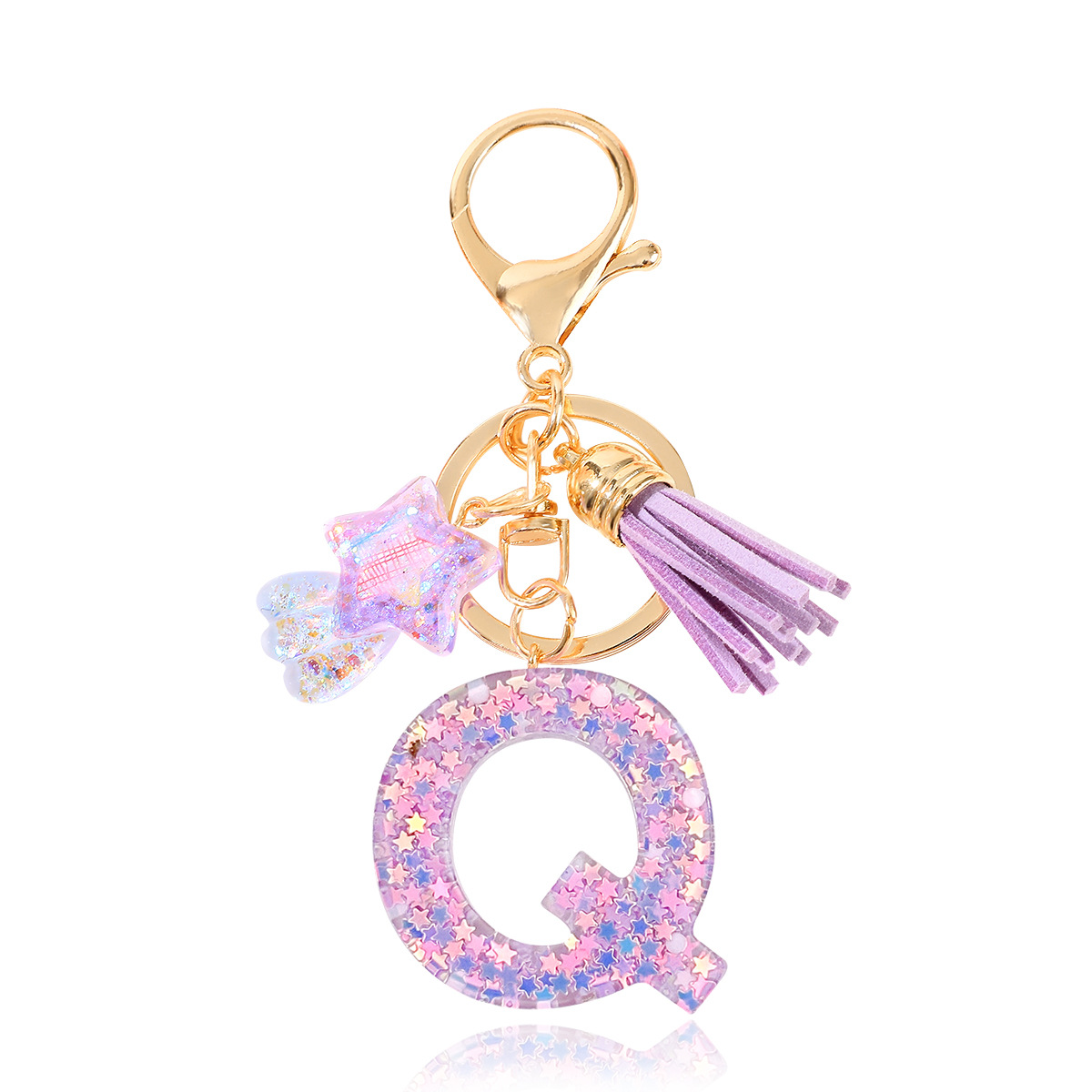 새로운 패션 퍼플 레터 키체인 별 모양 스팽글 별 모양 테슬 크리스탈 드롭 젤 펜던트 여성용 키체인스토어 가기