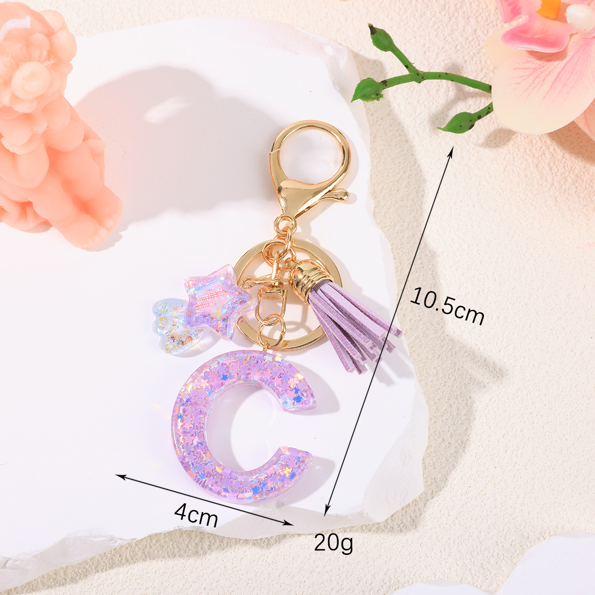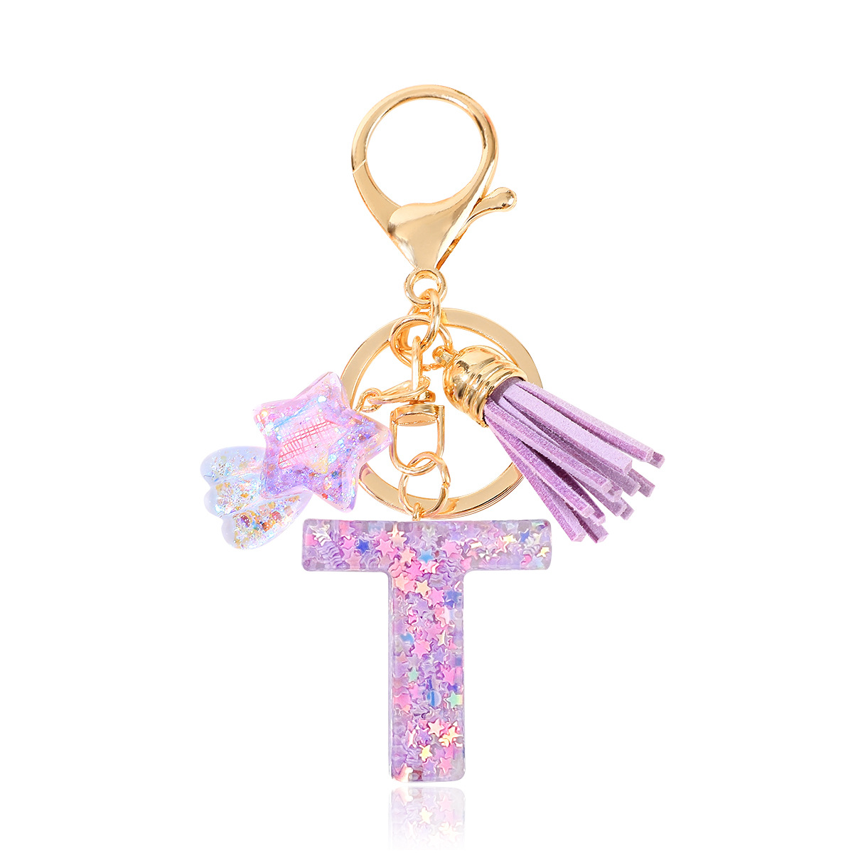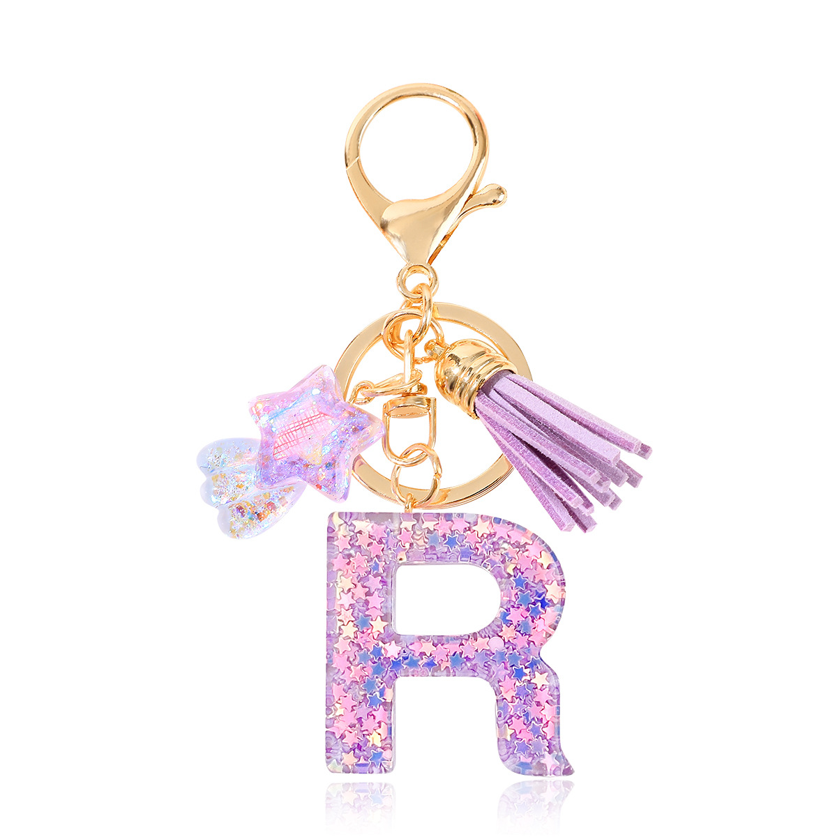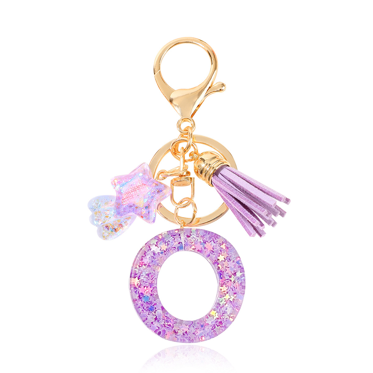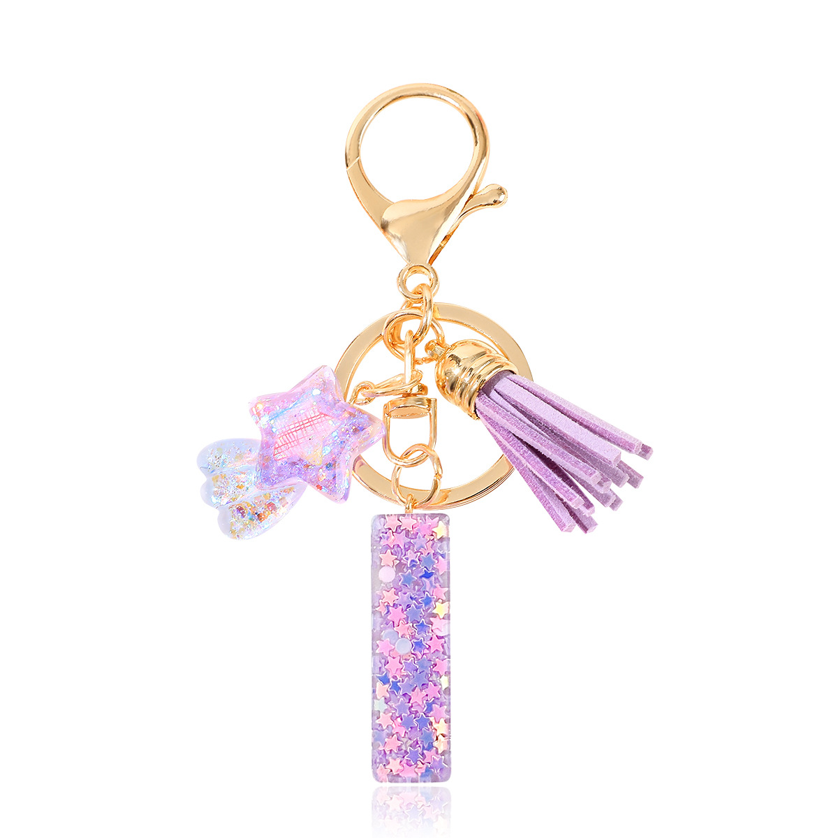새로운 패션 퍼플 레터 키체인 별 모양 스팽글 별 모양 테슬 크리스탈 드롭 젤 펜던트 여성용 키체인