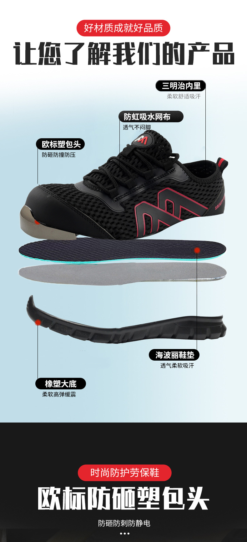 국경 간 정전기 방지 캐주얼 노동 보호 신발 스매싱 방지 및 피어싱 방지 경량 통기성 안전 플라스틱 발가락 보호 신발