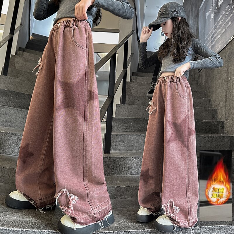 소녀 기모 청바지 2024 새로운 가을과 겨울 착용 어린이 두꺼운 스트레이트 팬츠 소녀 한국식 와이드 레그 팬츠 트렌디
